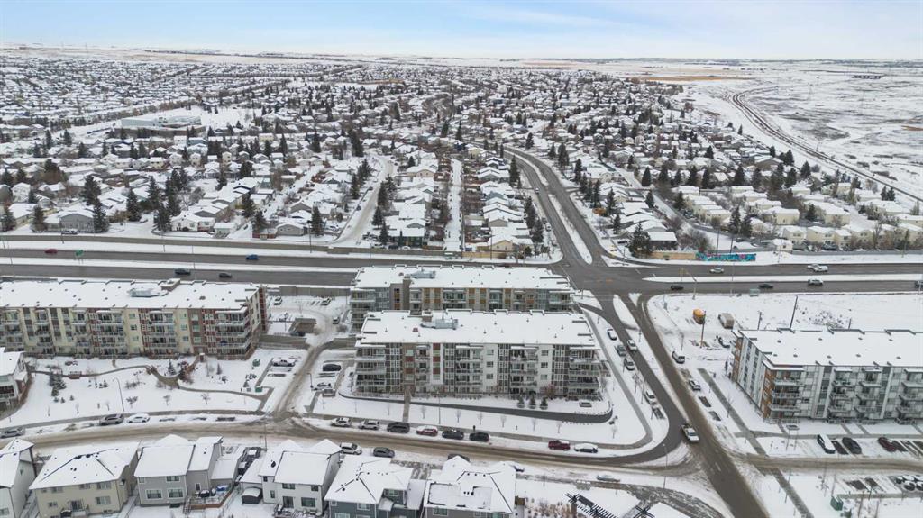 Step into comfort, style, and elevated living in this beautiful 2-bed, 2-bath condo in The Rise at The Parks of Harvest Hills. Built by Cedarglen Homes, and lovingly maintained by its original owners, this home stands out with premium upgrades and central AC for year-round comfort. From the moment you arrive, pride of ownership is evident. The welcoming entry leads into a bright, modern kitchen that makes both everyday cooking and hosting feel special. Featuring a large island with seating, quartz countertops, stainless steel appliances, and a stylish chevron tile backsplash that create a high-end look and feel. Plenty of cabinetry and a pantry give you the storage every homeowner wants without sacrificing clean, contemporary design. Luxury vinyl plank flooring runs throughout the main living spaces for durability and a modern finish. In the dining area, the builder-upgraded built-in adds character and practical storage, making entertaining effortless. The spacious living room has the perfect layout for relaxing, movie nights, or hosting game night with friends. Slide open the patio doors to your oversized private balcony. With room to lounge or dine, built-in exterior lighting, and a BBQ gas line ready to go, this becomes an outdoor extension of your home that you will love from morning coffee to summer evenings. The primary bedroom is tucked away on its own side of the home for privacy and peace. There is plenty of space for a king-sized bed and additional furniture, while the walk-in closet features custom built-ins designed to keep life organized. The 4-piece ensuite is bright, fresh, and calming. It feels like your own personal retreat at the end of a long day. Across the unit, the second bedroom offers flexibility for guests, a roommate, a nursery, or the perfect work-from-home office. The adjacent 3-piece bathroom includes a full-size walk-in shower with upgraded fixtures for a sleek and modern finish. Back near the entry, the laundry room truly sets this home apart. Builder-installed upper cabinets and extra shelving ensure everything has a place and stays clutter-free. A luxury rarely found in condo living. This space also doubles as your front closet with plenty of room for shoes and jackets. Your titled underground parking stall is conveniently just steps from the elevator, making grocery runs effortless. An assigned storage locker and secure bike storage are also included on the same lower level, giving you even more room for the things you love. You are perfectly positioned here. Minutes from the airport, close to Deerfoot and Stoney Trail, and a short stroll to restaurants, local shops, Landmark Cinemas, parks, tennis courts, and schools. Convenience and comfort come together seamlessly. Whether you are downsizing, investing, or purchasing your first home, this upgraded condo offers a level of quality and lifestyle that truly stands out. Welcome home to The Rise at The Parks of Harvest Hills.