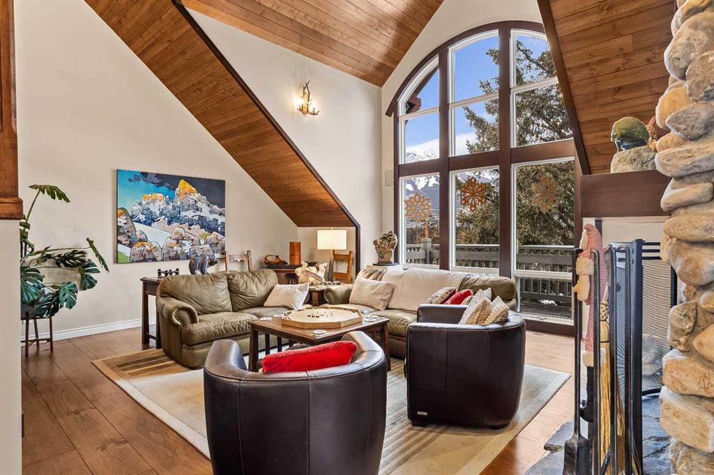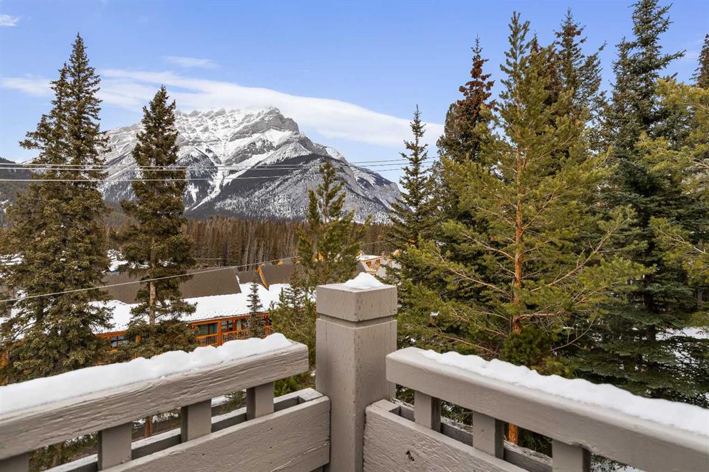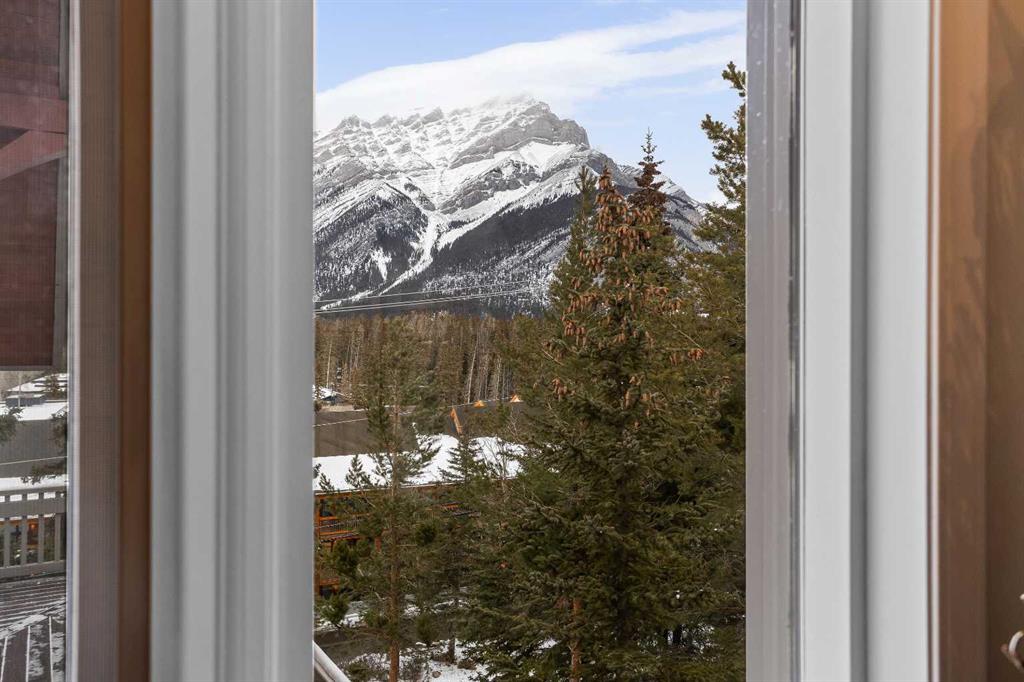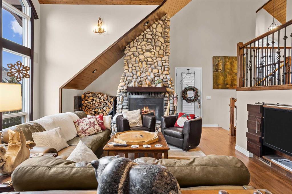 Luxurious End Unit Townhome in Exclusive Banff Neighbourhood - Tatanga Ridge I ! This spacious, 2,716 sq.ft. alpine styled three bedroom plus den home stands in a class of its own – offering a level of finish, charm and functionality unmatched by anything currently on the market. Tastefully upgraded from top to bottom, the home welcomes you on the main level with a large sunny south facing balcony with massive windows that flood the interior with natural light. At the heart of this level is a dream kitchen with granite countertops, undermount sink, brick backsplash, oversized Miele gas range, custom hood fan, and stainless fridge with French doors. This level is accentuated with beautiful slate flooring and custom lighting and includes the dining area, home office, powder room and roomy foyer. Striking vaulted ceilings, clad in rich tongue and groove pine planks and accentuated with prominent timber beams guide you down to an airy and warm living room with a floor to ceiling river rock wood burning fireplace, a cozy alpine feature. Grand windows and a wrap around deck capture incredible views of Norquay and Cascade mountains. Gorgeous wide plank Douglas Fir flooring in the living room and primary bedroom create warmth and comfort. The tranquil primary bedroom comes complete with a slate accented gas fireplace with timber mantle, private deck, and full spa like ensuite bathroom with soaker tub and separate enclosed steam shower. The versatile bonus room/den complete with gas fireplace, custom bar made from west coast Maple with live edge and wine rack offers the perfect setting for movie nights, quiet reading or watching the big game. The lower level consists of two roomy bedrooms, a full bathroom, and separate laundry room. Lastly, for all your mountain toys there is a large attached double car garage featuring epoxy-coated flooring and storage for your year-round adventure gear. For added safety a fire smart all metal roof sprinkler system has been installed to protect against possible wildfire. This home has everything you are looking for in a mountain home and more!