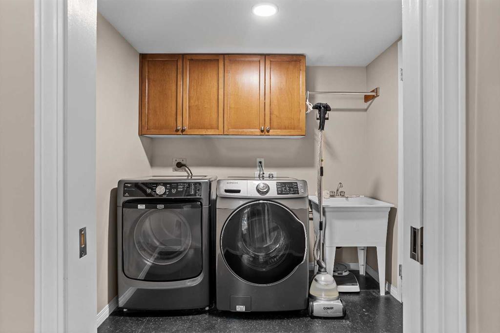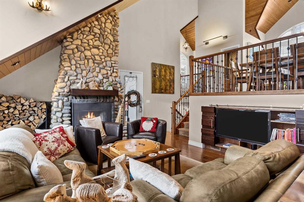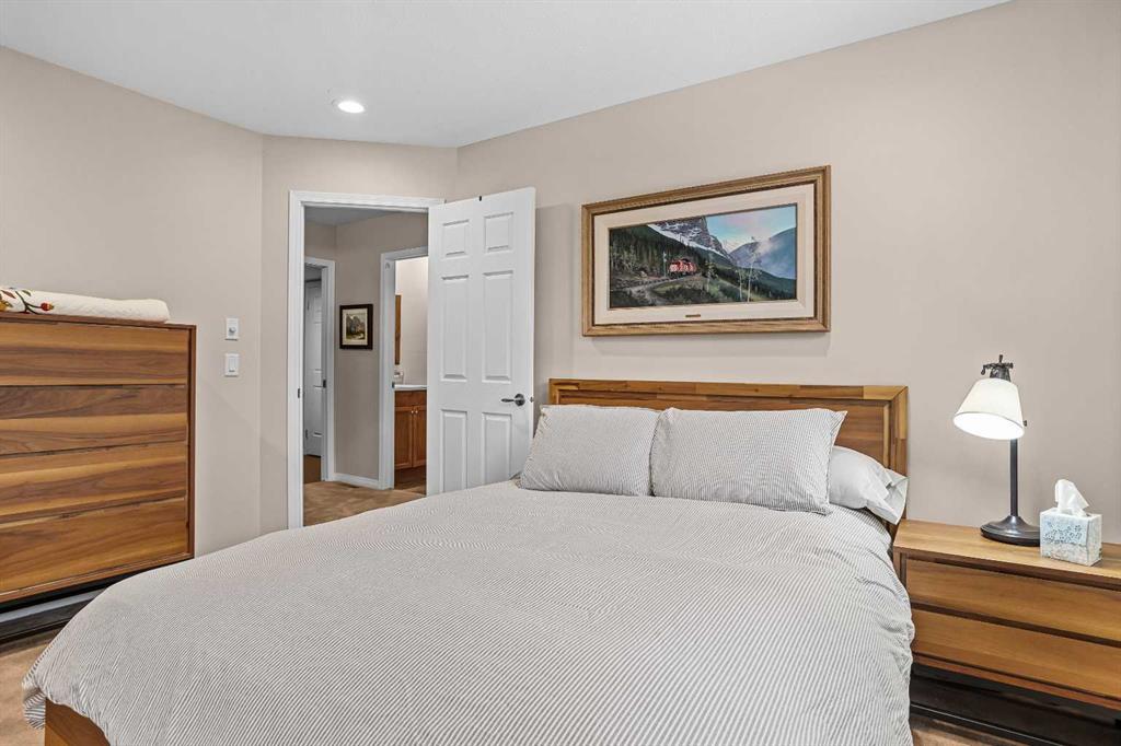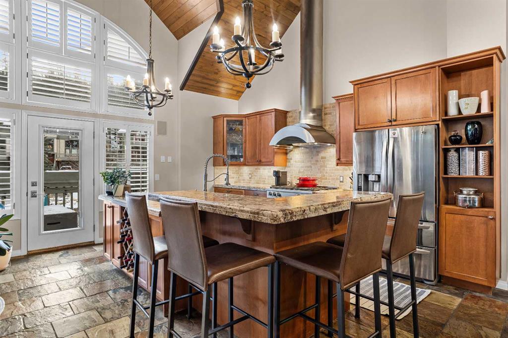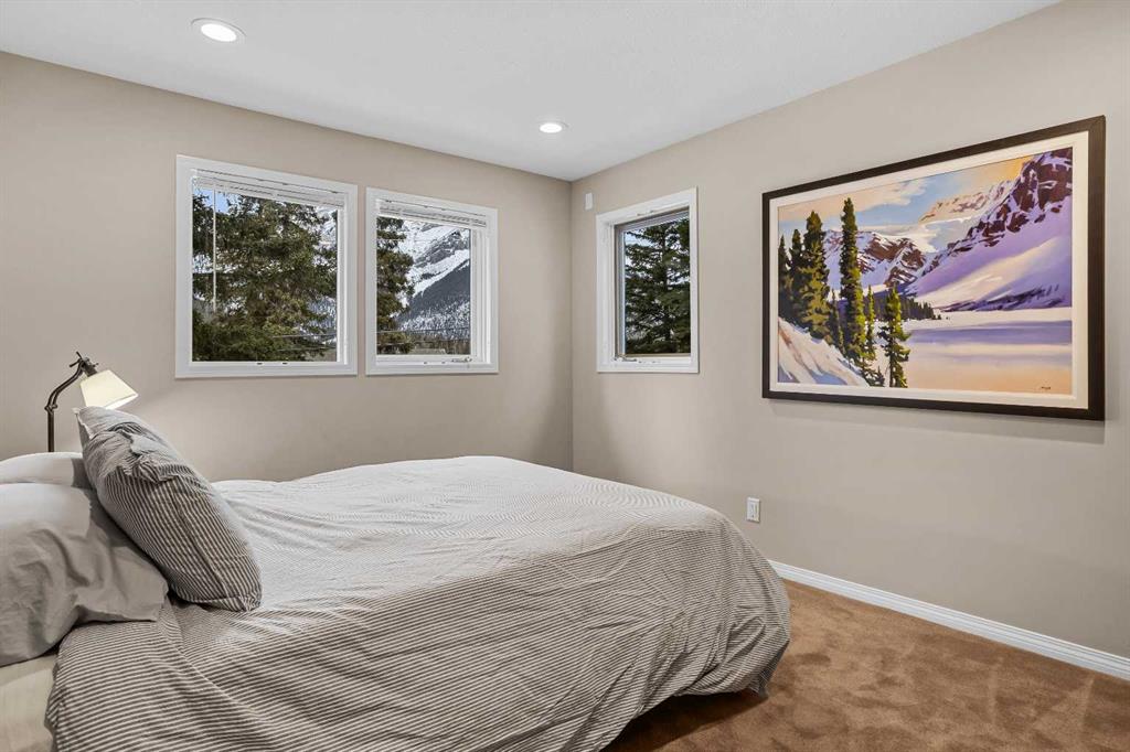 Luxurious End Unit Townhome in Exclusive Banff Neighbourhood - Tatanga Ridge I ! This spacious, 2,716 sq.ft. alpine styled three bedroom plus den home stands in a class of its own – offering a level of finish, charm and functionality unmatched by anything currently on the market. Tastefully upgraded from top to bottom, the home welcomes you on the main level with a large sunny south facing balcony with massive windows that flood the interior with natural light. At the heart of this level is a dream kitchen with granite countertops, undermount sink, brick backsplash, oversized Miele gas range, custom hood fan, and stainless fridge with French doors. This level is accentuated with beautiful slate flooring and custom lighting and includes the dining area, home office, powder room and roomy foyer. Striking vaulted ceilings, clad in rich tongue and groove pine planks and accentuated with prominent timber beams guide you down to an airy and warm living room with a floor to ceiling river rock wood burning fireplace, a cozy alpine feature. Grand windows and a wrap around deck capture incredible views of Norquay and Cascade mountains. Gorgeous wide plank Douglas Fir flooring in the living room and primary bedroom create warmth and comfort. The tranquil primary bedroom comes complete with a slate accented gas fireplace with timber mantle, private deck, and full spa like ensuite bathroom with soaker tub and separate enclosed steam shower. The versatile bonus room/den complete with gas fireplace, custom bar made from west coast Maple with live edge and wine rack offers the perfect setting for movie nights, quiet reading or watching the big game. The lower level consists of two roomy bedrooms, a full bathroom, and separate laundry room. Lastly, for all your mountain toys there is a large attached double car garage featuring epoxy-coated flooring and storage for your year-round adventure gear. For added safety a fire smart all metal roof sprinkler system has been installed to protect against possible wildfire. This home has everything you are looking for in a mountain home and more!