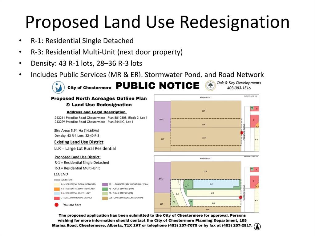 Prime 9.79-Acre Development Opportunity, Paradise Road, Chestermere An exceptional and strategically located 9.79-acre development parcel in the highly desirable North Acreages of Chestermere. This property offers tremendous potential in one of Alberta’s fastest-growing cities, with quick access to Calgary and Highway 1, making it ideal for future residential growth. Currently zoned LLR, Large Lot Rural Residential, the land permits single detached homes, accessory buildings, and agriculture, with discretionary uses such as child-care facilities, B&B operations, community buildings, and places of worship. A land use redesignation is already underway, proposing: • R-1 Residential Single Detached: 43 lots • R-3 Residential Multi-Unit on the adjacent parcel • Integrated Municipal Reserve (MR), Environmental Reserve (ER), internal roads, and a stormwater management pond This parcel is development-ready, with substantial due diligence already completed, including: • Planning & surveying • Engineering and Transportation Impact Assessment • Biophysical & geotechnical studies • Wetland assessment • Water and wastewater system assessment for servicing connections The property also features a well-maintained 4-bedroom, 2-bathroom bungalow, outbuildings, a water well, and septic system, allowing interim rental or owner use during the planning phase. The land is flat, fully fenced, east-facing, and offers scenic creek views at the rear. With strong housing demand and significant municipal growth, this 9.79-acre site presents a rare, high-ROI opportunity for developers and investors looking to secure a prime piece of Chestermere’s future.