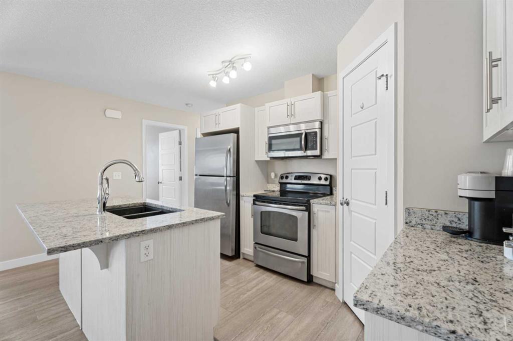 Located in the Chinook Crossing complex in Prairie Springs, this 2 bedroom, 2 bathroom stacked townhouse offers low-maintenance living with an upscale feel perfectly positioned beside Chinook Winds Regional Park. A private entry leads up to a bright, open-concept main level with a comfortable living area and a stylish kitchen featuring white cabinetry, stainless steel appliances, a corner pantry, and a centre island with breakfast bar, as well as plenty of space to style a dining area to suit your lifestyle. The full 4-piece bathroom serves the main living space and has direct access to the second bedroom, while the primary bedroom is tucked at the back with its own 3-piece ensuite and generous walk-in closet. In-suite laundry and extra storage keep daily living streamlined. Outside, you’re within walking distance of Chinook Winds Regional Park—with its spray park, playgrounds, sports fields, skate park, and pathways—and just a short drive to tennis courts, schools, shopping, restaurants, and major routes like Yankee Valley Boulevard and the QEII, creating a refined yet functional home base in SW Airdrie.
