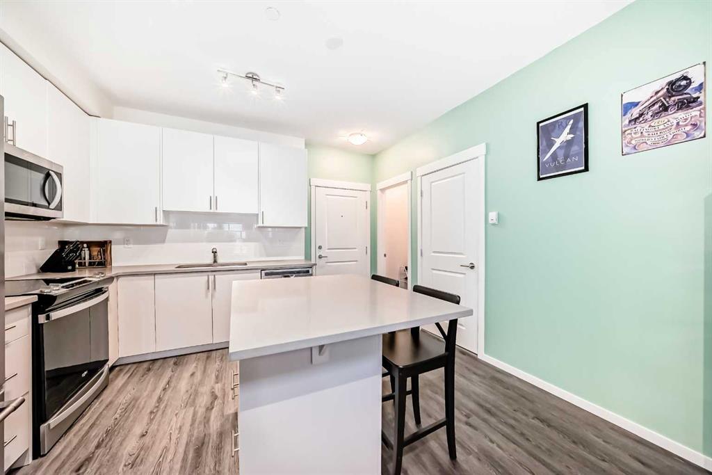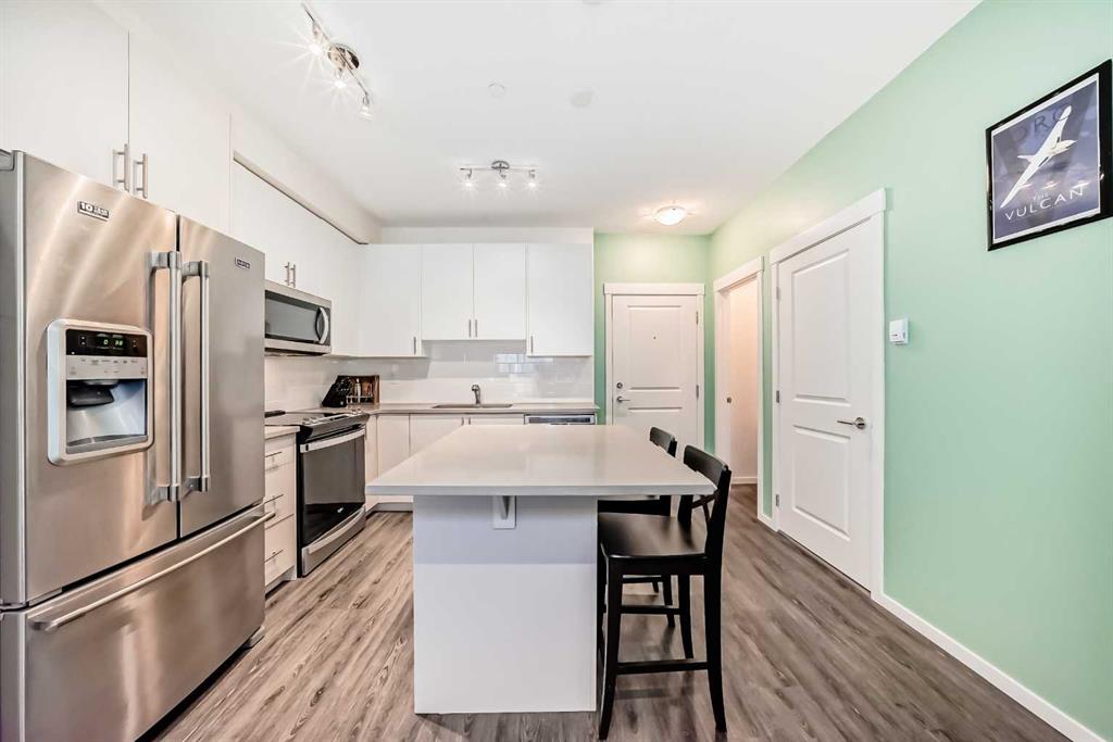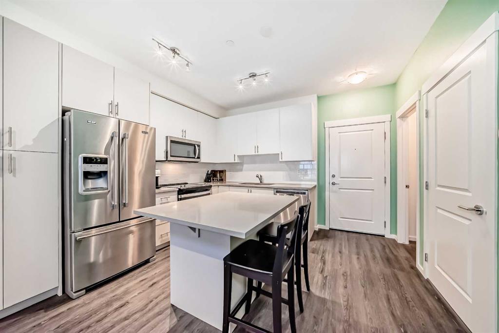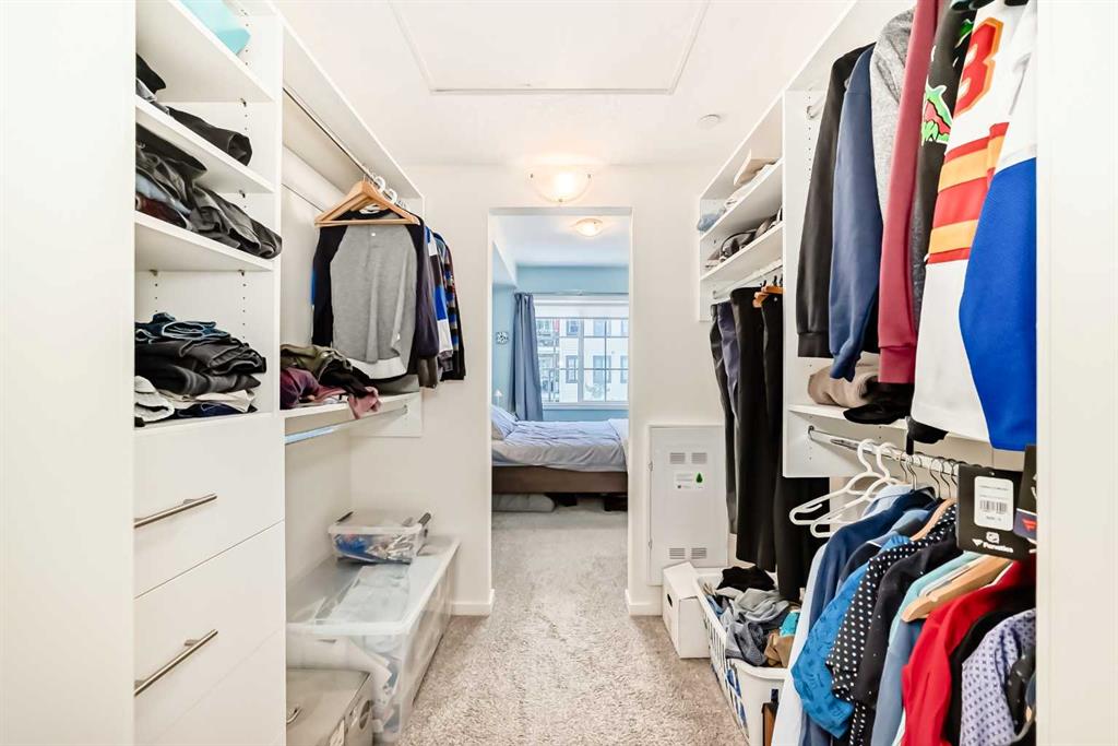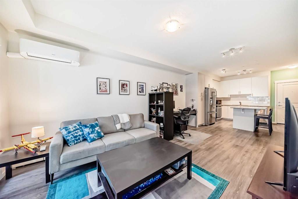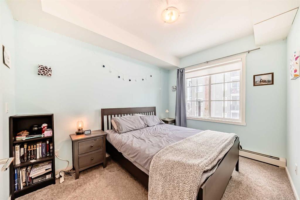 Welcome to Legacy Park II, Building 8000. Built by Brad Remington Homes, this oversized, bright, and tastefully designed 1-bedroom, 1-bath condo offers more than 600 sq. ft. of open, comfortable living space. A modern kitchen features quartz countertops, premium soft-close cabinetry, stainless steel appliances, and clean, stylish finishes. The living area extends onto a private balcony—complete with a BBQ gas line—making it the ideal spot for morning coffee or evening relaxation. The spacious primary bedroom features large, light-filled window and a convenient walk-through closet with built-in cabinetry. An in-suite laundry room provides added functionality, with extra space available for future shelving. Additional perks include air conditioning (AC), titled underground parking, and a dedicated storage unit. Thoughtfully built with 9 ft. ceilings, knockdown ceiling texture, plush stain-guard carpeting, engineered floor and wall systems for superior sound attenuation, high-performance low-e windows, and a timeless exterior of brick and premium siding, this home blends comfort with quality craftsmanship. Perfectly located just steps from a full shopping plaza with groceries, dining, gas, and everyday essentials, this condo offers simple, stress-free city living. Ideal for first-time buyers, downsizers, or investors—this is a home that truly has it all. Book your showing today and experience why it’s anything but ordinary.