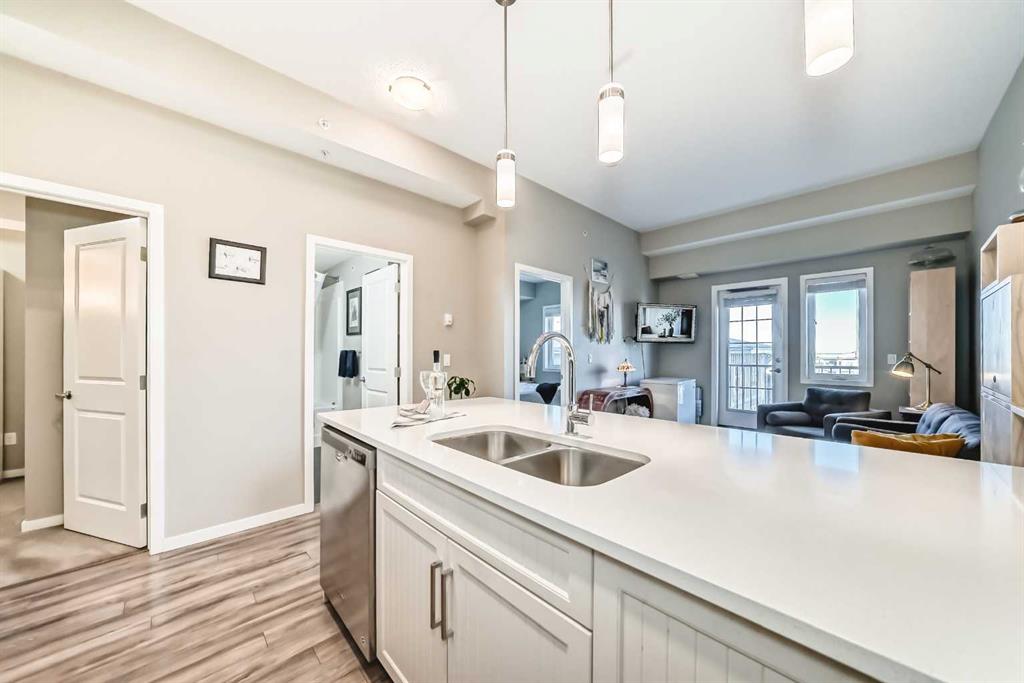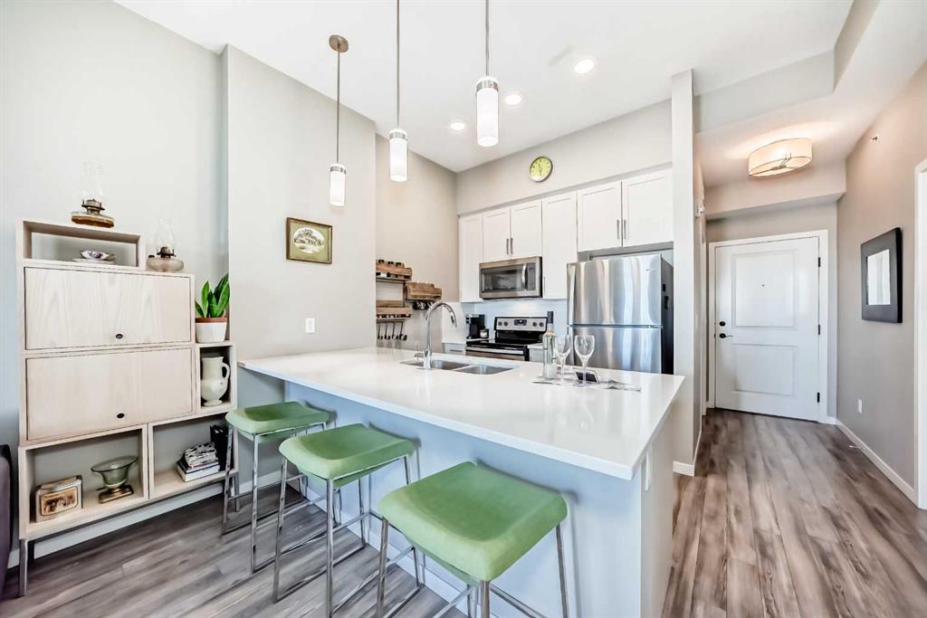 Experience the timeless charm of Voysey Arts and Crafts Old English Architecture in this impeccably maintained, one-owner TOP FLOOR unit—filled with warmth and natural sunlight—located in a well-managed complex in the highly sought-after lake community of Mahogany. This bright two-bedroom home features a 4-piece bathroom, a cozy living room, a bright kitchen, and a private balcony with a gas hook-up overlooking the park. Being on the top floor, it is perfectly positioned away from street noise and traffic. Enjoy a fresh, modern open-concept design with white ceiling-height kitchen cabinets, QUARTZ countertops with a breakfast bar, and neutral laminate flooring for easy maintenance. For added convenience, the in-suite storage and laundry room come equipped with a washer and dryer. The heated underground parkade includes a titled indoor parking stall and an assigned storage unit. The complex also offers excellent amenities such as a fitness centre, guest suite, library, bike storage, and beautiful outdoor gathering spaces for the summer months. Mahogany provides exceptional lifestyle perks: grocery stores, dining, cafés, parks, and pathways all nearby. You’ll also enjoy access to a freshwater lake with a beach club and be within walking distance of 30 hectares of protected natural wetlands. Whether you're looking for a great investment property or a place to call home, this unit is priced to sell in one of Calgary’s most desirable lake communities.