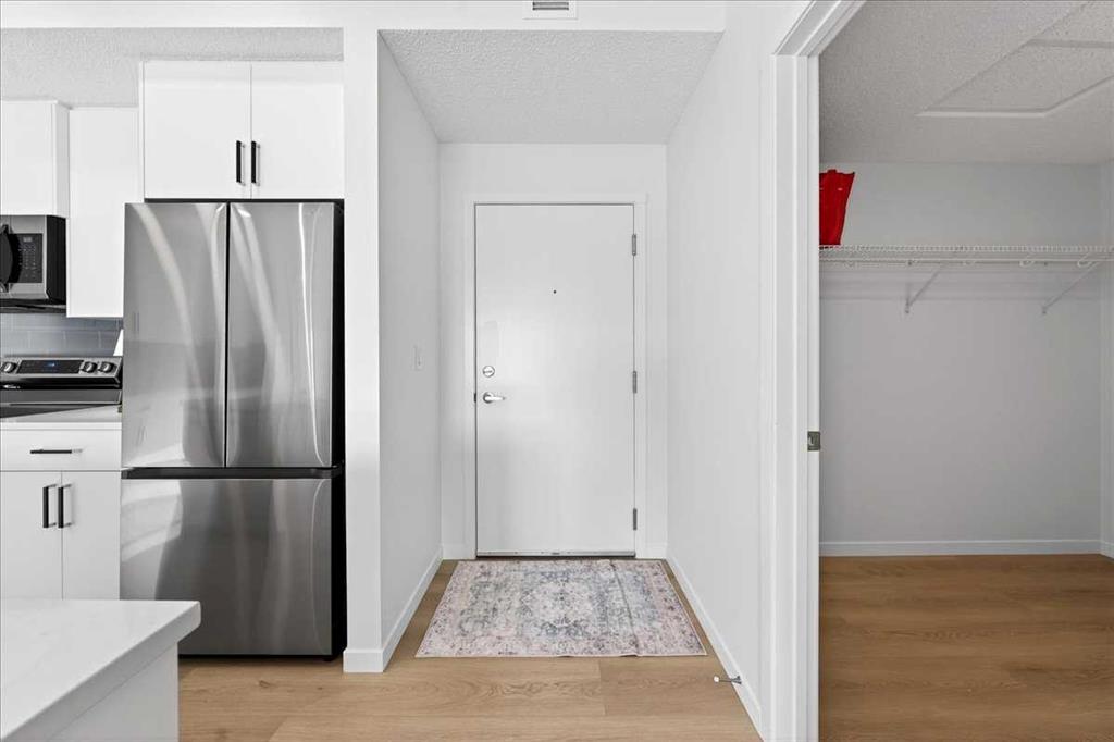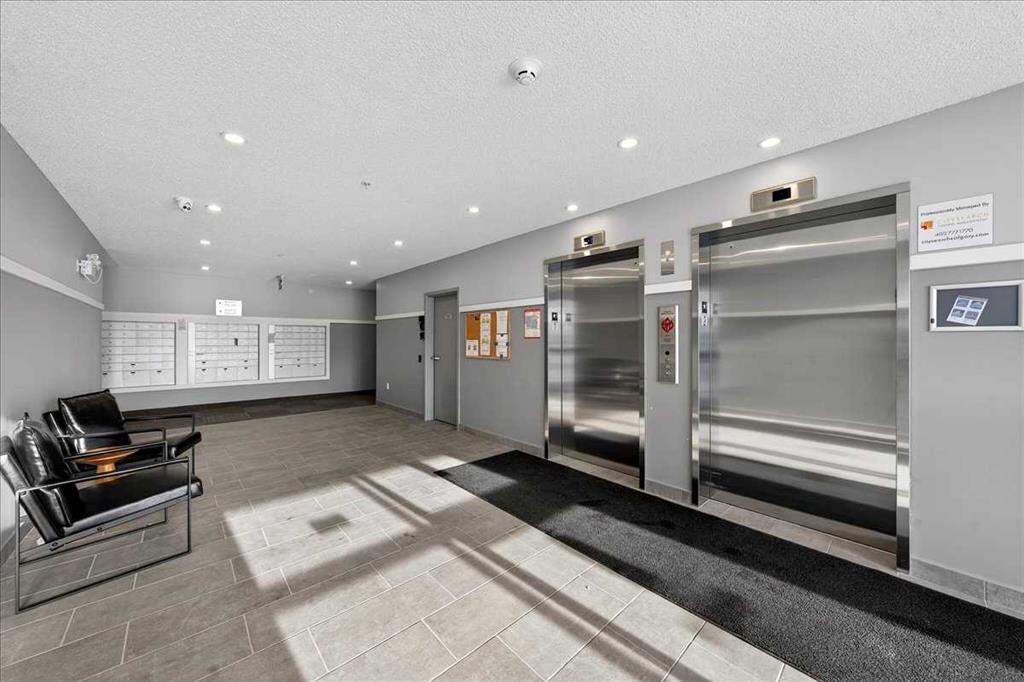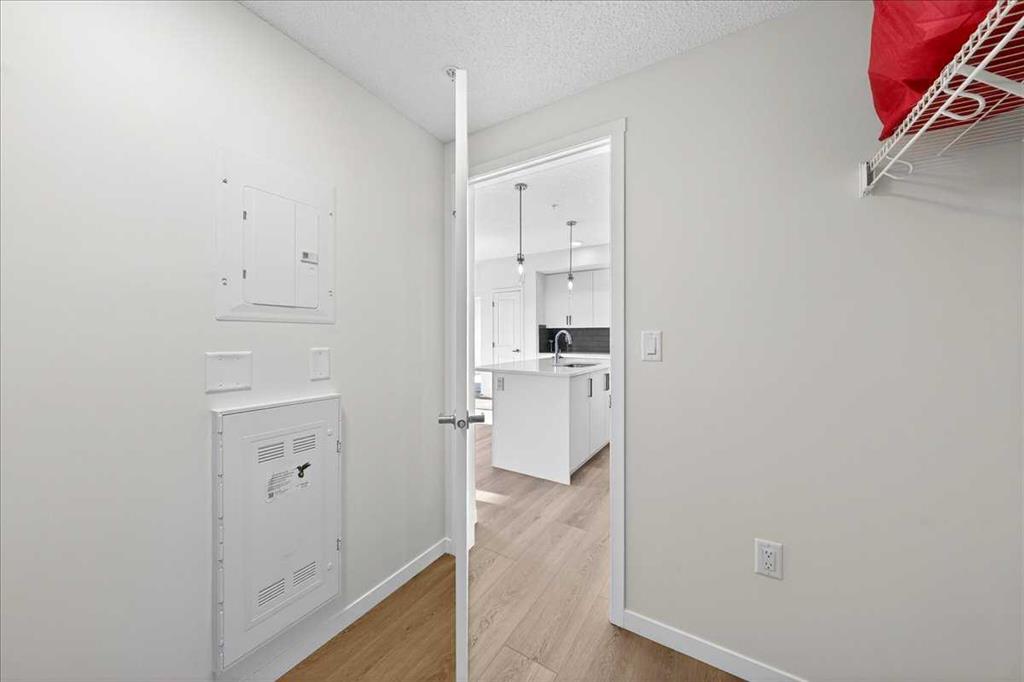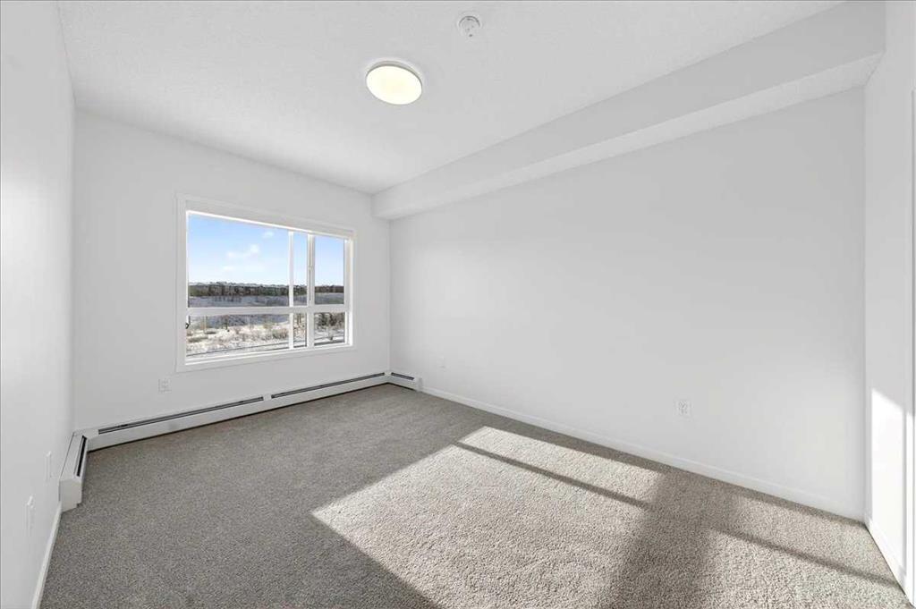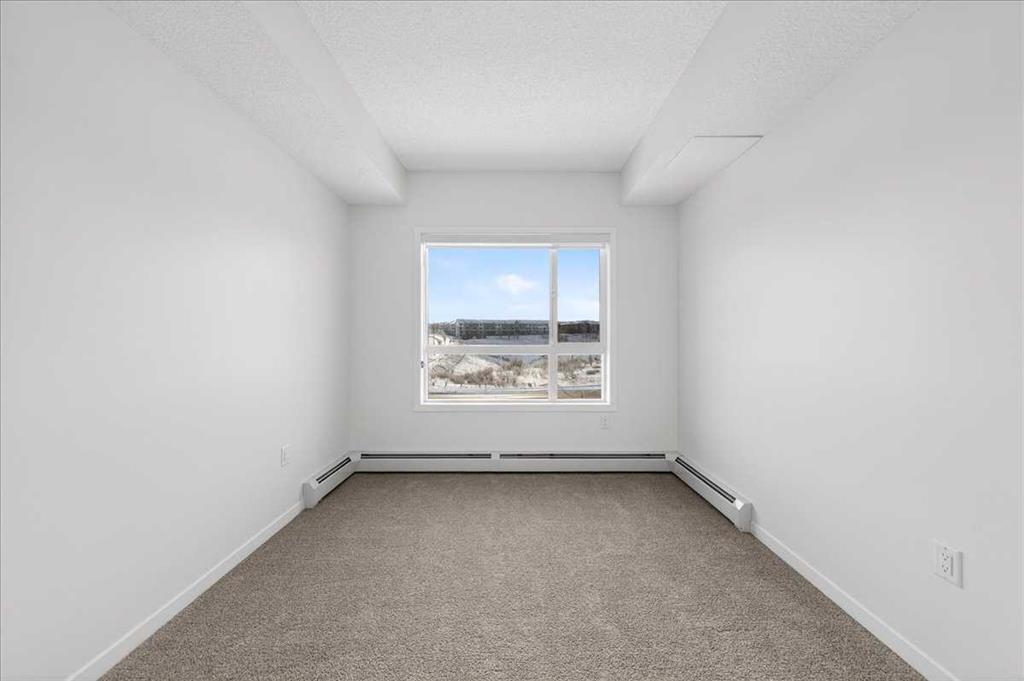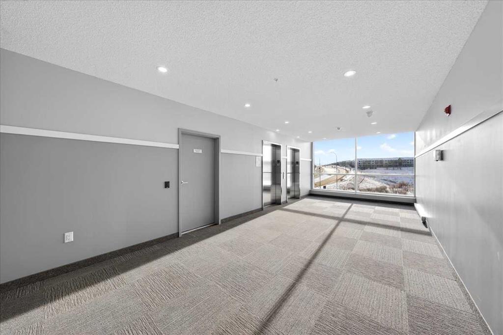 Rocky Mountain & Nolan Hill Pond views || AC Rough-ins || Corner Unit || Quartz Countertops || Stainless Steel Appliances || Titled Underground Parking || Dual-Vanity 4-piece ensuite || Epicurean Kitchen Design || Window Coverings for Bedrooms || Samsung Stacked Washer/Dryer || Walking distance to Sage Hill Quarter Plaza || Wake up to a dynamic street view right from your living space. Welcome to Glacier Ridge by award-winning Cedarglen Living. This modern apartment features a well-designed layout with 9’ knockdown ceilings, luxury vinyl plank flooring, and large windows throughout. The stylish kitchen offers quartz countertops, full-height cabinetry, stainless steel appliances, and an extended eating bar, opening to a bright living and dining area with access to a private balcony. Roughed-in for air conditioning and complete with in-suite laundry for added convenience. Generously sized bedroom(s) with plush carpet and ample closet space, along with well-appointed bathroom(s) featuring quartz counters and contemporary finishes. Includes a titled underground parking stall. The professionally managed complex offers two elevators, visitor parking, bike storage, and a community garden. Located in the vibrant community of Glacier Ridge, close to Sage Hill Quarter, parks, pathways, and future schools, with easy access to Stoney Trail, Hwy 1, and Hwy 2—ideal for commuters and weekend mountain getaways. Note: Builder Measurements: 1050sqft + 90sqft balcony.