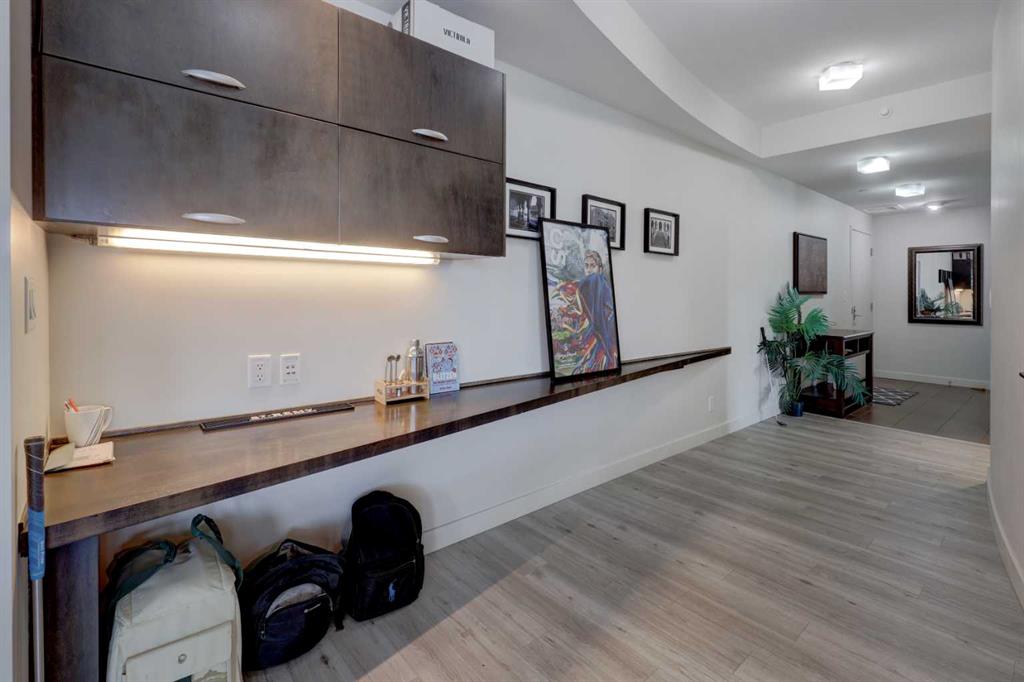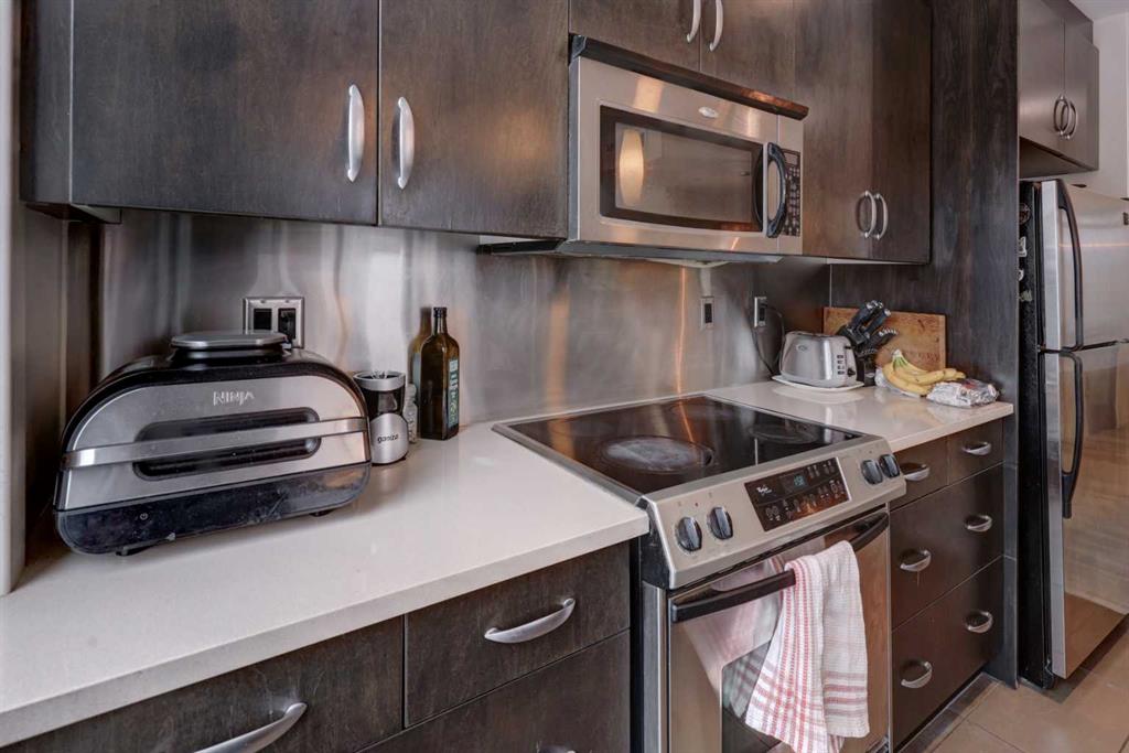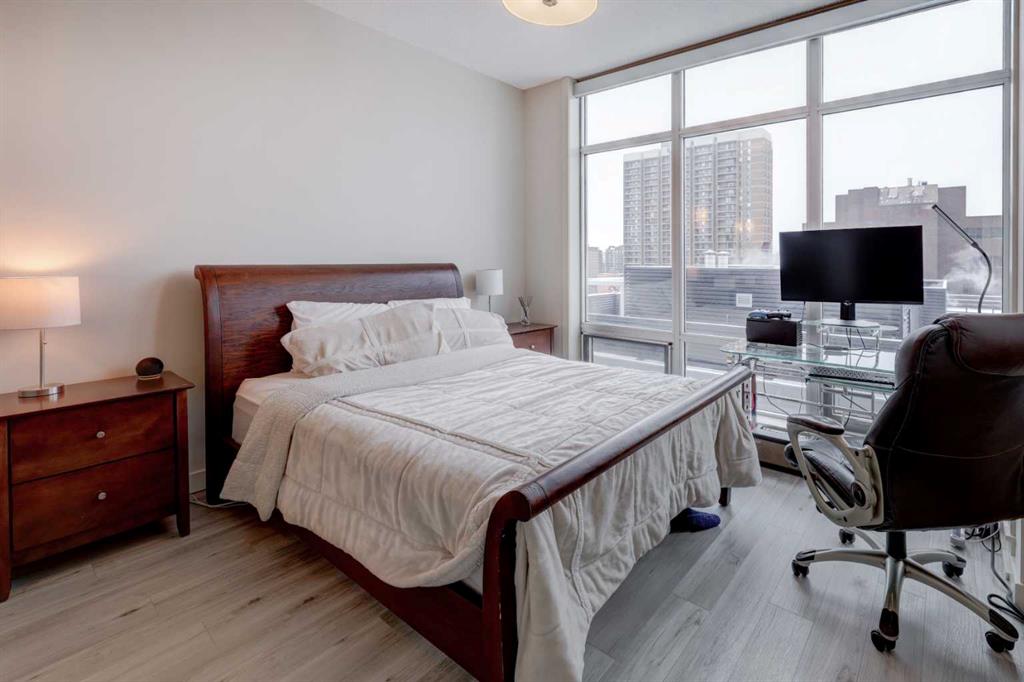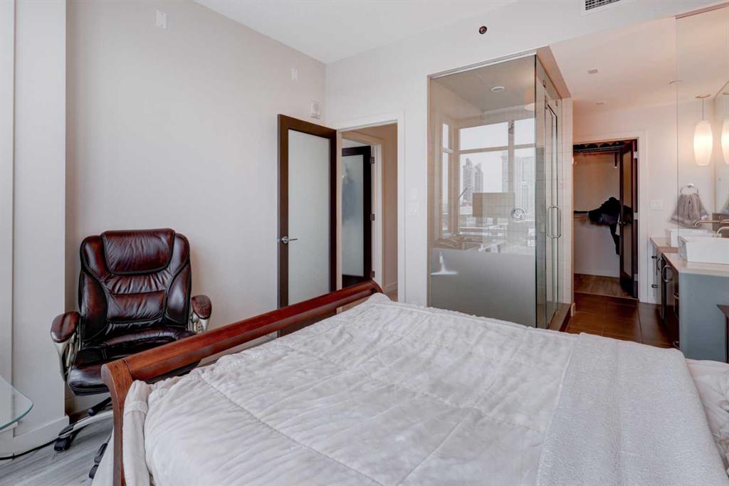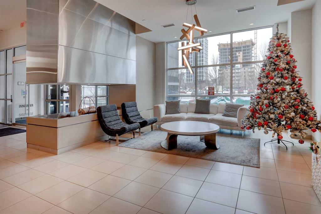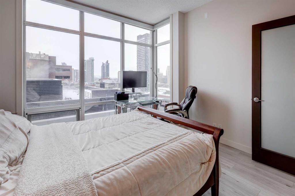 Welcome to this beautiful, modern 2 bedroom, 2 bathroom Premium Beltline condo featuring panoramic views to the north & west and titled parking stall and storage unit. Spanning 1,116 sqft, the sophisticated corner layout is framed by floor-to-ceiling windows capturing sweeping sunset, mountain and city skyline views. A huge, almost 300 sqft patio, is an entertainer’s dream, ideal for summer barbeques, morning coffee or evening cocktails under Calgary’s glowing skies. Inside we have a sleek open-floorplan with luxury vinyl plank and tile flooring throughout, quartz kitchen countertops, 9 ft ceilings, stainless steel appliances, a wine fridge and convenient office/study corner with built-in desk and cabinets. The kitchen overlooks the living area with spacious countertop and cabinet space, pantry and stainless steel appliances. The serene primary suite features a generous walk-in closet and spa-inspired ensuite with dual sinks, while the second bedroom offers ideal flexibility for guests, roommates or a home office with its own access to a full bathroom. In-suite laundry and central A/C are an added bonus. Castello is one of Calgary’s premier executive buildings, offering residents a fitness centre, guest suite, concierge services, car wash, bike rack area and pets are welcome (with restrictions). Perfectly located in the heart of the Beltline, you’re steps from 17th Ave and 4th Street restaurants, shops and vibrant nightlife.