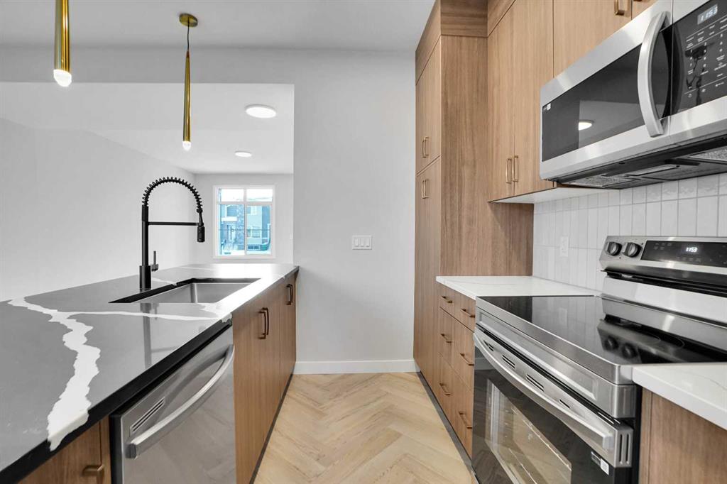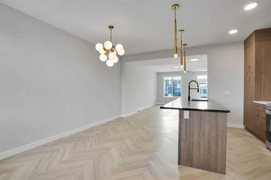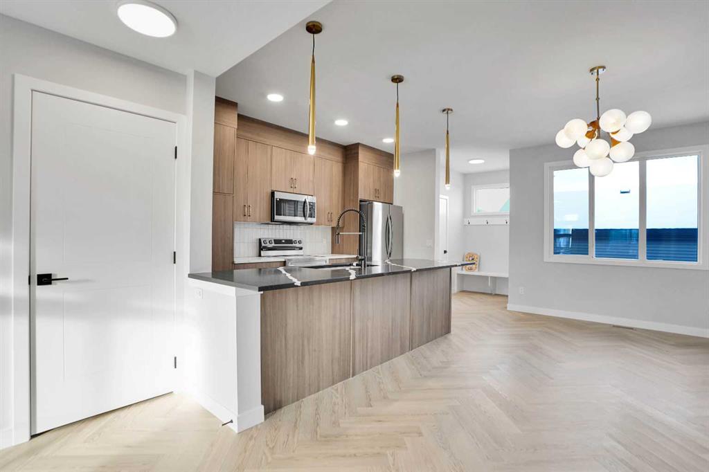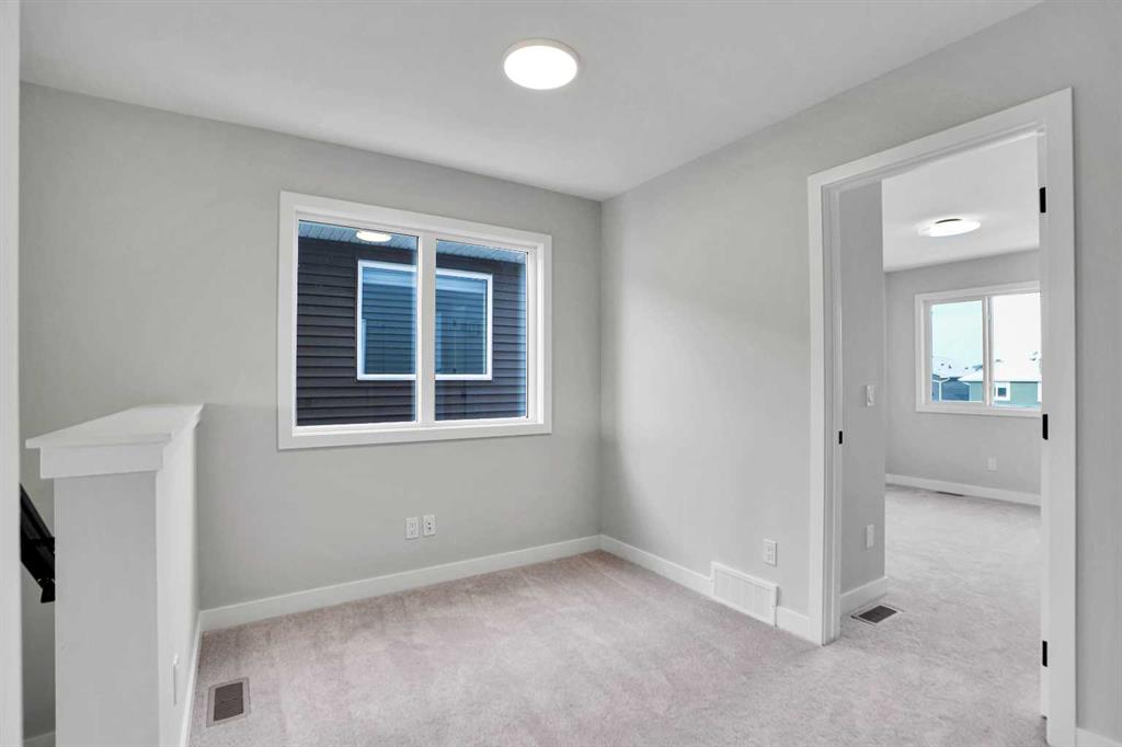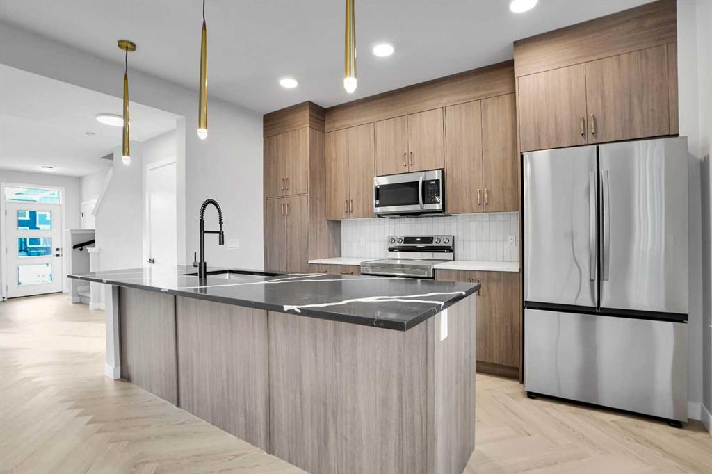 Discover this brand-new, end-unit townhome in the highly sought-after Cobblestone community of Airdrie—where modern living meets everyday convenience! Offering 1,525 sq. ft. of thoughtfully designed space, this home is perfect for families, first-time buyers, or downsizers looking for style and functionality without compromise. Step inside to an open-concept main floor featuring 9’ ceilings, large windows for natural light, and a spacious living area that flows seamlessly into the dining space. The chef-inspired kitchen boasts quartz countertops, a central island, stainless steel appliances, and sleek cabinetry—ideal for cooking, entertaining, and casual dining. Upstairs, retreat to the luxurious primary suite with a private ensuite and generous walk-in closet. Two additional bedrooms provide flexibility for kids, guests, or a home office, while the convenient upper-level laundry adds everyday practicality. This home also includes a side entrance to the basement, offering future development potential, and a detached double garage (under construction) with paved back lane access. Enjoy NO condo fees, quick possession, and a low-maintenance lifestyle in a growing community close to schools, parks, shopping, and major routes—making commuting to Calgary or weekend mountain getaways a breeze.