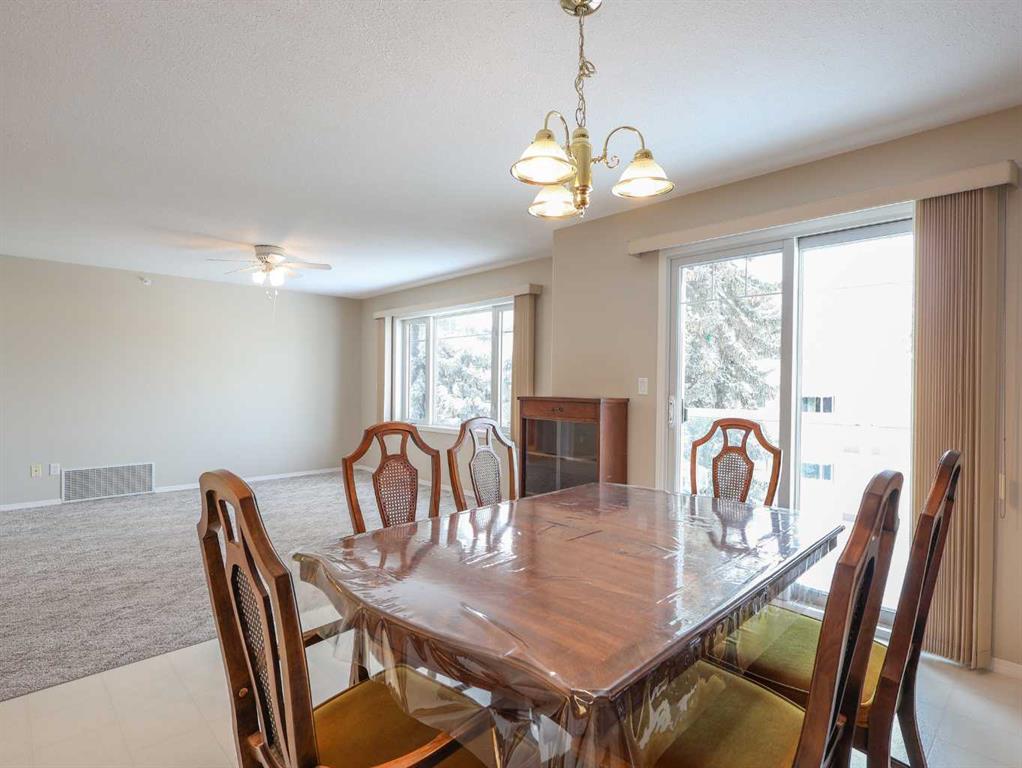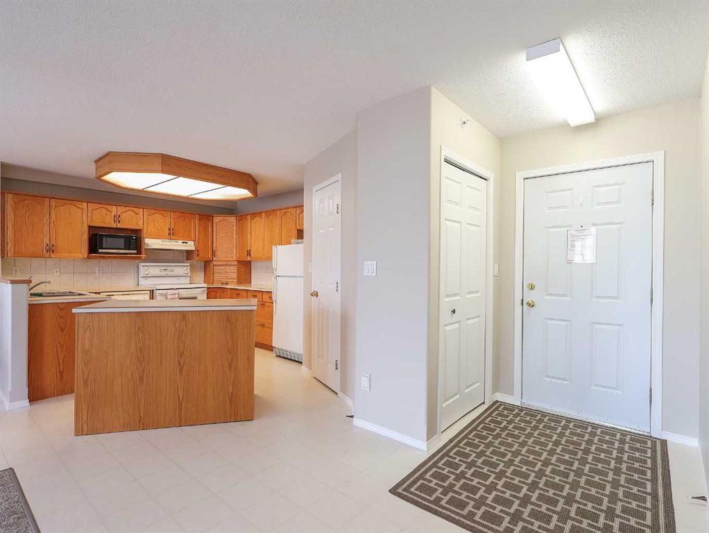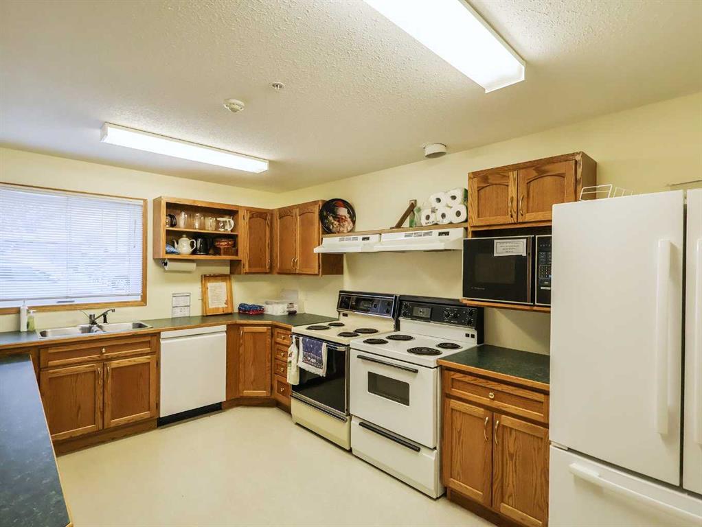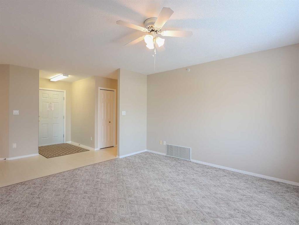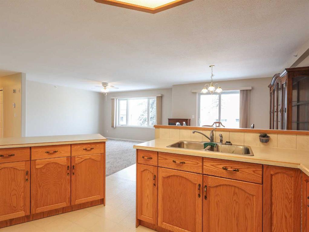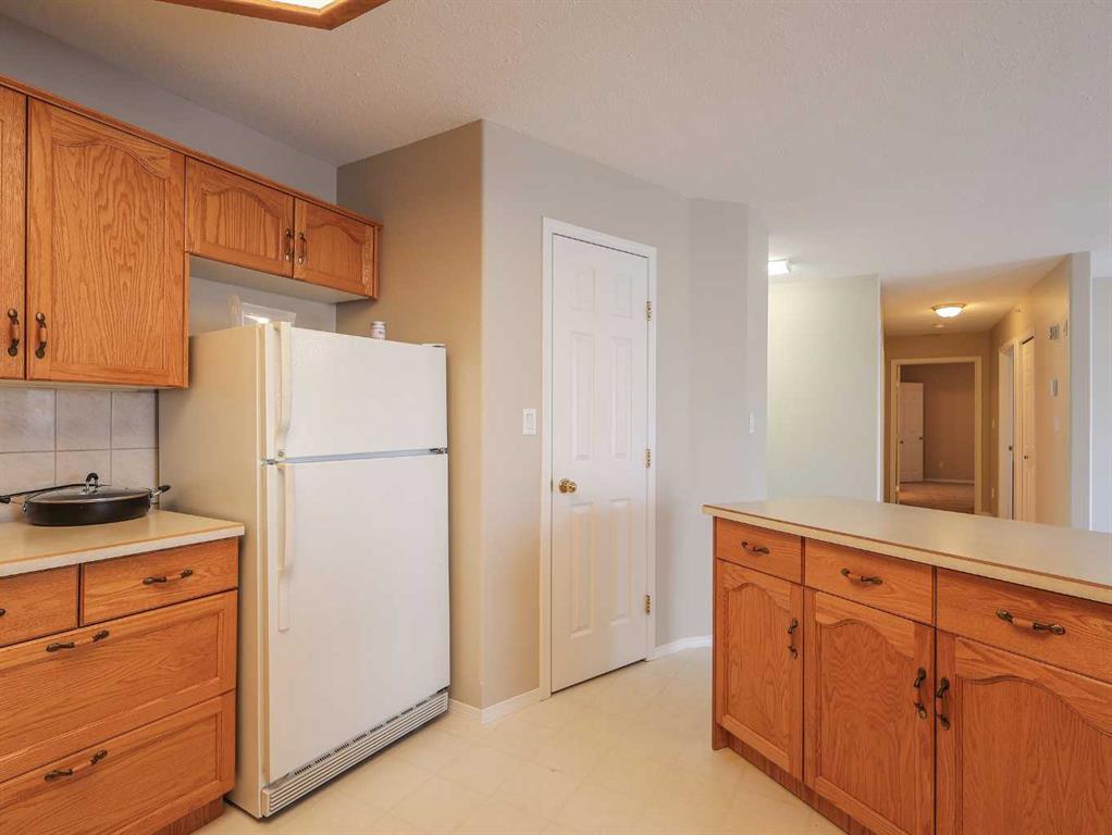 If you are looking to simplify your lifestyle, this well-maintained adult living condo in Stettler may be the perfect fit. Located on the third floor of a desirable complex and just four blocks from downtown shopping and amenities, this home offers both comfort and convenience. The open-concept design is filled with natural light from large windows and features bright white doors and trim throughout, complemented by a neutral color palette that provides a fresh backdrop for personal style. The heart of the home is the combined kitchen, dining, and living area, creating an inviting space for everyday living and entertaining. The kitchen offers oak cabinetry, a corner pantry, and ample counter space. The spacious living room is carpeted and includes a ceiling fan for added comfort, while the dining area features patio doors leading to a balcony, an ideal spot to relax. The primary bedroom is generous in size and includes a large walk-in closet and a three-piece ensuite with a walk-in shower. A second bedroom is perfect for guests, hobbies, or a home office, and a full four-piece bathroom adds convenience. Additional features include in-unit laundry with a stacked washer and dryer and a heated parking stall. This condo includes common areas for hosting family and friends, and access to an on-site exercise facility. This is a wonderful opportunity to enjoy low-maintenance living in a welcoming adult community.