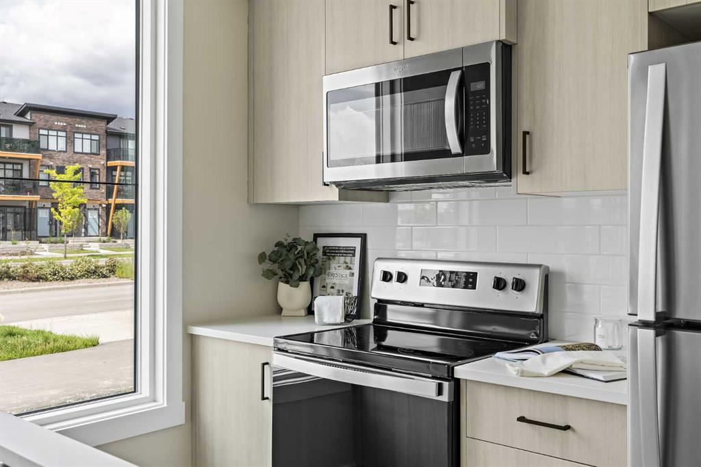 Introducing Meridian by Brookfield Residential, located in the heart of Livingston! This 1-bedroom, 1-bathroom townhome offers the perfect combination of convenience and comfort. CURRENT PROMOTION: Choose 2 OF 3 (your choice): (1) FREE A/C, (2) FREE condo fees for 2 years, or (3) $5,000 towards window coverings! This property includes a gas line to BBQ, Island Pendants, cabinet crown + riser and interior selections upgrades! Situated in a highly desirable neighbourhood, it’s just moments away from a wide range of amenities, making it an excellent choice for first-time homebuyers or investors. The ‘Coltrane’ model features a thoughtfully designed open-concept layout, complete with luxury vinyl plank flooring throughout the living spaces and bedroom (no carpet). The large west-facing windows at the front of the home invite abundant natural light, creating a bright and welcoming atmosphere all day long. The kitchen overlooks the living and dining areas, making it ideal for hosting friends and family. The kitchen is beautiful and functional, featuring stainless steel appliances, quartz countertops, full-height cabinets, and a pantry. The spacious peninsula island offers additional seating and storage options. The generous primary bedroom comes with a large closet and windows that look out onto the patio. A 4-piece bathroom and a utility room with in-suite laundry and extra storage complete the home, offering convenience and practicality. Completing the unit is a title parking stall. Situated in Livingston, a vibrant new community, this townhome is within walking distance of parks, playgrounds, the Livingston Homeowners Association, a dog park and numerous other amenities. With easy access to major routes, this property presents an opportunity that shouldn't be missed. **Please note: The photos provided are of a previous home and may not represent the property for sale, finishes may vary.