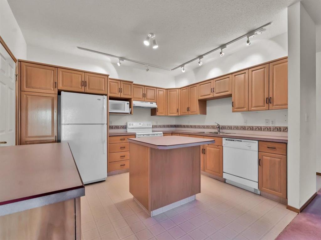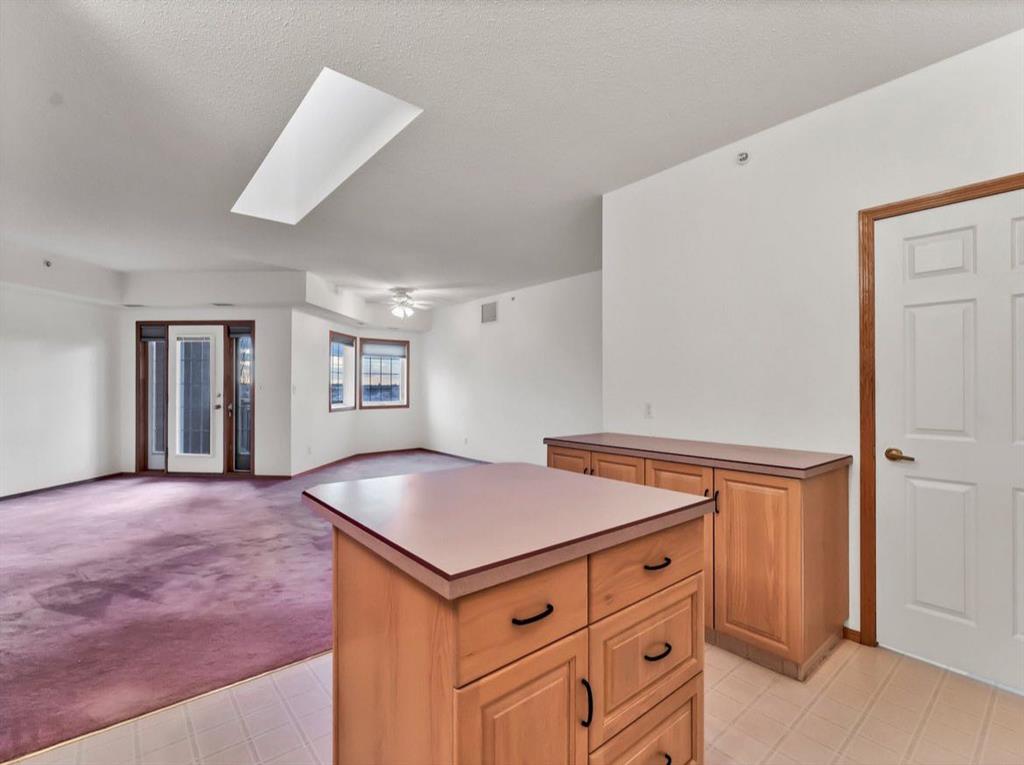 This one bedroom condo also includes a large den and is located in the Courtyards at Meadowlands. Enjoy the gas fireplace in the large living room and just off the living room is access to the deck. The kitchen is a good size with plenty of cupboards, plenty of lighting and a large island. This is a very bright spacious suite with highs ceiling and a large skylight. This top level condo has a wonderful view. The suite and parking are close to the elevator making easy access in and out of the building. This unit includes 1 underground assigned parking space with a storage unit. Condo amenities include swimming pool, whirlpool, library, common areas and more. Call for your private viewing.
