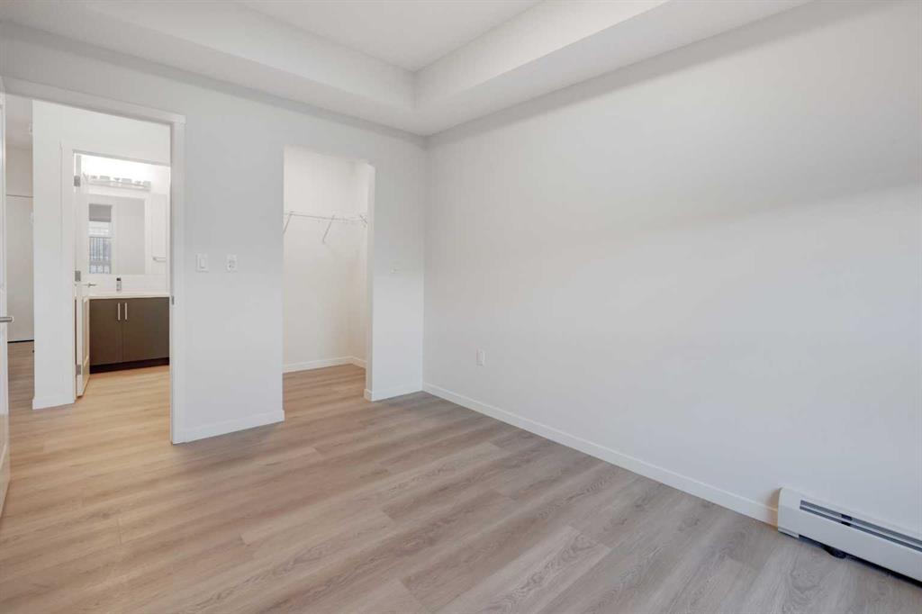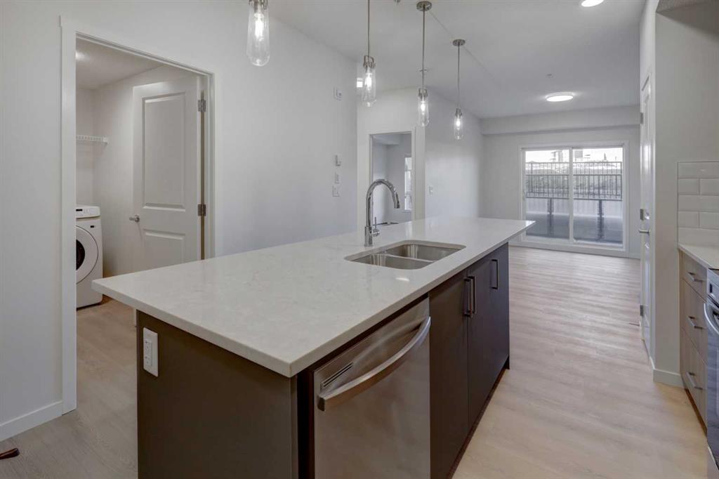 INTRODUCING GLACIER RIDGE, IN BEAUTIFUL NORTHWEST CALGARY. BUILT BY CEDARGLEN LIVING, WINNER OF THE Customer Insight BUILDER OF CHOICE AWARD, 6 YEARS RUNNING! BRAND NEW "GR04" unit with high-spec features. You will feel right at home in this well thought-out, 588.10 RMS sq.ft. 1 bed, 1 bath home with open plan, 9' ceilings, LVP flooring throughout (NO CARPET), Low E triple glazed windows, BBQ gas line on the patio, Fresh Air System (ERV), A/C rough-in, and so much more. The kitchen is spectacular with full height, two tone cabinets, quartz counters, upgraded bank of drawers for pots and pans, undermount sink, rough-in water line to the fridge and S/S appliances. The island is extensive with built in flush breakfast bar, which transitions into the spacious living area, perfect for entertaining. The spacious primary bedroom has a large bright window (triple pane windows) and sizeable walk-in closet. Right beside your bedroom is a 4pc bath with quartz counters, upgraded tiles to the ceiling, and undermount sink. Nearby is the spacious laundry/storage room, this is a must see (washer & dryer included). Highlights include: Hardie board siding, designer lighting package, sound reducing membrane to reduce sound transmission between floors, clear glass railing to balconies and 1 titled underground parking stall included. A once in a lifetime community in Northwest Calgary. Framed by views of the Rocky Mountains and distinguished by natural coulees that cross the land, Glacier Ridge offers a rare chance for families to live in a new community. PET FRIENDLY COMPLEX, IMMEDIATE POSSESSION AVAILABLE AND DON'T FORGET TO CHECK OUT THE VIRTUAL TOUR.