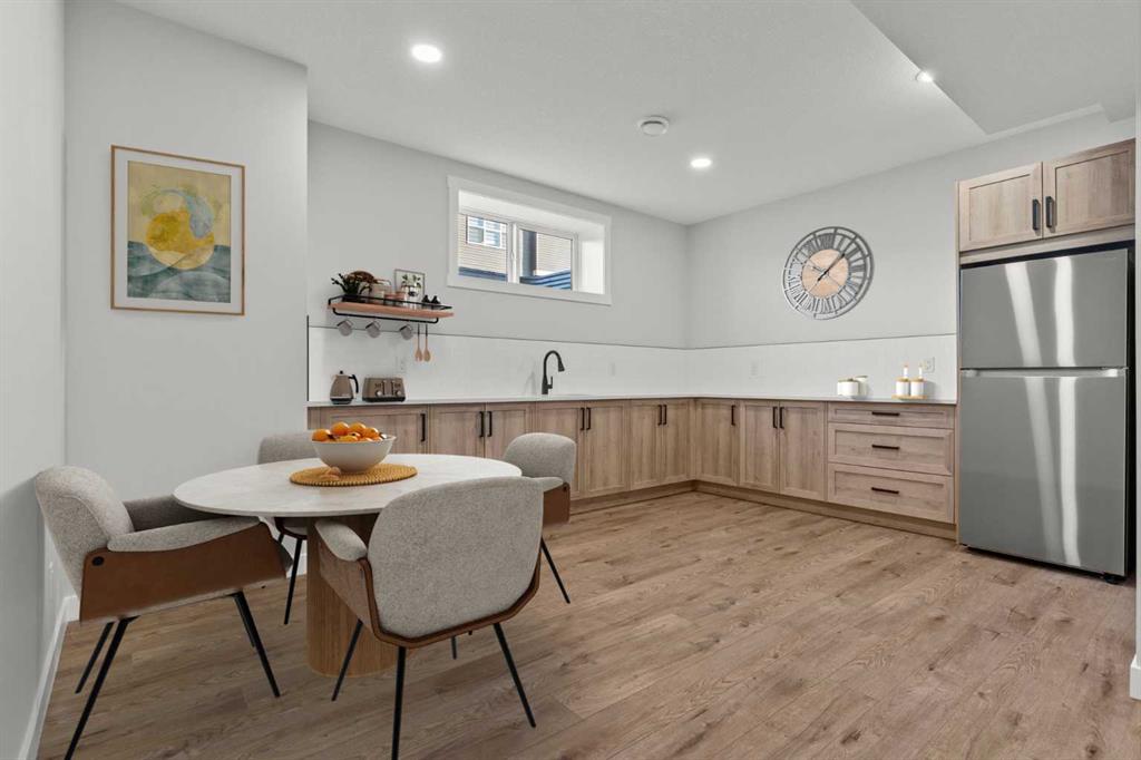 Welcome to 267 Kinniburgh Loop, a truly exceptional luxury home offering 3,294 sq. ft. of living space, 6 bedrooms, 4 full bathrooms, and a fully finished basement and Spice Kitchen. This home has been thoughtfully designed for both everyday living and entertaining. From the moment you arrive, you’re welcomed by an impressive oversized front door and a spacious, open entry that immediately sets the tone for the quality found throughout the home. Just off the foyer is a large main-floor bedroom or office, conveniently connected to a full bathroom with a standing shower—ideal for guests or multigenerational living. Pictures of similar model home spec subject to change. As you move further into the home, you’ll be captivated by the stunning chef’s kitchen featuring a nearly 9-foot island, quartz countertops, stainless steel appliances, full-height cabinetry, and high-end luxury finishes. The main floor is completed by a spacious living room with an electric fireplace, dining area, spice kitchen, and a walk-through mudroom with direct access to the garage. Everyday convenience is elevated with three main-floor closets, including two in the kitchen and one in the mudroom. Upstairs, a generous bonus room and sitting area create the perfect secondary living space. The expansive primary bedroom offers breathtaking pond views and connects to a spa-inspired 5-piece ensuite featuring dual vanities, a large glass shower with mosaic tile base, a freestanding tub, and a private toilet room. The ensuite flows seamlessly into the laundry room, which also offers access back to the bonus room for added functionality. The upper level is completed by two additional large bedrooms and another beautifully finished 5-piece bathroom, with no dropped beams on the main or upper floors for a clean, open feel. The fully finished basement extends the home’s versatility with two more spacious bedrooms, a large wet bar with fridge, and an additional washer and dryer hookup—ideal for extended family or entertaining. This home includes all of the renowned Golden Homes standards, such as true 9-foot ceilings on both the main floor and basement, triple-pane windows, side entry, matte black iron spindle railings, matte black hardware and fixtures, built-in shelving in the pantry and primary walk-in closet, upgraded carpet underlay, a tankless hot water heater, smart home features, gas lines to both the deck and garage, and a solar panel rough-in. The exterior is fully landscaped with the lot graded and loamed, sod installed to the side entry, and a front yard tree.