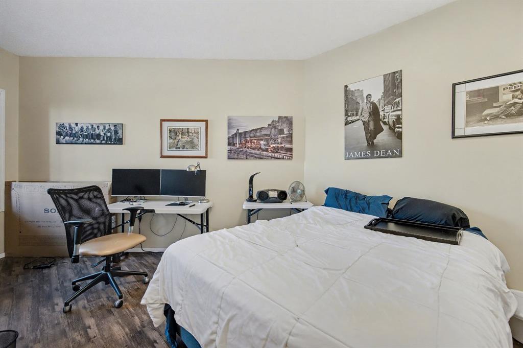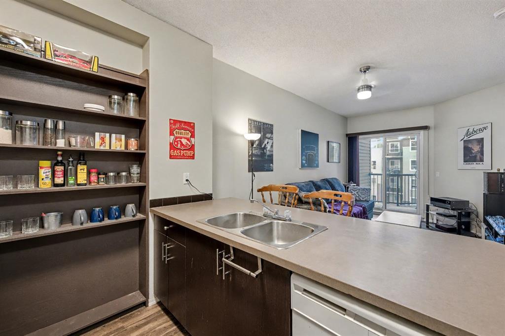 Amazing VALUE for this great condo with a large BALCONY overlooking the courtyard. This BEAUTIFUL and well-maintained unit features an OPEN layout with 9-foot ceilings — perfect for living and entertaining. The kitchen features a large eating bar overlooking the dining area and living room. The spacious living room has patio doors that lead to your BALCONY. The large bedroom has a walk-in closet and a sitting area, or plenty of room to set up a home office. There is also INSUITE LAUNDRY and storage. This unit comes with a titled PARKING STALL just steps from the main entrance. This condo is perfect for first-time buyers, downsizing, or investors. Condo fees include heat, electricity, water, and more. The concrete building offers a nice, quiet place to come home to, with a welcoming lobby. Excellent location! Close to shopping, transit, amenities, and easy access to major roadways. Only minutes to downtown. Don’t miss out on this great condo at an affordable price!