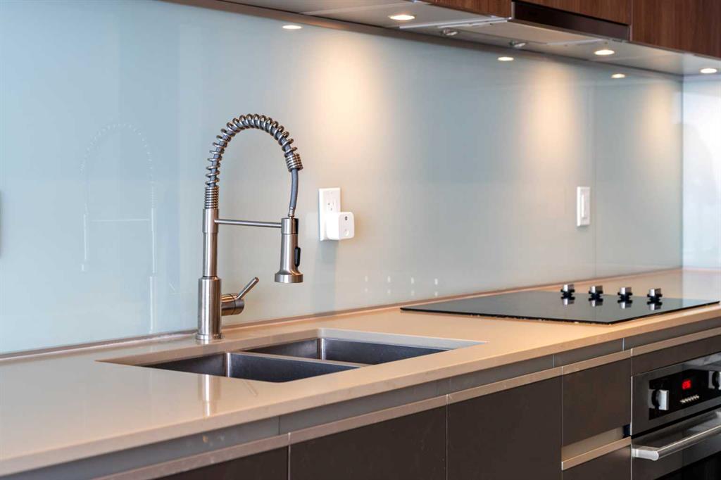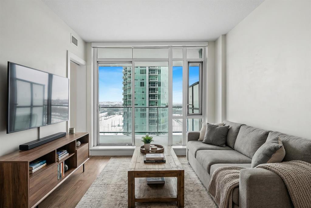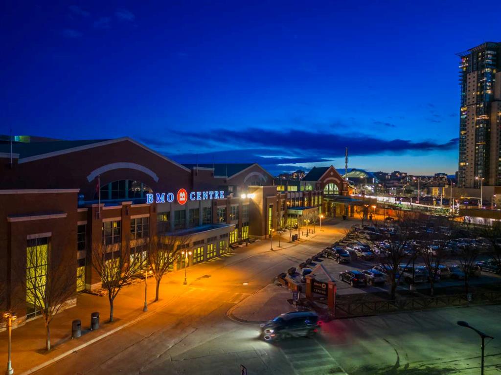 Beautifully finished and flooded with natural light, this executive 1-bedroom condo offers refined urban living in the heart of Calgary’s ever-evolving Culture & Entertainment District. Perfectly positioned just minutes from the Bow River pathways, Stampede Grounds, Scotiabank Saddledome, the state-of-the-art BMO Convention Centre, the upcoming entertainment district, C-Train access, and some of the city’s best restaurants and nightlife. Inside, the open-concept layout is enhanced by light oak hardwood flooring and a stunning L-shaped, European-inspired kitchen. Featuring sleek Italian cabinetry, quartz countertops, a contemporary glass backsplash, stainless steel appliances, and a thoughtfully integrated center island with hidden microwave and added storage, the space is as functional as it is stylish—ideal for both everyday living and entertaining. The living room is a true retreat, highlighted by floor-to-ceiling, wall-to-wall windows that showcase sweeping views of Scotsman Hill and the Bow River Valley. Natural light pours in, creating an airy feel that exceeds the unit’s footprint. A sliding glass door opens to the oversized balcony, perfect for morning coffee at sunrise or shaded summer evenings with friends, offering seamless indoor-outdoor living. The private bedroom features a generous walk-in closet with custom organizers. Additional highlights include updated modern lighting and plumbing fixtures, a stylish 4-piece bathroom, and a spacious laundry room with stacked washer and dryer, plus extra storage and hanging space. A large, separate storage locker (approximately 3’ x 6’ x 7’) is included. Parking is available for rent at $150 + GST per month, with multiple rental opportunities typically advertised by owners within the building. The Guardian is a fully air-conditioned, professionally managed tower offering daily concierge service and unbeatable access to downtown amenities, including East Village, Eau Claire, shopping, cafés, and entertainment. With condo fees of just $365/month, this is an outstanding opportunity to invest in one of Calgary’s most exciting and rapidly growing neighborhoods—or to stop renting and step into homeownership in a premier building. Book your private showing today
