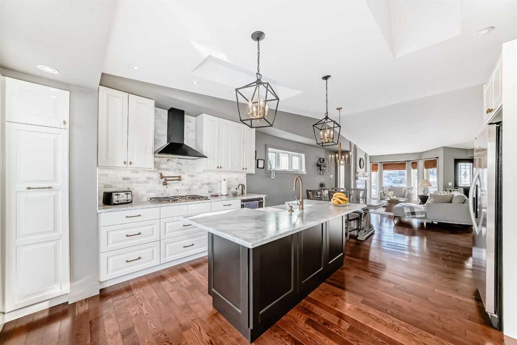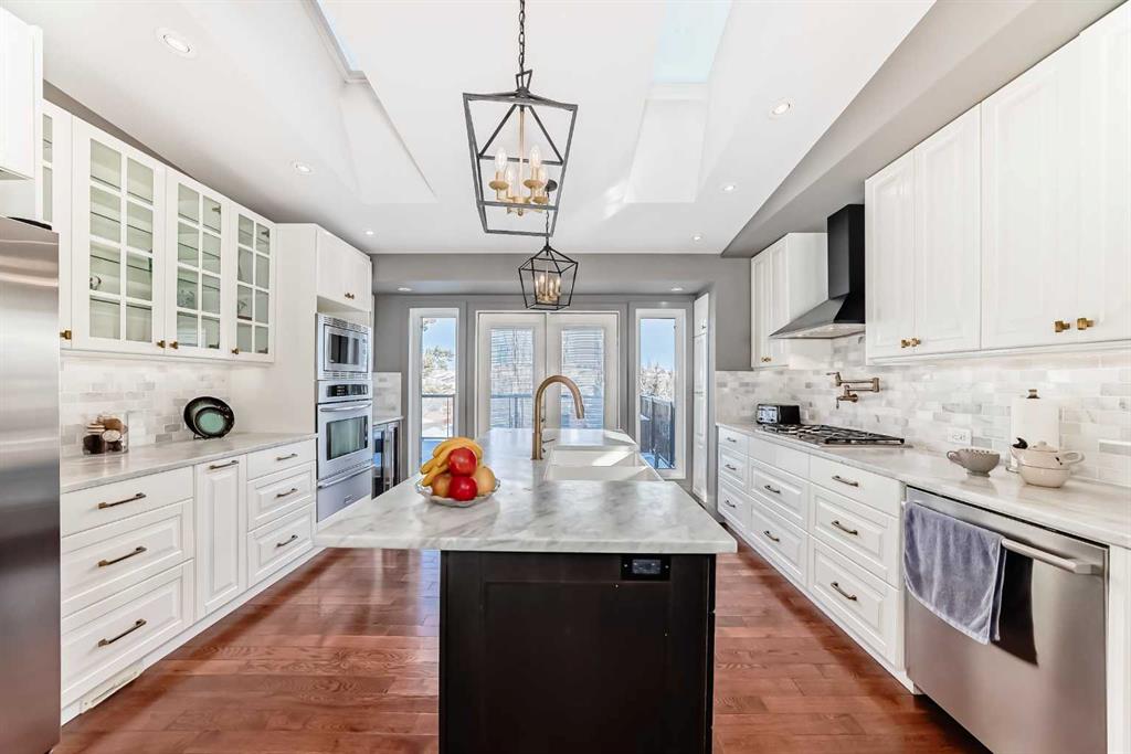 *Magnificent Backyard View to this fully updated WALKOUT 5 bedroom bungalow backing onto Green Space, Pathway. Stunning Open Concept Design with vaulted hardwood floors leading into an open concept kitchen/dining/living room with view through the main floor to the beautifully landscaped, secluded back yard with access to the Pathway system. This dream kitchen is thoughtfully designed with a pot filler above the built-in gas cooktop, a dual-temperature beverage and wine fridge tucked beneath the coffee and tea nook, and a warming drawer located under the built-in oven. A large central island features a timeless ceramic apron sink and provides ample seating for several bar stools. The space is completed with an abundance of cabinetry and elegant marble countertops. Overhead, the vaulted ceiling is enhanced by two skylights, one of which opens and closes remotely and is equipped with a rain sensor that automatically closes at the first sign of precipitation. Truly endless possibilities await in this exceptional kitchen. Step through the kitchen’s French doors onto the expansive upper deck that spans the full width of the home, offering outstanding options for entertaining and showcasing beautiful views of the park and beyond. The nighttime city lights create a spectacular backdrop to enjoy and unwind. The main floor is filled with natural light thanks to the abundance of windows and provides an ideal layout for open entertaining or relaxed family living. The primary bedroom features patio doors leading directly to the deck and includes a lovely four-piece ensuite with a storage cabinet. Two additional bedrooms and a four-piece bathroom complete this level. The fully finished walk-out basement, with its separate entrance, adds exceptional versatility. It includes two more bedrooms, a stylish four-piece bathroom, a spacious laundry room, and a recreation room with a separate wet bar area complete with cabinetry and countertops. This space is perfect for older children to host friends or enjoy their own private retreat. Notable updates completed in 2020 include a new furnace and hot water heater. A playground is conveniently located just down the street, while the pathway system behind the home leads to a nearby school and small business centre. Enjoy close proximity to transit, abundant shopping, Stoney Trail Ring Road, Country Hills Boulevard, and a short drive to Calgary International Airport. This BEAUTY won't last!!