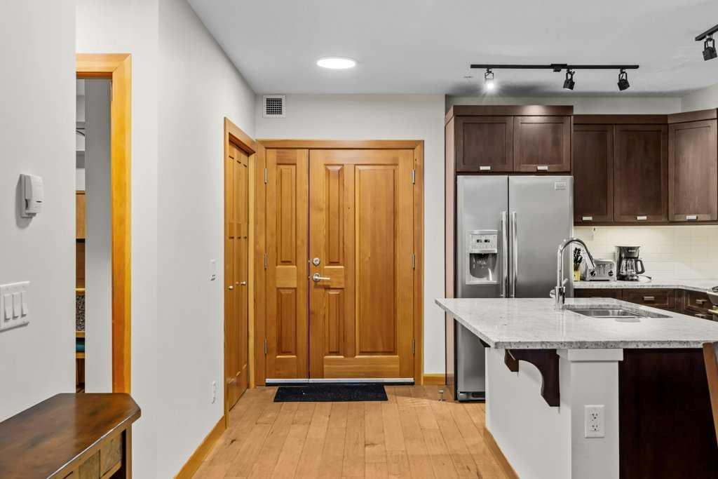 This inviting 2-Bedroom , 2-Bath residence offers 921 sq. ft. of thoughtfully designed living space, blending comfortable gathering areas with private retreat zones. Beautifully upgraded throughout, the home features a modern kitchen and bathrooms enhanced by custom wood cabinetry and quality finishes that add warmth and character. Sold fully furnished, this turn-key property is ideal for personal or family use, or as a long-term rental mountain retreat. You will love being able to entertain in the main living area which seamlessly blends living space with meal prep and dining – perfect for building memories! The primary bedroom serves as a relaxing sanctuary complete with an updated ensuite, while the den’s murphy-style bed allows that space to function seamlessly as both a home office and an additional bedroom. Located in the highly sought-after Serenity Ridge development in Stewart Creek, residents enjoy a quiet, peaceful setting with easy access to walking and biking trails, golf, shopping, and schools. The building offers excellent amenities including secure underground parking, onsite storage, a hot tub, and an owner’s lounge. With its stylish design, flexible layout, quality finishings, added storage, and exceptional location, this move-in-ready home deserves a place on your short list—come see for yourself: the Canmore lifestyle is calling you “HOME”.