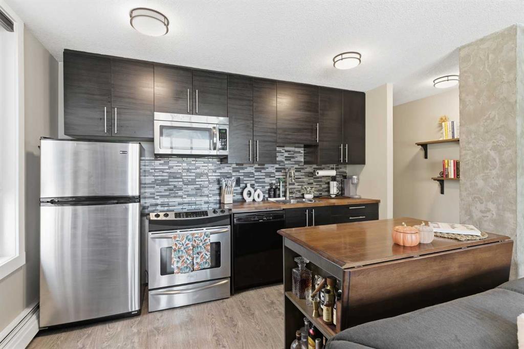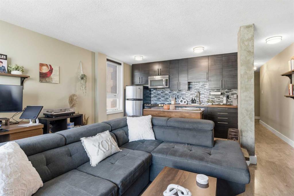 Exceptional location, incredible price (newly adjusted!), gorgeously renovated and decorated 622 square foot West-facing CORNER apartment: 12.75' x 4' Balcony plus 2 newer patio doors and windows! Beltline is one of Calgary's most desired communities, with Walk and Bike Scores 96-99, and Wickham Place has underground or surface off-street parking options - incredible value. Click the Virtual iGuide Tour Link for 360 experience of this beautiful property. 604 1015 14 Avenue SW is second from top-floor in this 41 Unit concrete building with ALL Utilities included in the monthly fee. Stylish renovations create a gallery-like feel to the open concept interior, with redone knock-down ceilings, dark cabinetry, stainless appliances, wood counters and functional mobile chopping block island with added storage. Everything combines to give a semi-industrial but creative feeling to the interior. Plank flooring throughout makes cleaning a breeze, and the layout allows for either a full Living and Office-or-Dining (Flex) capacity for furnishings, or to full-width, with sectional and central Living-Dining combination. The massive Bedroom is privately situated, holds a king-bed, 2 side tables, additional dresser, laundry/mirror accessories and the closet has organiser shelving. The updated Bathroom has a renovated shower-and-soaker with glass, and tasteful shelving increases the storage capability, in addition to a huge interior storage-or-pantry. From the welcoming Foyers on, the building and apartment effortlessly carry the promise of optimal City Central urban living. Security access only via intercom, extra huge assigned storage locker (15), parking (9), laundry facilities, bike storage, recreation area, and documents ready for preview make this the perfect purchase - who knew downtown could be this affordable, already-upgraded and versatile to any taste!