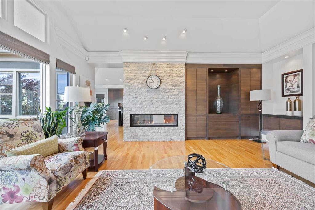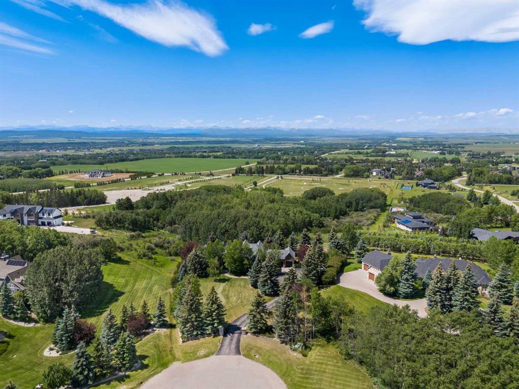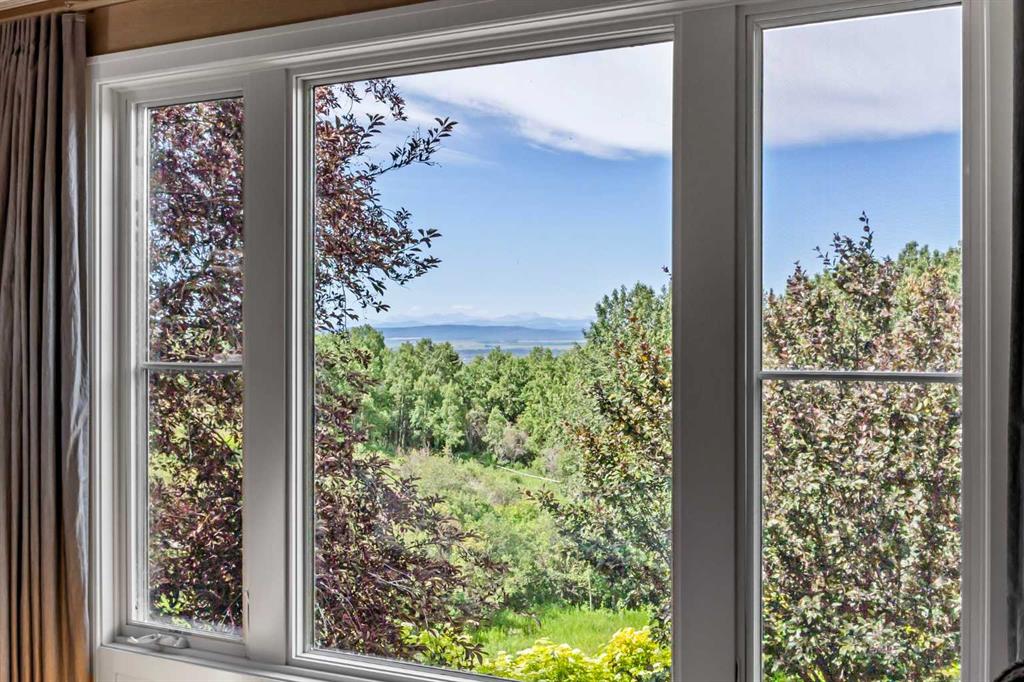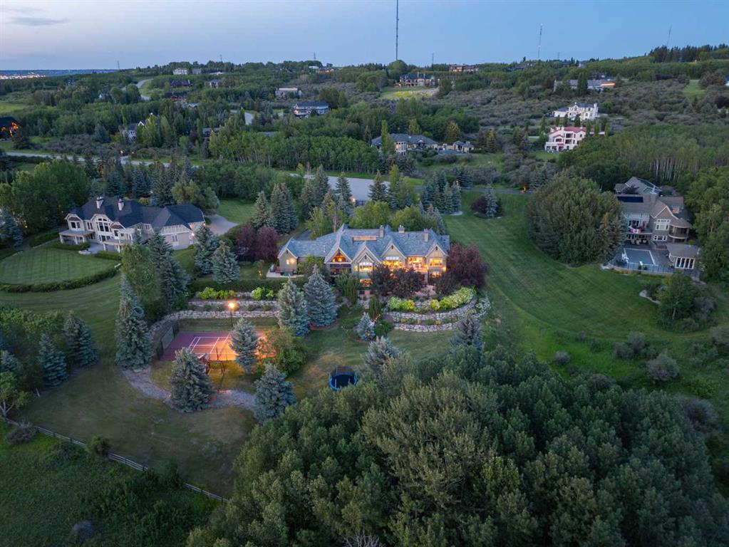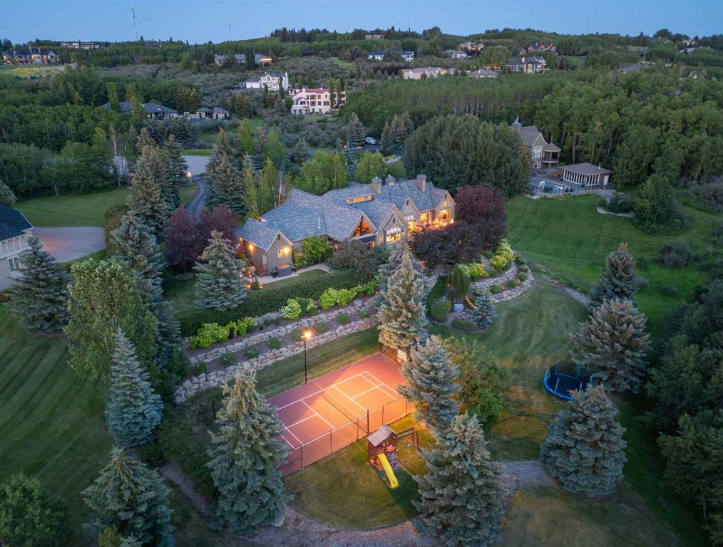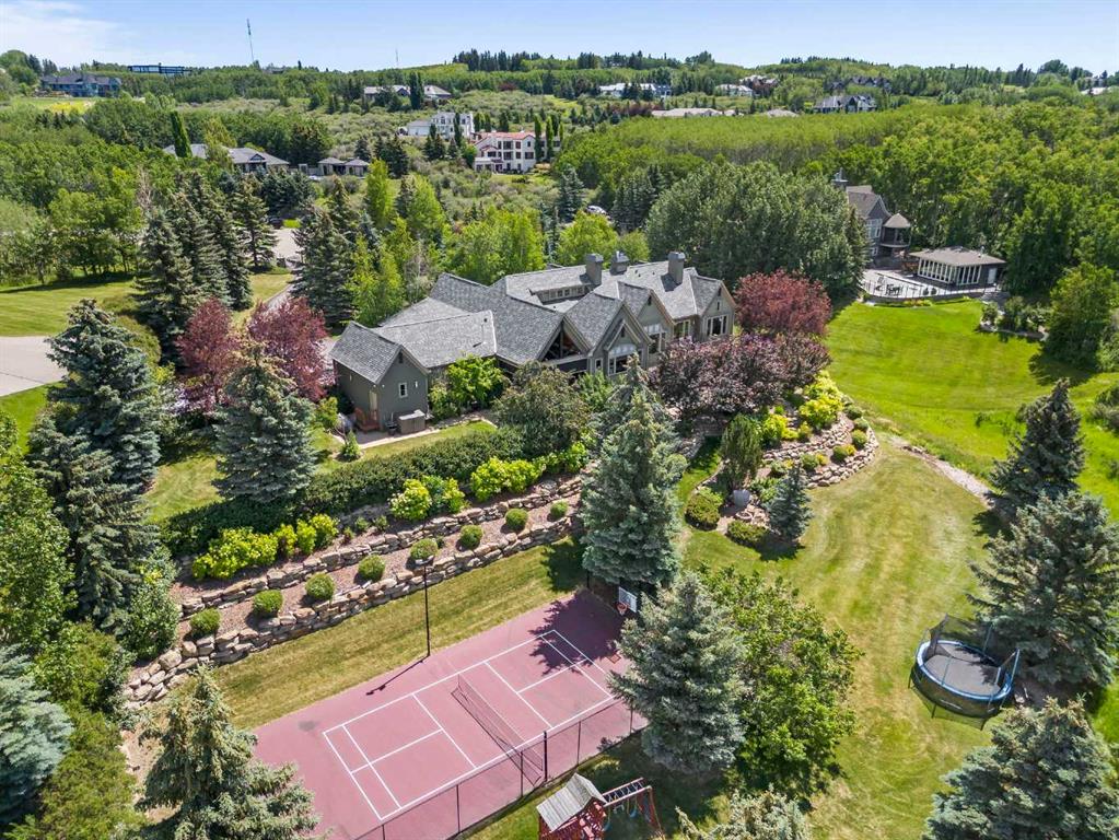 Set on two beautifully landscaped acres at the end of an exclusive Central Springbank cul-de-sac, this extraordinary 3,124 sq ft walkout bungalow enjoys a prime ridge-top position with sweeping views of the Rocky Mountains. Originally custom built by Waterford Homes and extensively renovated by Rockwood Custom Homes, this one-of-a-kind residence offers over 6,000 sq ft of refined living space that blends timeless elegance with family functionality. The home features 5 bedrooms, 6 bathrooms, 3 gas fireplaces, and a private home office. Every detail reflects premium craftsmanship—from soaring vaulted ceilings and rich millwork to heated limestone flooring and superior architectural elements. A new roof was installed in 2022, adding further peace of mind. The designer kitchen is a chef’s dream, equipped with a Wolf 6-burner gas stove and steam oven, Sub-Zero fridge, Thermador stand-up freezer, Miele espresso machine, and two built-in dishwashers. A striking basalt slab backsplash, expansive quartz island, and custom cabinetry create a space that’s as functional as it is stylish. A double-sided fireplace adds warmth and charm to both the kitchen and adjacent living space. Entertain with ease in the formal dining room, enhanced by arched windows and exquisite wood detailing, or dine on the fully covered west-facing patio—complete with vaulted timber ceilings, commercial-grade heaters, and phantom screens for year-round enjoyment. The luxurious primary suite includes a private office nook with a dual-sided fireplace, built-in shelving, a spacious walk-in closet, and a spa-inspired 6-piece ensuite with heated floors, steam shower, and Toto automatic toilet. The bright and open walkout basement offers endless possibilities with its floor-to-ceiling windows, radiant heated limestone floors, and a full wet bar featuring a Miele fridge and freezer. This level also includes three additional bedrooms, two full bathrooms, and ample space for a home theatre, gym, or games room. Additional features include air conditioning, a private pickleball/tennis court, hot tub, outdoor fire pit, fenced dog run and dog wash, oversized 4-car garage, and a built-in media system throughout. This ridge-top gem offers unparalleled privacy, mountain views, and high-end comfort—all just minutes from city conveniences.