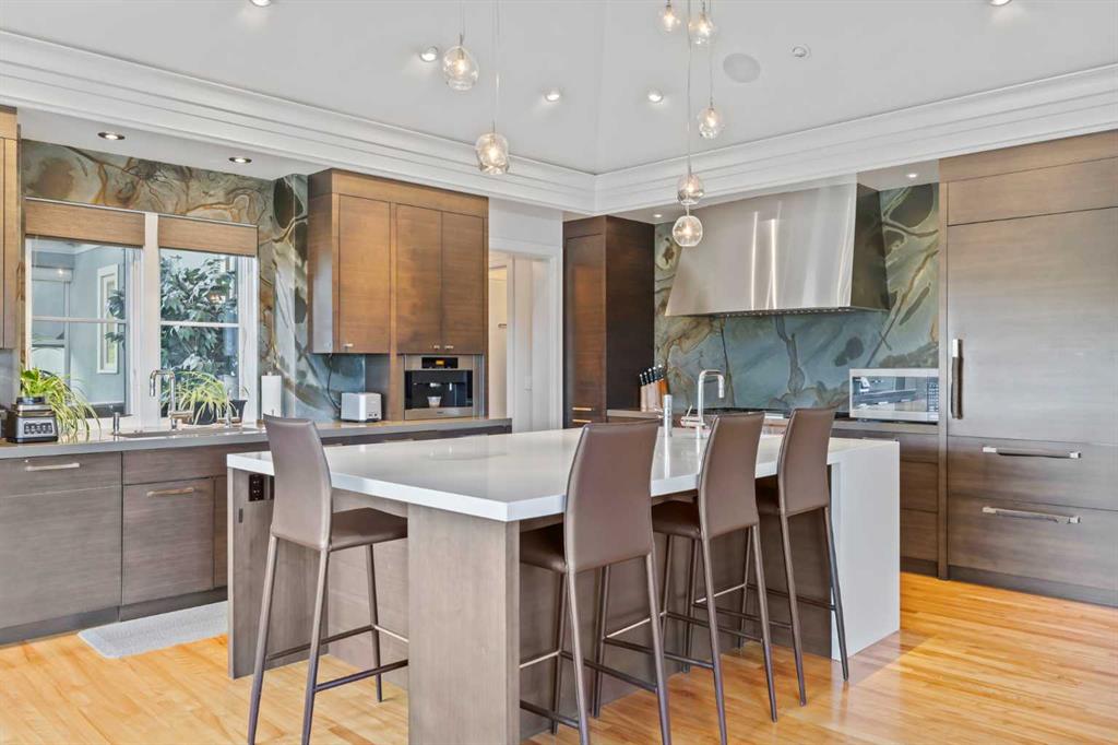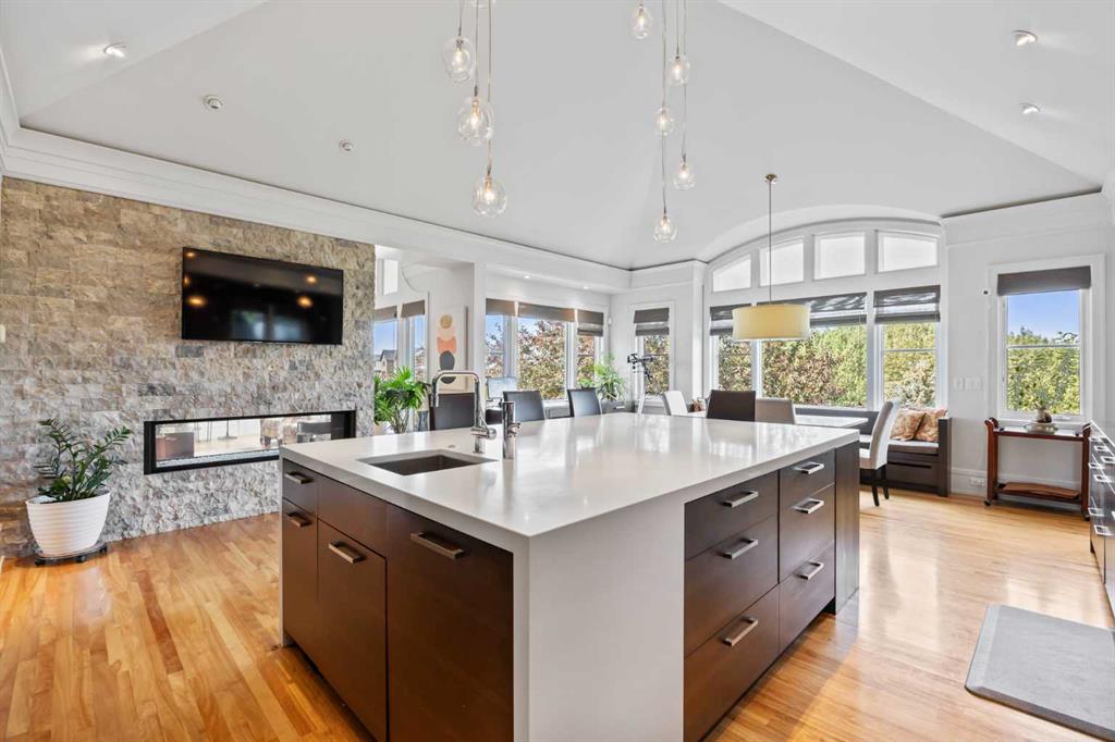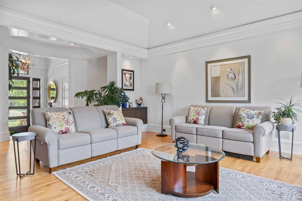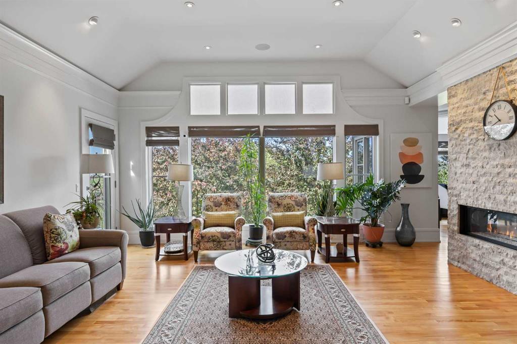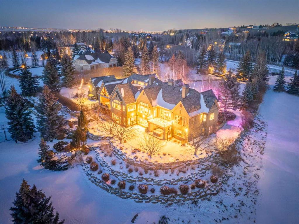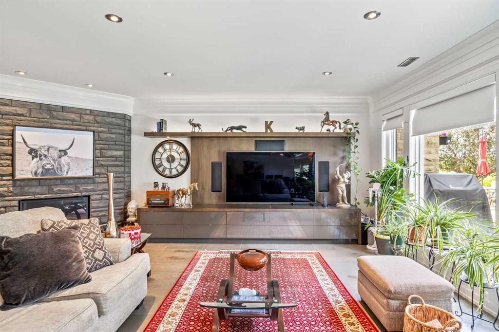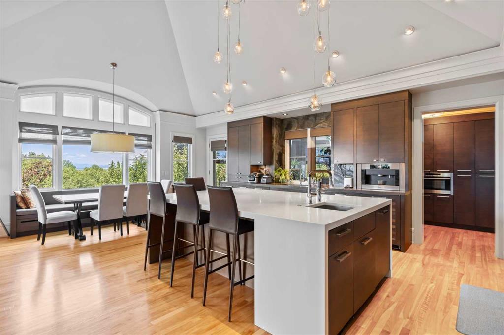 Set on two beautifully landscaped acres at the end of an exclusive Central Springbank cul-de-sac, this extraordinary 3,124 sq ft walkout bungalow enjoys a prime ridge-top position with sweeping views of the Rocky Mountains. Originally custom built by Waterford Homes and extensively renovated by Rockwood Custom Homes, this one-of-a-kind residence offers over 6,000 sq ft of refined living space that blends timeless elegance with family functionality. The home features 5 bedrooms, 6 bathrooms, 3 gas fireplaces, and a private home office. Every detail reflects premium craftsmanship—from soaring vaulted ceilings and rich millwork to heated limestone flooring and superior architectural elements. A new roof was installed in 2022, adding further peace of mind. The designer kitchen is a chef’s dream, equipped with a Wolf 6-burner gas stove and steam oven, Sub-Zero fridge, Thermador stand-up freezer, Miele espresso machine, and two built-in dishwashers. A striking basalt slab backsplash, expansive quartz island, and custom cabinetry create a space that’s as functional as it is stylish. A double-sided fireplace adds warmth and charm to both the kitchen and adjacent living space. Entertain with ease in the formal dining room, enhanced by arched windows and exquisite wood detailing, or dine on the fully covered west-facing patio—complete with vaulted timber ceilings, commercial-grade heaters, and phantom screens for year-round enjoyment. The luxurious primary suite includes a private office nook with a dual-sided fireplace, built-in shelving, a spacious walk-in closet, and a spa-inspired 6-piece ensuite with heated floors, steam shower, and Toto automatic toilet. The bright and open walkout basement offers endless possibilities with its floor-to-ceiling windows, radiant heated limestone floors, and a full wet bar featuring a Miele fridge and freezer. This level also includes three additional bedrooms, two full bathrooms, and ample space for a home theatre, gym, or games room. Additional features include air conditioning, a private pickleball/tennis court, hot tub, outdoor fire pit, fenced dog run and dog wash, oversized 4-car garage, and a built-in media system throughout. This ridge-top gem offers unparalleled privacy, mountain views, and high-end comfort—all just minutes from city conveniences.