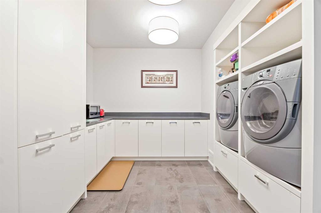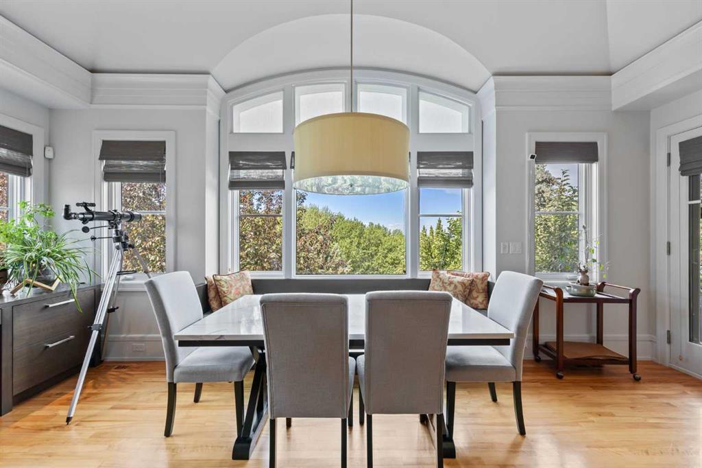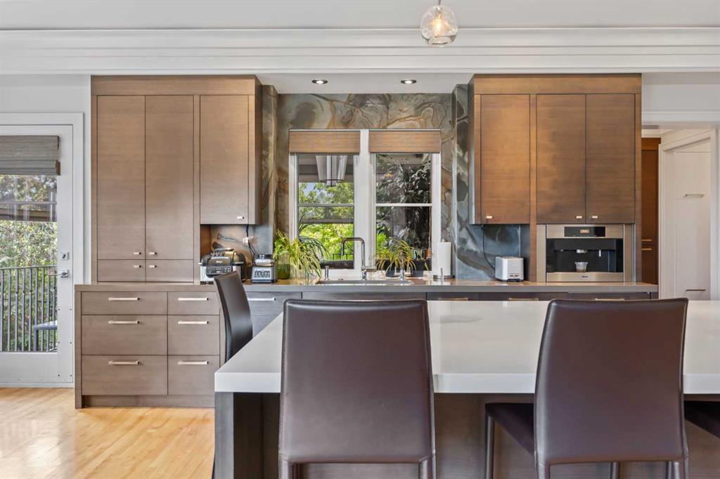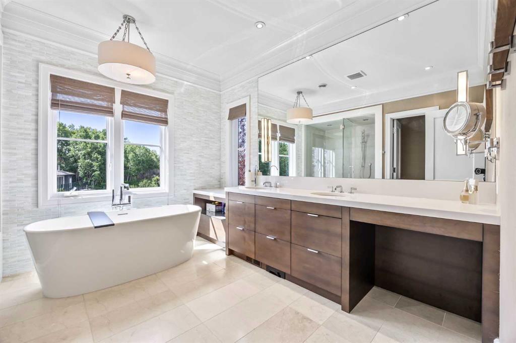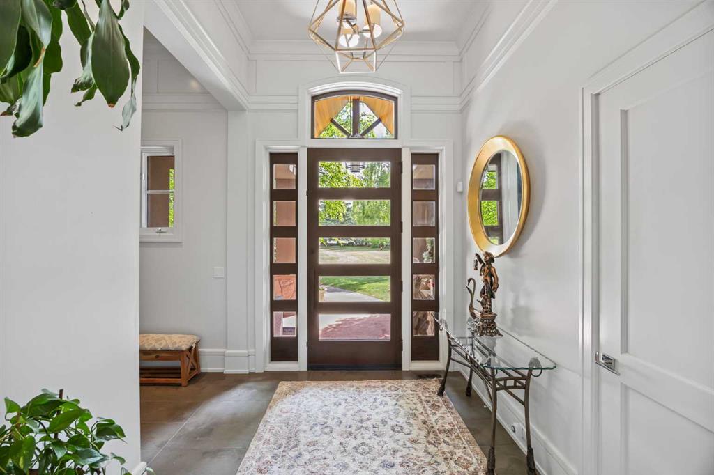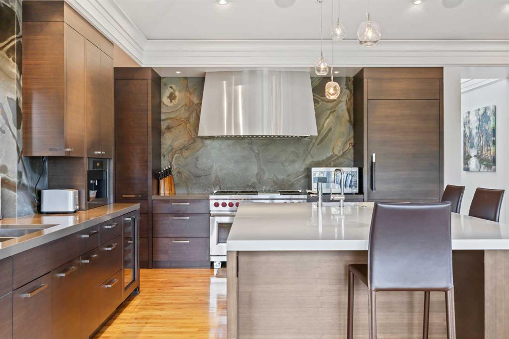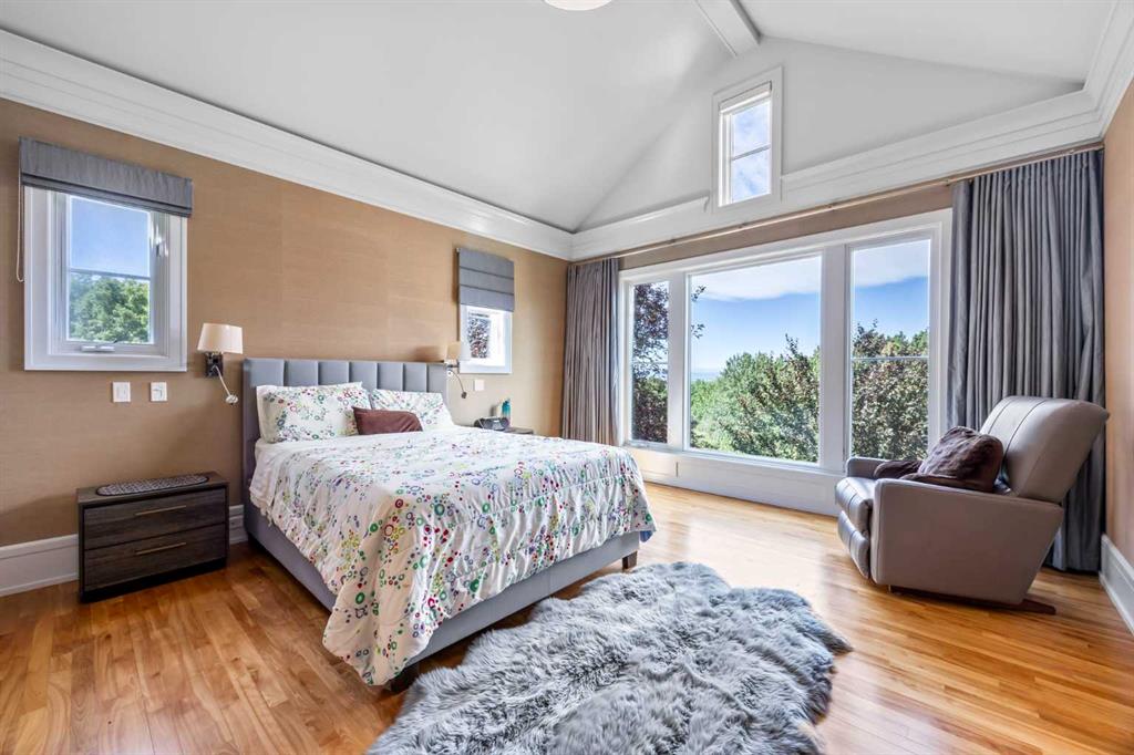 Set on two beautifully landscaped acres at the end of an exclusive Central Springbank cul-de-sac, this extraordinary 3,124 sq ft walkout bungalow enjoys a prime ridge-top position with sweeping views of the Rocky Mountains. Originally custom built by Waterford Homes and extensively renovated by Rockwood Custom Homes, this one-of-a-kind residence offers over 6,000 sq ft of refined living space that blends timeless elegance with family functionality. The home features 5 bedrooms, 6 bathrooms, 3 gas fireplaces, and a private home office. Every detail reflects premium craftsmanship—from soaring vaulted ceilings and rich millwork to heated limestone flooring and superior architectural elements. A new roof was installed in 2022, adding further peace of mind. The designer kitchen is a chef’s dream, equipped with a Wolf 6-burner gas stove and steam oven, Sub-Zero fridge, Thermador stand-up freezer, Miele espresso machine, and two built-in dishwashers. A striking basalt slab backsplash, expansive quartz island, and custom cabinetry create a space that’s as functional as it is stylish. A double-sided fireplace adds warmth and charm to both the kitchen and adjacent living space. Entertain with ease in the formal dining room, enhanced by arched windows and exquisite wood detailing, or dine on the fully covered west-facing patio—complete with vaulted timber ceilings, commercial-grade heaters, and phantom screens for year-round enjoyment. The luxurious primary suite includes a private office nook with a dual-sided fireplace, built-in shelving, a spacious walk-in closet, and a spa-inspired 6-piece ensuite with heated floors, steam shower, and Toto automatic toilet. The bright and open walkout basement offers endless possibilities with its floor-to-ceiling windows, radiant heated limestone floors, and a full wet bar featuring a Miele fridge and freezer. This level also includes three additional bedrooms, two full bathrooms, and ample space for a home theatre, gym, or games room. Additional features include air conditioning, a private pickleball/tennis court, hot tub, outdoor fire pit, fenced dog run and dog wash, oversized 4-car garage, and a built-in media system throughout. This ridge-top gem offers unparalleled privacy, mountain views, and high-end comfort—all just minutes from city conveniences.