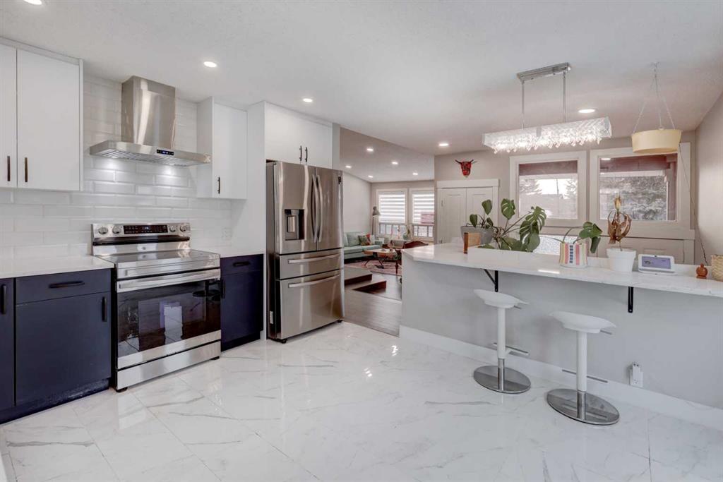 Beautifully maintained and fully renovated single-family home located in the well-established NW community of Ranchlands, close to schools, playgrounds, shopping, LRT, and all amenities. Fully remodeled approximately 3 years ago with extensive upgrades throughout. The main level features a modern island kitchen with quartz countertops, upgraded stainless steel appliances, breakfast nook, and a separate dining area overlooking the living room. The open concept living room offers vaulted ceilings, large windows, and a cozy fireplace. Several windows have been replaced, and others had glass panels updated in recent years. The spacious primary bedroom includes a remodeled 4-piece ensuite and large closet. A second bedroom and updated 3-piece bathroom complete the main floor. The fully finished basement with direct garage access features a third bedroom with large windows, brand-new 3-piece bathroom, and a large recreation room with fireplace and new windows. Enjoy the private backyard with matured trees, a brand-new 350 sq. ft. two-tier, low-maintenance deck. Additional upgrades include new roof shingles, new electrical and plumbing fixtures, engineered flooring, fresh paint, new doors, trims, baseboards, and three fully renovated bathrooms. Move-in ready and a must-see!