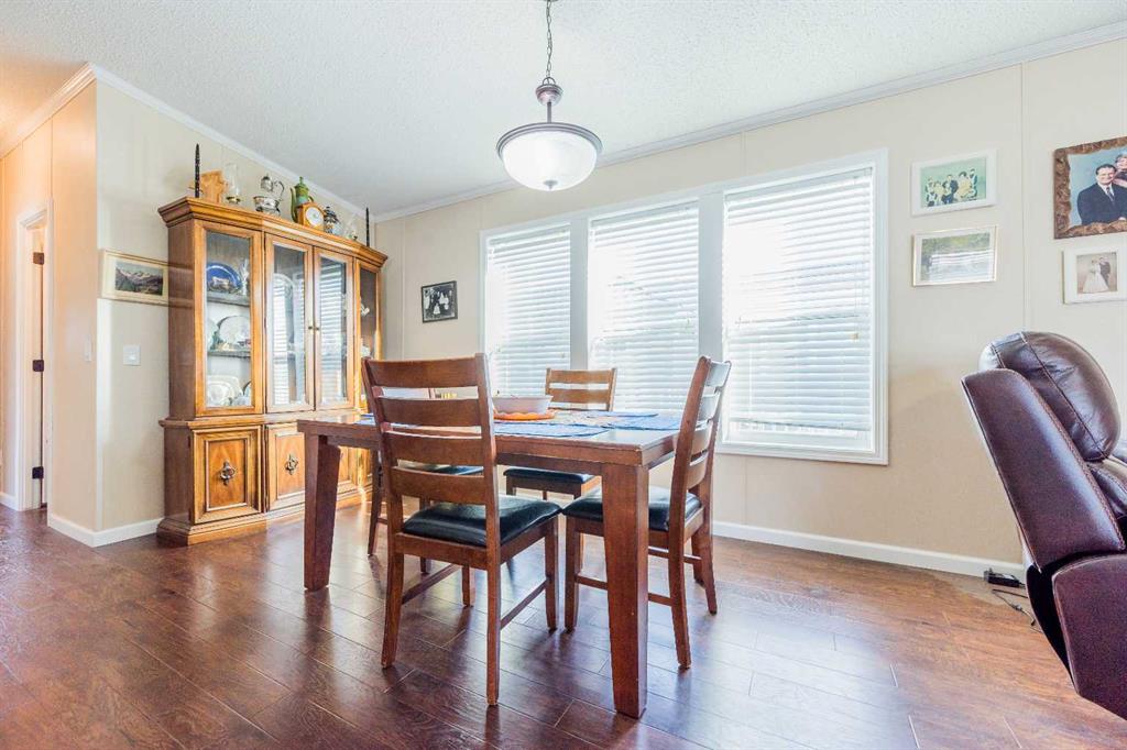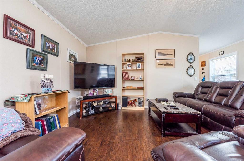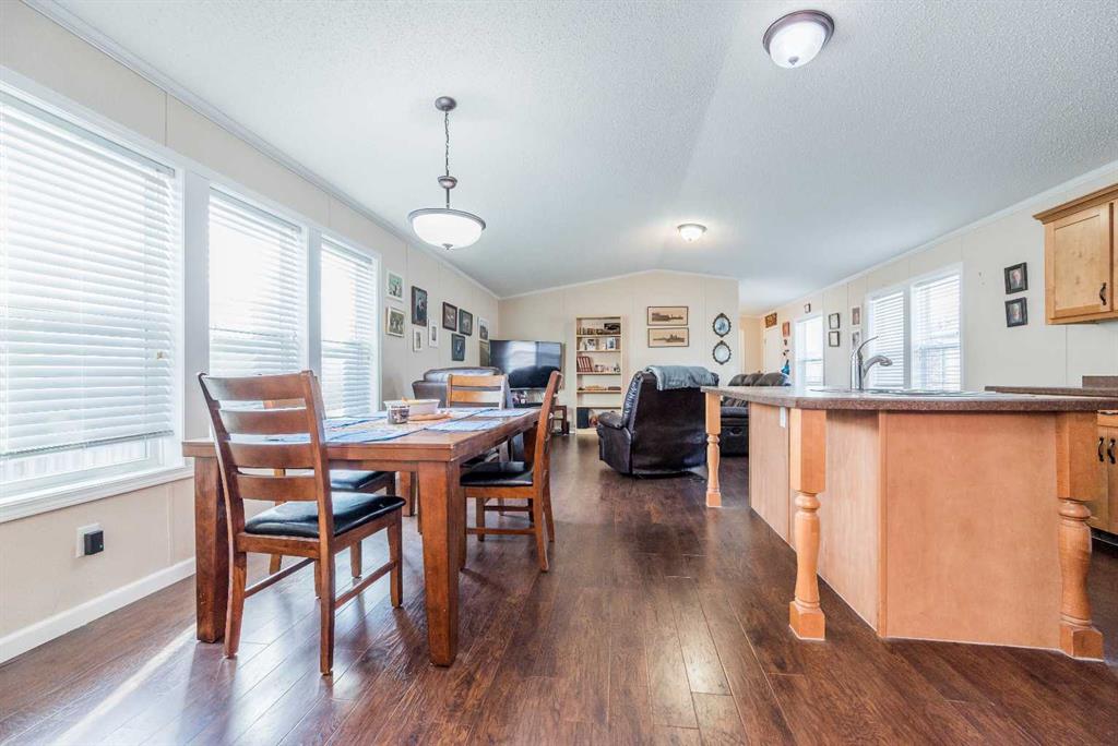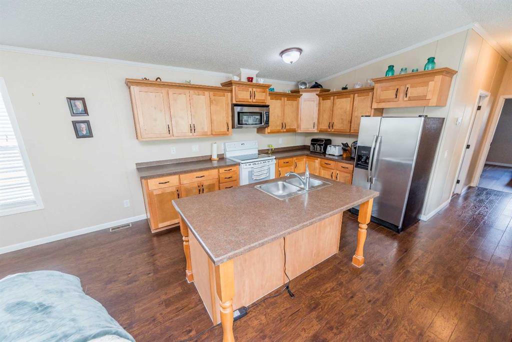 NEW PRICE! - NO REAR NEIGHBORS!!! Step inside this spacious and rare 4-bedroom, 2-bathroom home and instantly feel the warmth of its open and inviting layout. The kitchen is a true standout — featuring a large island with the dishwasher conveniently built in, a massive walk-in pantry, and a microwave that doubles as a hood range fan. Triple windows in the dining area fill the space with natural light, creating a bright and airy atmosphere throughout. Enjoy the outdoors with a spacious deck and a shed behind the home making it perfect for relaxing or entertaining. A convenient shed provides extra storage for toys, tools, or all your summer and winter gear. Located in one of Grande Prairie’s most sought-after mobile home communities, you’ll be just minutes from schools, parks, and amenities. Homes like this, don’t come up often. Don’t miss your chance to make it yours!