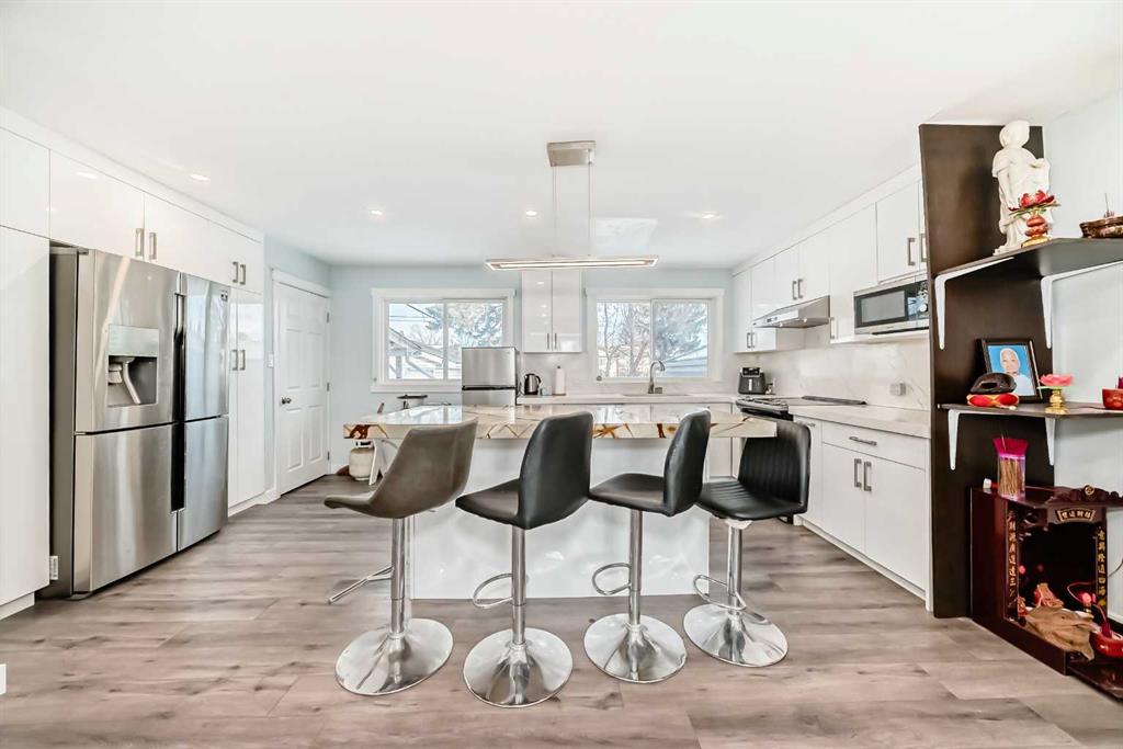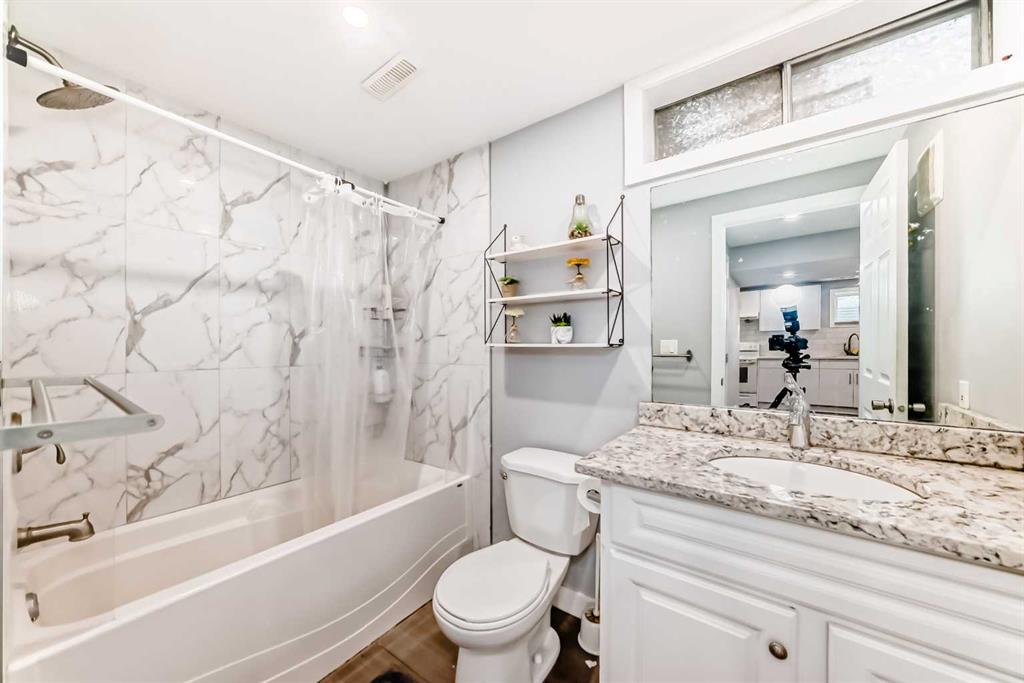 Welcome to this beautifully updated open-floor-plan bungalow featuring a bright open-concept living room, 3 bedrooms on the main level, and a renovated 4-piece bathroom with quartz countertop. Newer windows, Hotwater tank, high efficiency furnace. The home offers laminate flooring throughout, with tile flooring in the basement bathrooms & basement entrance for easy clean, modern finish. The stylish kitchen includes stainless steel appliances and quartz countertops, with all bathrooms fully renovated and upgraded with quartz surfaces. The lower level features a 2-bedroom illegal suite with a 2pc ensuite bathroom and another 4 pcs bathroom and its own private laundry, providing excellent versatility and income potential. Enjoy the private patio, double detached garage, and a fully fenced, landscaped yard. Ideally located within walking distance to schools and the LRT station, with quick access to Deerfoot Trail & Memorial Drive, this home delivers comfort, convenience, and value.
