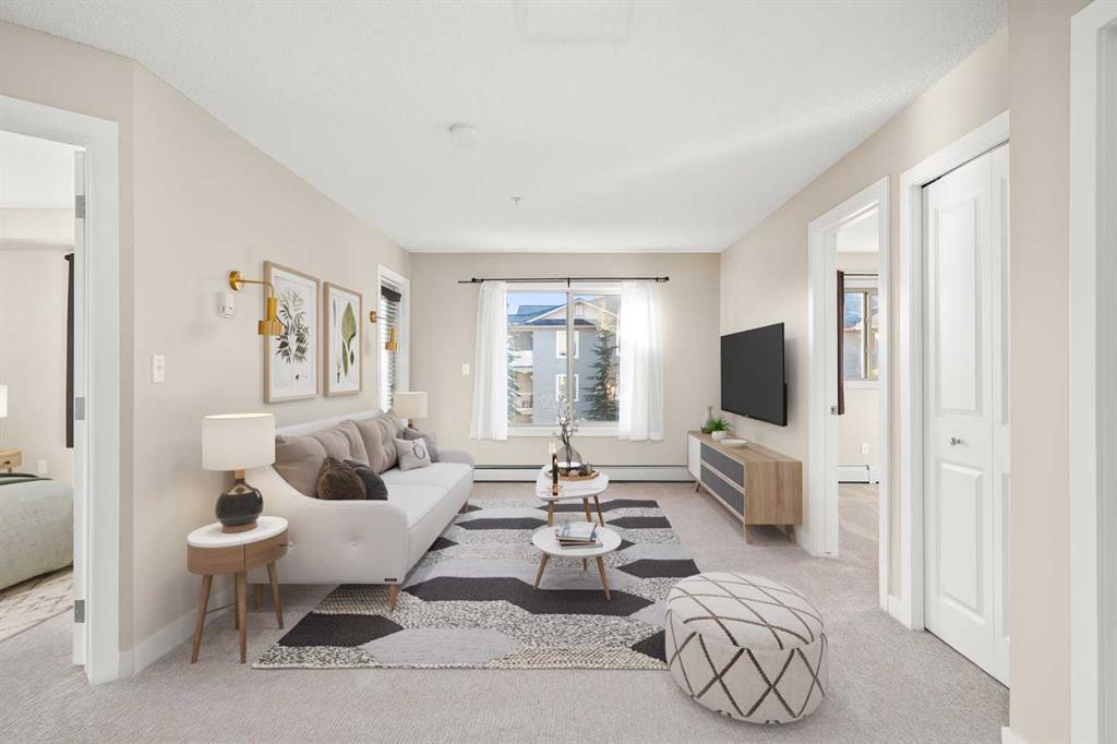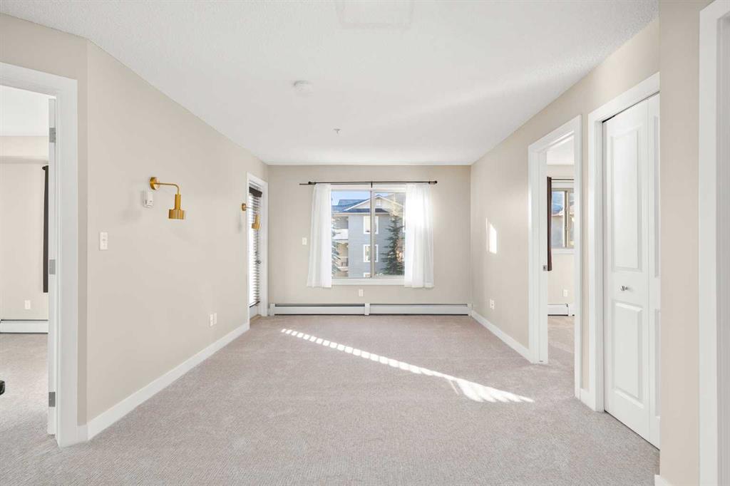 Attention first-time home buyers, down-sizers and investors! This 761 sq ft, 2 BEDROOM, 2 BATH, CORNER UNIT CONDO is AFFORDABLE AND MOVE-IN READY with FRESH PAINT AND BRAND NEW CARPET. Upon entering, you are greeted by an open-concept design. To the right, is a flex space that could be used as a dining area, an office or for your favorite hobby. A front closet, a 4 piece bathroom and in-suite laundry complete this corner of the condo. To the left, the kitchen offers modern cabinetry, granite counter tops, trendy black/stainless steel appliances and a sit-up eating area and is open to the bright living room. On one side of the living room is the main bedroom featuring a walk-through closet and a 4pc ensuite. The second, good-sized bedroom is located on the opposite side of the living room. The living room is bright and welcoming. Step out the living room door onto your covered balcony which is a great place to barbeque, relax or entertain. The complex is PET FRIENDLY, allowing one dog or cat. This condo is complete with one underground, heated, titled parking spot and visitor parking is available outside the main doors. Creekside Crossing condo building is conveniently located in the center of Airdrie and is close to shopping, Nose Creek walking trails, Iron Horse Park and all that downtown Airdrie has to offer. Easy access to highway QE2. Call your favorite realtor today to view.