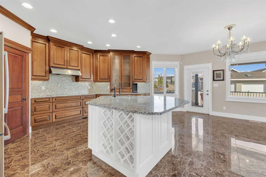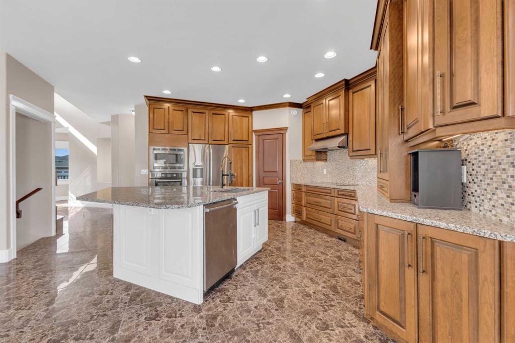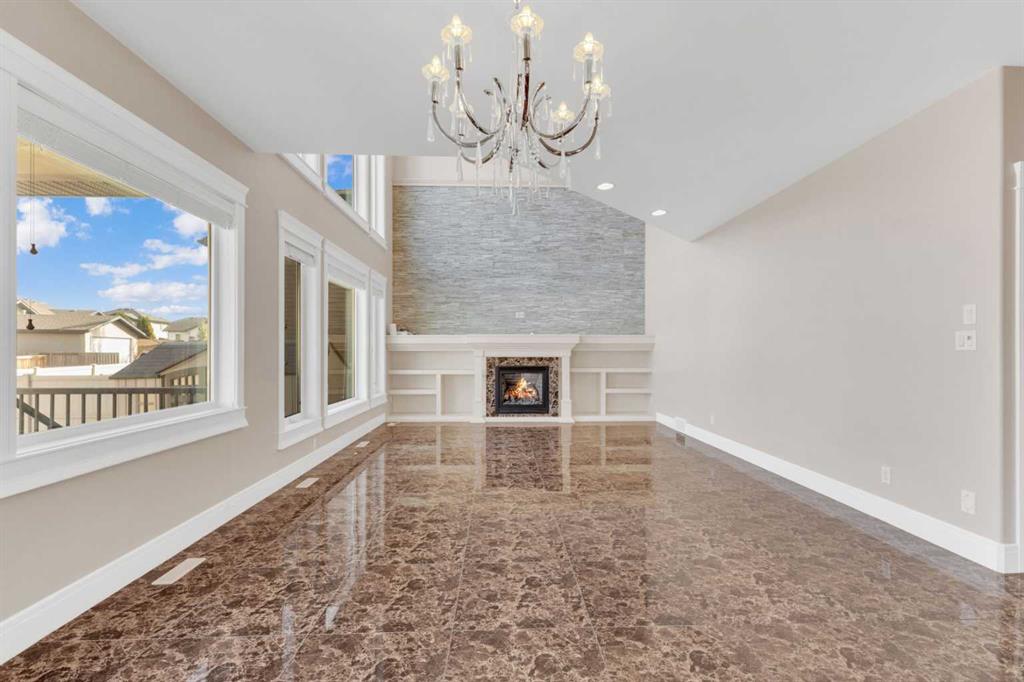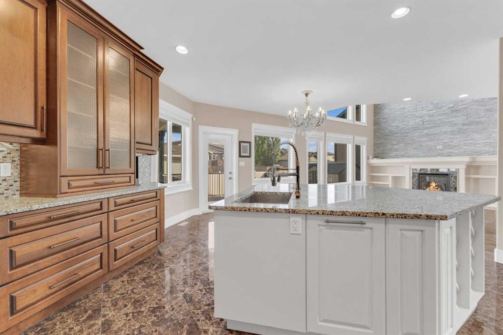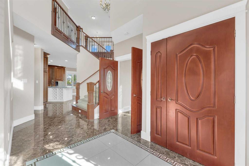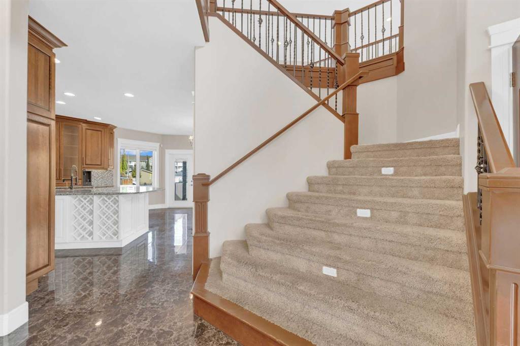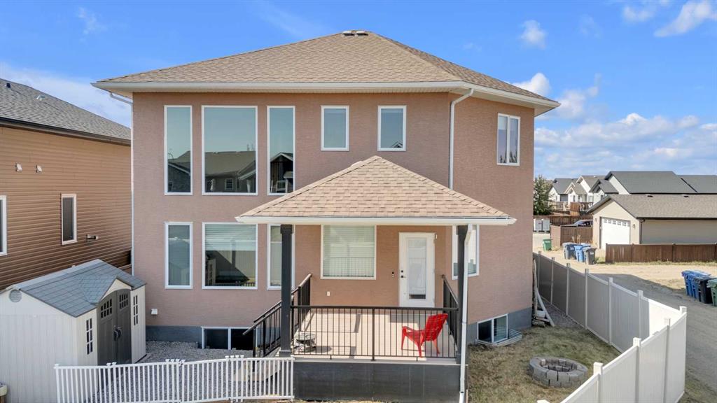 Welcome to 3 Trump Place—an exceptional, fully developed executive home located in one of Red Deer’s most desirable, private closes. This 4-bedroom plus den, 3.5-bathroom residence is the perfect blend of timeless elegance and modern design, offering superior craftsmanship and luxurious details throughout. From the moment you arrive, the curb appeal is undeniable. The grand double iron doors open into a dramatic two-storey foyer adorned with granite flooring and an abundance of natural light. The attention to detail is immediately evident in the custom finishings, upscale materials, and thoughtful layout designed for both family living and entertaining. The chef-inspired kitchen is as functional as it is beautiful, featuring rich cherry wood cabinetry, granite countertops, high-end appliances, and a large island with eating bar. A walk-in pantry, full tile backsplash, and undermount sink elevate the space. The adjoining dining area offers access to the covered deck and beautifully landscaped backyard, perfect for outdoor gatherings. The open-concept great room is anchored by a floor-to-ceiling stone fireplace flanked with custom maple shelving, creating a warm and inviting atmosphere. A private main-floor office with French doors, a convenient 2-piece powder room, and a spacious laundry room with built-in cabinetry and a sink complete the main level. Upstairs, the spacious bonus room overlooks the main living area, while the serene primary suite offers vaulted ceilings, large windows, a walk-in closet with built-ins, and a spa-like ensuite featuring a soaker tub, oversized tiled shower, double vanity, and separate water closet. Two additional bedrooms and a beautifully appointed full bathroom are also located on the upper level. The fully finished basement features in-floor heat, granite tile flooring, 9-foot ceilings, a large family room with wet bar, fourth bedroom, a separate den, and a full bathroom. This level adds both comfort and flexibility to suit your family's needs. Additional highlights include air conditioning, built-in sound wiring and high speed cat 5 wiring for high speed gaming etc., solid wood doors, premium light fixtures including chandeliers, and a heated, finished double garage. The backyard is fully fenced with vinyl, offers back-alley access, and includes a firepit area and storage shed. Ideally situated within walking distance to schools, playgrounds, parks, churches, and all the amenities of both Timberlands and Clearview Market Square, this property combines the best of location, luxury, and lifestyle. Homes of this calibre and setting rarely come to market—experience the quality and attention to detail for yourself at 3 Trump Place.