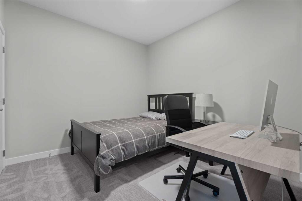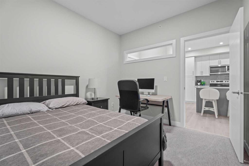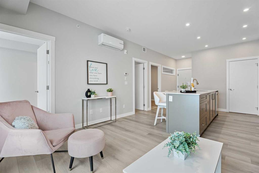 Better Than New in Lawrie Park! Gorgeous new construction without the wait!! Welcome to this gorgeous, upgraded 2 bedroom, 2 bathroom TOP FLOOR condo in the desirable Lawrie Park building in Wedderburn, Okotoks. Still under warranty and loaded with thoughtful upgrades, this home blends comfort, function, and style. Step into a bright white kitchen featuring a massive island, quartz countertops, and durable LVP flooring throughout the main living space. The open concept layout is perfect for entertaining or everyday living. Both bedrooms are spacious, with the primary suite offering a full ensuite and great closet space. Extras like in suite laundry, air conditioning, and a large balcony (with mountain views on a clear day!) overlooking the dog park make this home even more appealing, especially in a pet friendly building! You'll also enjoy the convenience of a heated underground parking stall, separate storage locker, and low condo fees. Located in vibrant Wedderburn, you're close to walking paths, schools, and exciting new commercial development. This condo truly feels better than new, move in and enjoy maintenance free living at its finest!