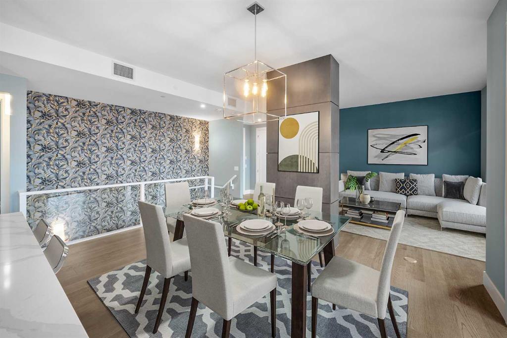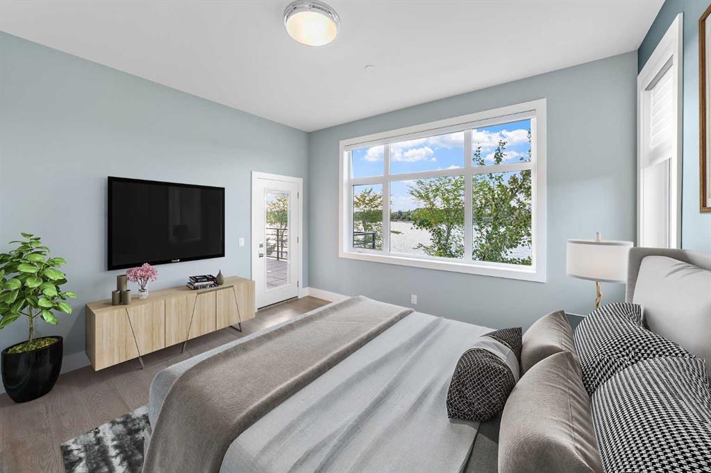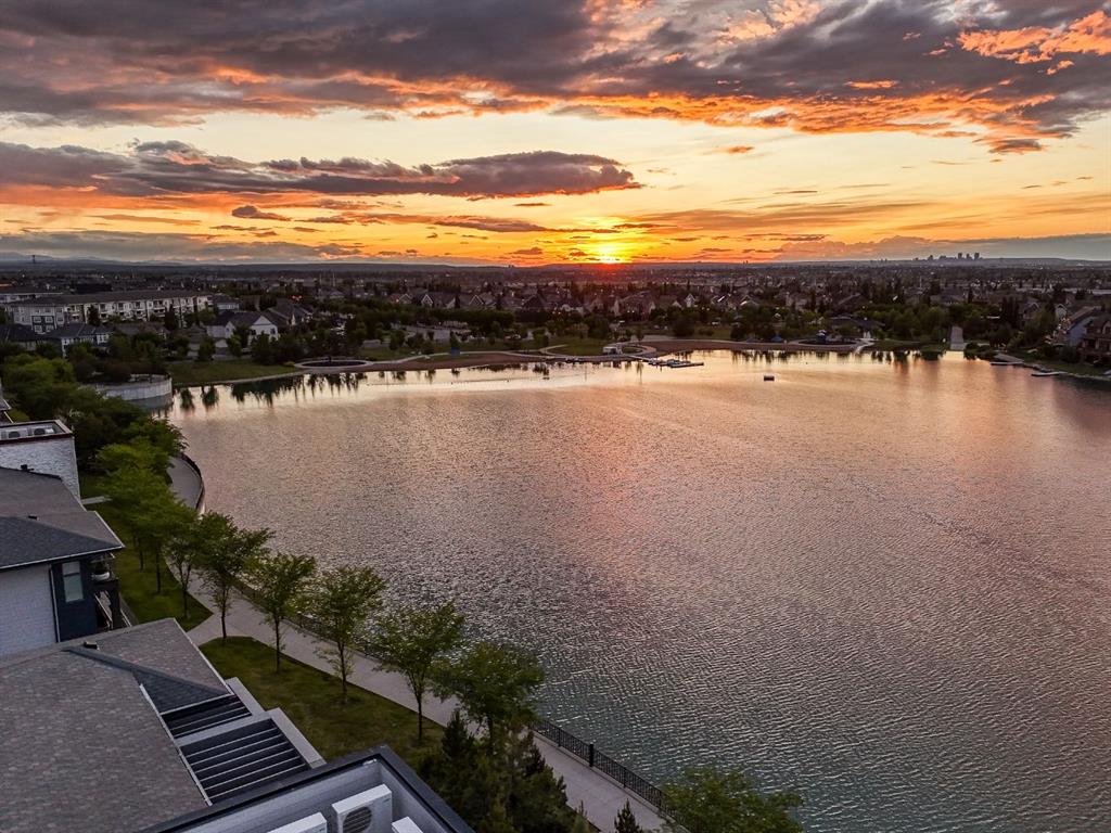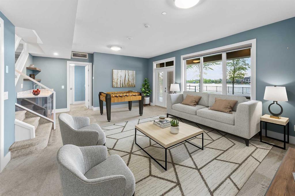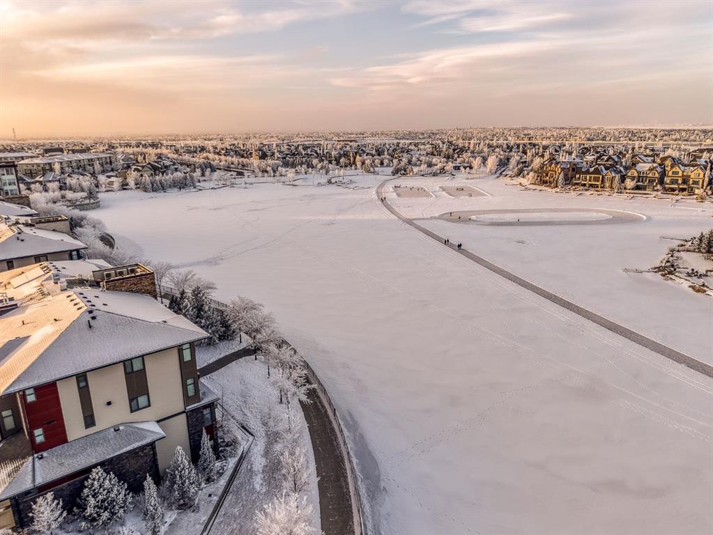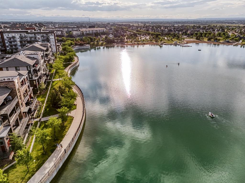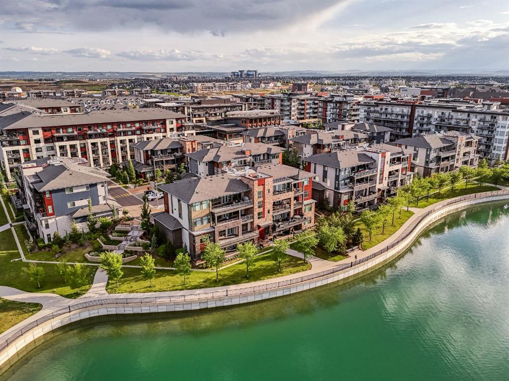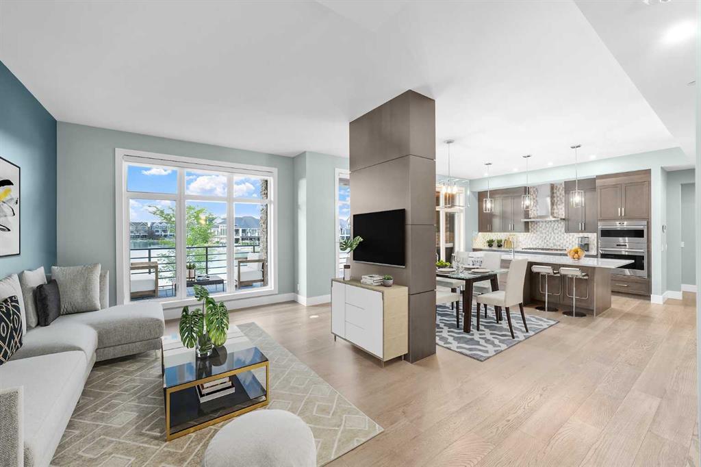 Welcome to an exceptionally rare lakefront residence in Westman Village, where intentional multi-level design elevates both privacy and livability. Perfectly positioned along the shores of Mahogany Lake, this sophisticated walkout home offers over 2,380 sq ft of thoughtfully separated living space, paired with an extraordinary 725 sq ft of covered outdoor balconies—all with uninterrupted lake views from both levels. Designed with purpose, the multi-level layout creates natural zones for living, entertaining, and retreat. The main level is devoted to elevated everyday living—anchored by a stunning chef’s kitchen featuring bold cabinetry, a gas cooktop, built-in wall ovens, premium appliances, and curated designer finishes. Expansive walls of glass flood the open-concept living and dining areas with natural light, while the lake becomes a living backdrop for hosting, relaxing, and gathering. The primary suite is intentionally positioned for privacy, offering a true retreat away from the main living spaces. Here, direct balcony access and a spa-inspired five-piece ensuite—complete with a deep soaker tub, dual vanities, walk-in shower, and refined detailing—create a sanctuary designed for rest and rejuvenation. The walkout lower level introduces a second living experience—ideal for guests, family, or extended stays. With direct access to the lakefront pathways and parks, this level functions as a private lounge, guest retreat, or flex space that seamlessly connects indoor comfort with outdoor serenity. It’s a layout that offers the feel of a luxury home with the ease of condominium living. Living in Westman Village means enjoying a lifestyle that is as refined as it is effortless. Residents have exclusive access to a 40,000 sq ft private amenity centre, featuring a fitness studio, indoor pool with waterslide, golf simulator, wine room, art studio, movie theatre, and more. Just steps away, world-class dining and retail—including Chairman’s Steakhouse, Alvin’s Jazz Lounge, and Analog Coffee—bring a vibrant, walkable energy to everyday life. This is true lock-and-leave luxury, enhanced by 24/7 concierge and security, heated underground parking for residents and guests, and an integrated +15 skywalk and underground tunnel system—ensuring comfort, privacy, and peace of mind year-round. For those who value intentional design, defined spaces, and elevated living, this multi-level lakefront residence offers a lifestyle that feels both expansive and intimate. A statement in architectural purpose, refined living, and unparalleled lakefront location—this is Westman Village living, elevated.