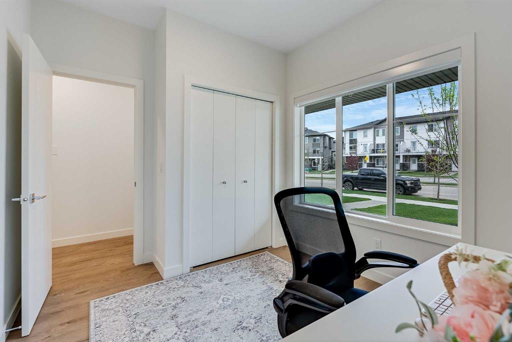 Welcome to 302, 6 Merganser Drive—PET FRIENDLY unit! Discover this stunning, 3-storey townhouse, perfectly located in the friendly neighbourhood of Chelsea in Chestermere. With 1600 SFT of beautifully designed living space, this home features 4 bedrooms and 2.5 baths, offering versatility and comfort for all households. The 4th bedroom, located on the main floor, is perfect as a home office, gym, or yoga room, making it ideal for gig workers or anyone seeking a dedicated workspace. A gorgeous kitchen showcasing quartz countertops, sleek stainless steel appliances, a double-door pantry with ample shelving, modern light fixtures, and an island with storage that accommodates 3-4 bar stools. The open-concept layout seamlessly connects the kitchen to the dining area, which fits a table for 8, and the living space, all bathed in natural light. Step out onto the huge south-facing balcony to enjoy the scenery, host barbecues with friends, or relax with your morning coffee or an evening glass of wine. Upstairs, you’ll find two generously sized bedrooms with a shared bath, along with a spacious primary retreat that easily fits a king bed. This private sanctuary boasts stunning mountain views, a luxurious ensuite, and a modest walk-in closet. Convenience meets practicality with upstairs laundry. This home is complete with thoughtful details, including luxury vinyl plank blond flooring, modern light fixtures, and a fully insulated & HEATED double-car attached garage. The garage also includes hidden storage for skis, outdoor toys, or christmas decorations plus a convenient spigot for washing vehicles or gear. Parking is a breeze with additional space in front of the unit. Located in a pet-friendly condominium community with low condo fees, this property offers exceptional access to Stoney Trail, Costco, golf courses, parks, and top-rated schools. Whether you’re a first-time homebuyer, a growing family, or someone looking to downsize, this townhouse provides the perfect blend of comfort, functionality, and location. Book your showing today!