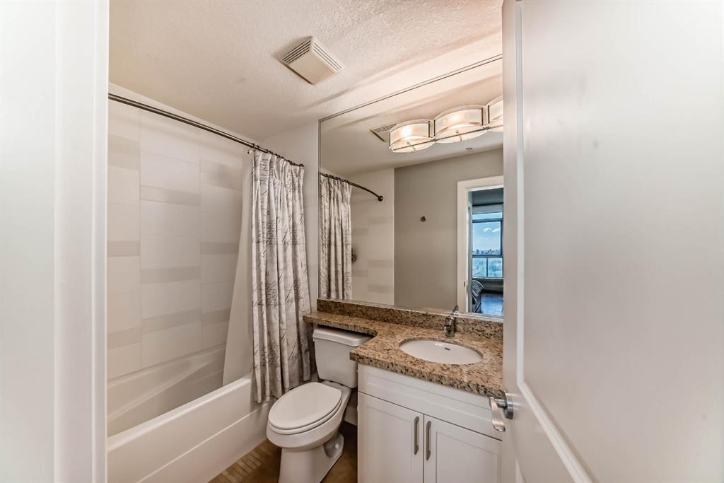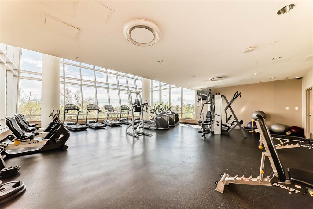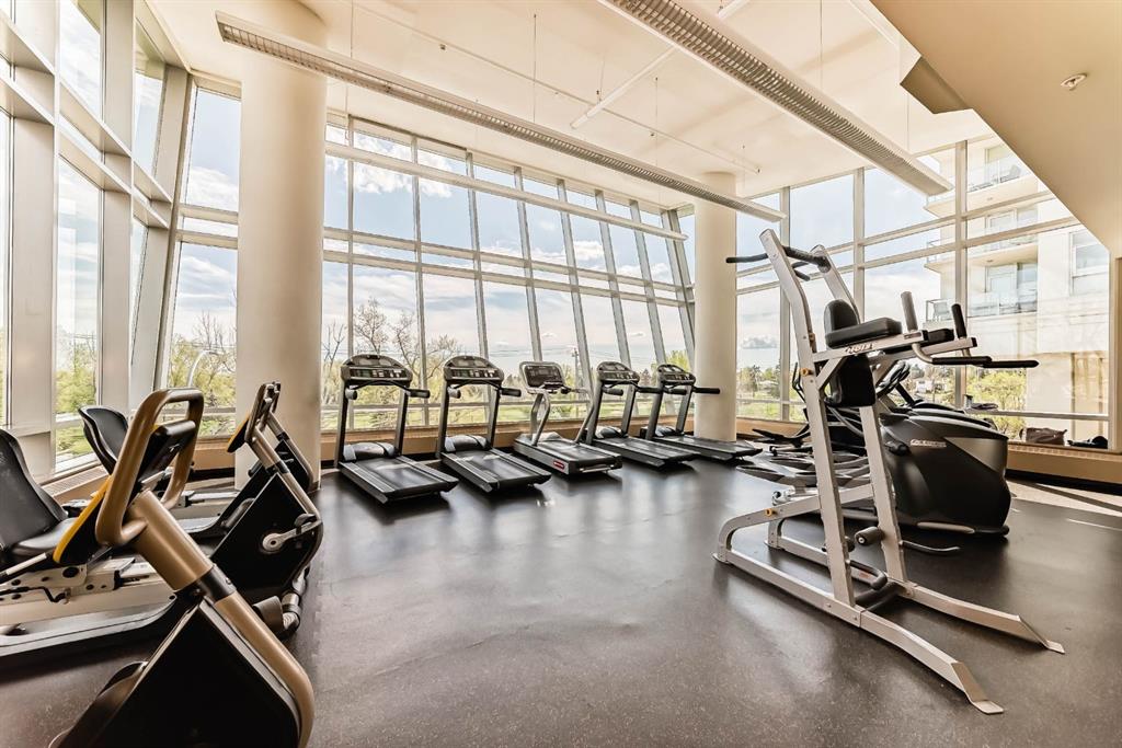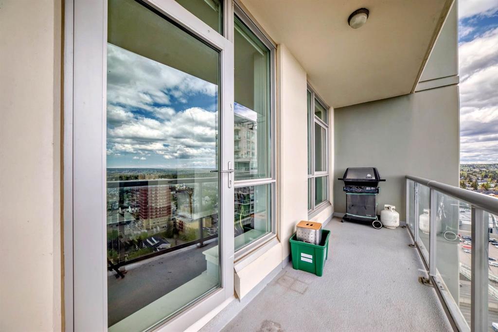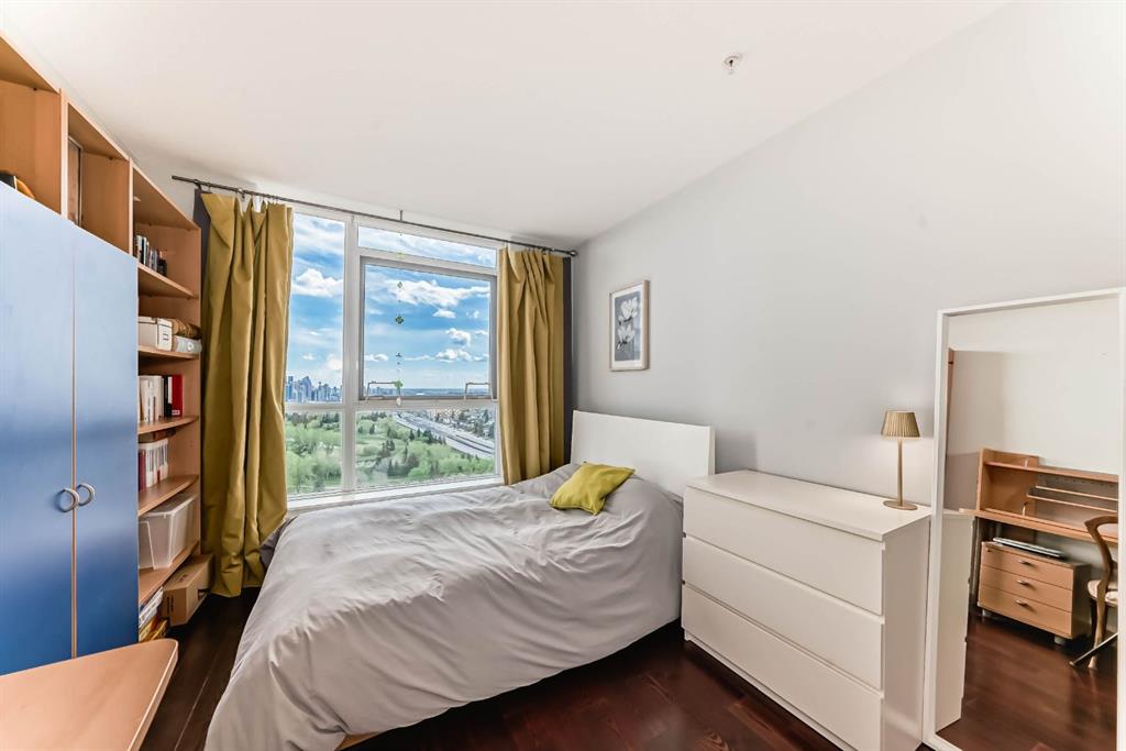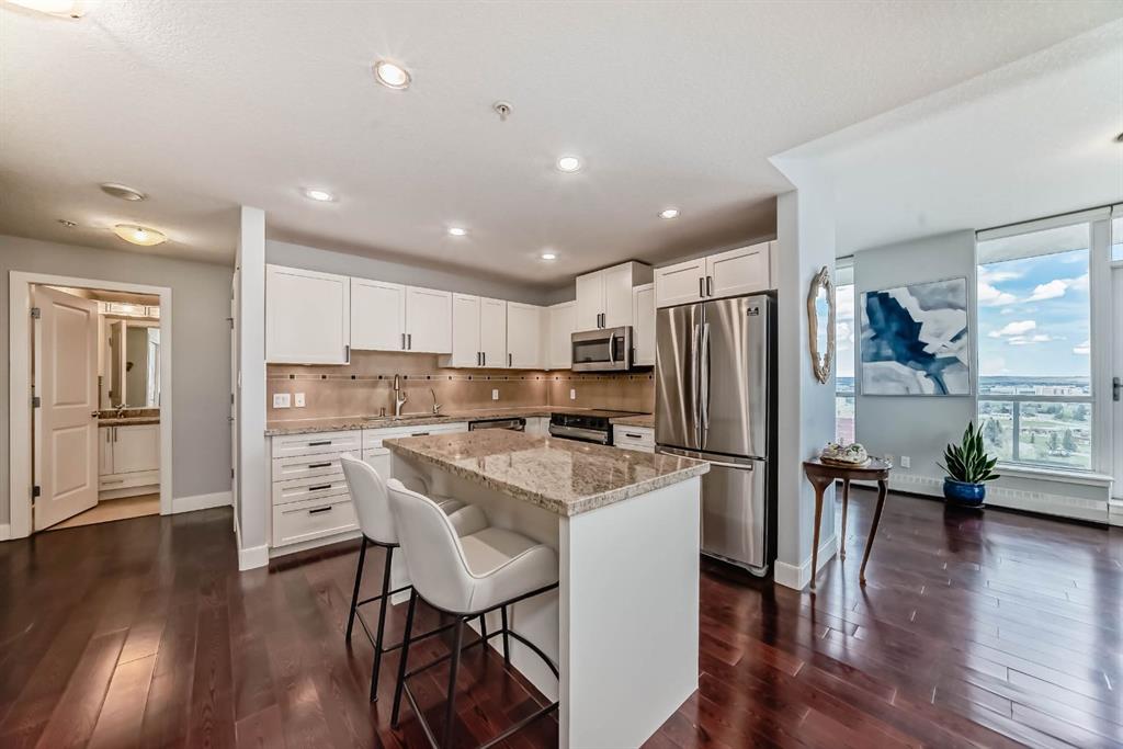 Location, Location, Location! View, View, View! Unbeatable Location with Breathtaking Views of Downtown & Shaganappi Point Golf Course. Spectacular 1,023 sq.ft condo with 2-bedroom plus Den, 2-bathroom unit is designed to impress and provide the ultimate convenience. Experience luxury living in Encore, the entrance unit door with non-disturbing from neighbour, not-side by side, where stunning panoramic city view greet you from the living room, both bedrooms and Two private balconies. This spacious, beautifully maintained unit boasts Newly replaced cabinetry, granite countertops with island in the kitchen and bathrooms, stainless steel appliances, and upgraded hardwood floors. Central air conditioning ensures year-round-comfort, while the two bedrooms plus a den provide ample space for work and relaxation. A cozy corner gas fireplace. Bright with floor to ceiling windows. Enjoy top-tier Amenities, including a large indoor pool, hot tub, fully equipped gym, game room, and on-site caretakers. With full-time security, titles underground heated parking, and a storage locker, convenience and peace of mind come standard. Ideally located just steps from the C-train station and Westbrook Shopping-mall (featuring Walmart, Safeway, foodcourt...), surrounded by river pathways, Shaganappi Golf Course, and city convenience, this is urban living at its finest. Don't miss this opportunity and schedule your private viewing today!