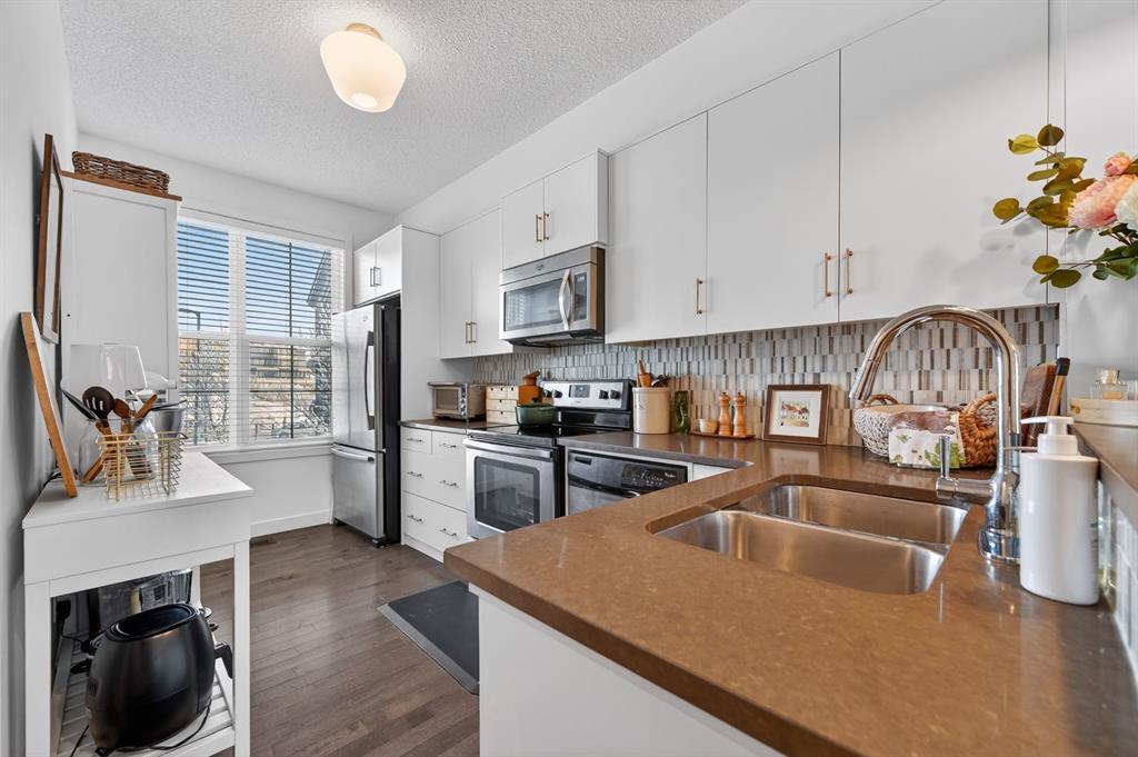 Welcome to this beautifully updated townhome in The Enclave, a sought-after complex nestled in the heart of Castle Keep. Perfectly positioned on the west side of Aspen Woods, this home offers the best of both worlds—peaceful surroundings with the convenience of Aspen Landing, Blush Lane, and everyday amenities just a short walk away. Tucked away from the main road, this unit enjoys a sunny west-facing balcony, filling the home with natural light throughout the day. The main floor features rich hardwood flooring, stainless steel appliances, and a bright, open-concept layout ideal for both everyday living and entertaining. The kitchen has been tastefully refreshed with a crisp white colour palette, complemented by new lighting, fresh paint, and new carpet throughout. Upstairs, the thoughtful dual primary bedroom layout offers two spacious bedrooms, each with its own ensuite, along with convenient upper-level laundry. The quality of finishing throughout the home is evident and beautifully maintained. The double tandem garage provides ample room for two vehicles or additional storage, adding to the home’s functionality. Set in a serene and walkable location, you’ll love being close to nature pathways, charming coffee spots, and quick access to the mountains for weekend escapes. All of this—and offered at the best price in Castle Keep! Call today for your private showing!