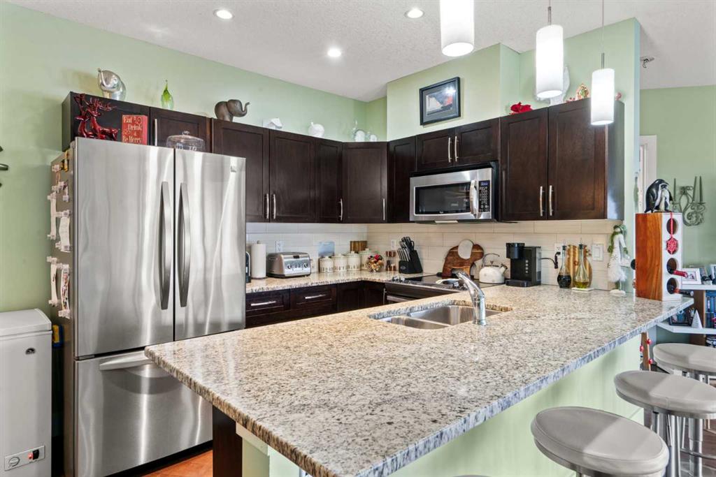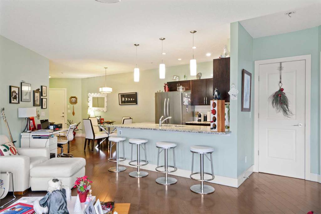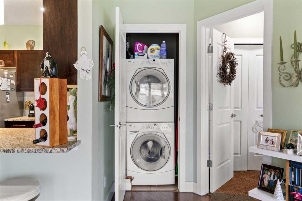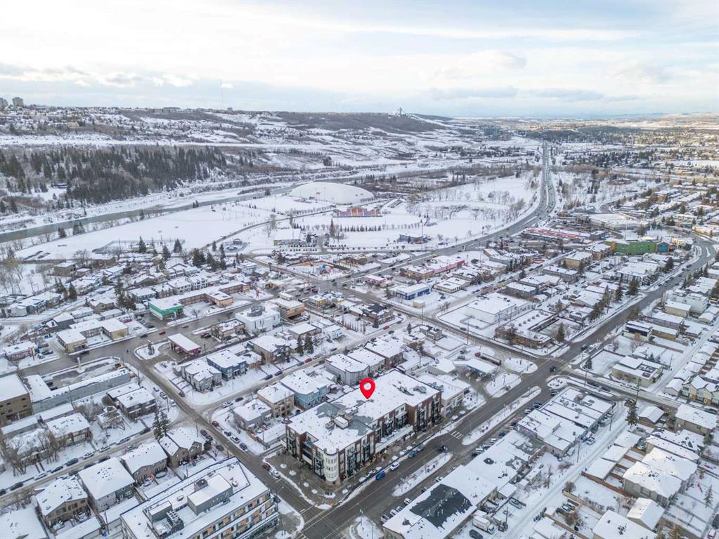 Enjoy breathtaking southwest views from this spacious 1,031 sqft two-bedroom, two-bathroom condo in the desirable Montgomery Place. With nine-foot ceilings, engineered hardwood floors, and in-floor heating, the home combines elegance with modern comfort. The open-concept living and dining area is perfect for hosting, featuring a kitchen with granite countertops, a peninsula island, stainless steel appliances, and a striking backsplash. Pot lights in the kitchen add a contemporary touch, while the stacked washer and dryer provide convenient in-suite laundry. This Montgomery condo unit is stunning and both bedrooms are generously sized. The two full bathrooms feature beautiful granite countertops. Step out onto the large southwest-facing balcony with a gas BBQ hook-up and enjoy sunny afternoons with stunning views. Central air conditioning ensures year-round comfort, and the recently replaced fridge and range complement a unit where the paint has been redone and the walls, along with the entire home, have been meticulously cared for. The combination of hardwood and carpet flooring adds warmth and style, and the parking stall is conveniently located right by the elevator. This prime location puts you just steps from extensive bike paths, Edworthy Park, and the Bow River, with Children’s and Foothills Hospitals nearby. Shops and all amenities are close at hand, including NOTABLE – The Steakhouse, Market Mall just five minutes away, and Safeway only two minutes from your door. Downtown Calgary is 15 minutes away, Bowness Park 10 minutes, and the mountains are easily accessible, making this condo ideal for anyone seeking a modern, comfortable home with massive bedrooms, open-concept living, and spectacular southwest views.