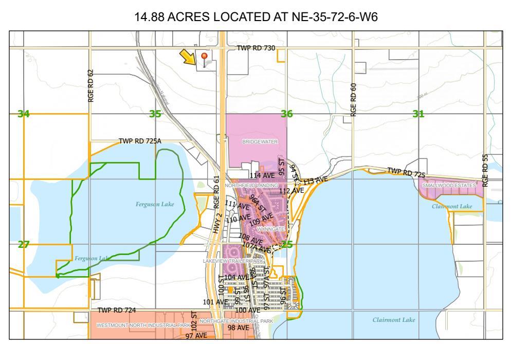 14.88 acres of RM2-zoned commercial land with prime Highway 2 frontage, offering exceptional exposure and accessibility. This elevated site on Mercer Hill provides some of the best panoramic views in the Peace Country, along with outstanding visibility for your business. Conveniently located just 5km north of Grande Prairie, with easy access to both Highway 43 and Highway 2, the property is well-positioned for a variety of rural medium industrial. Minimal gravel road travel, with only 220 meters from Highway 2 to the property entrance. An added benefit is $15,000 in annual oil revenue, which this contract is fully transferable to the new owner. Opportunity awaits—secure this highly visible commercial site and build your future business today. Contact your Commercial Realtor® today! Note: Property taxes are subject to change since the levy is a specific grandfathered farmland usage rate.