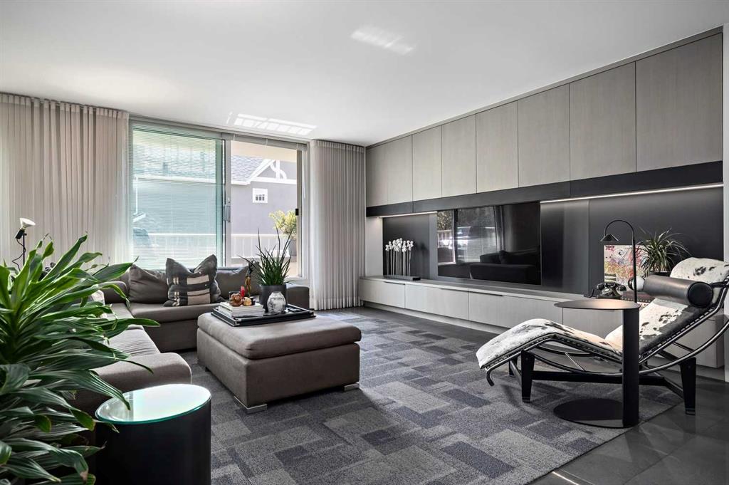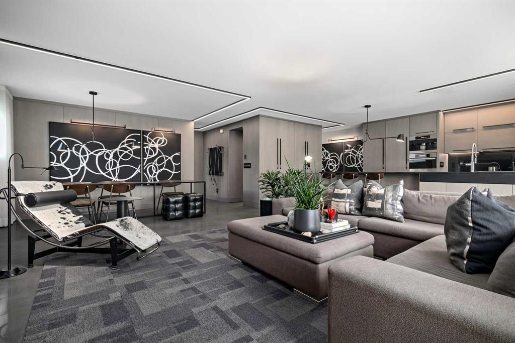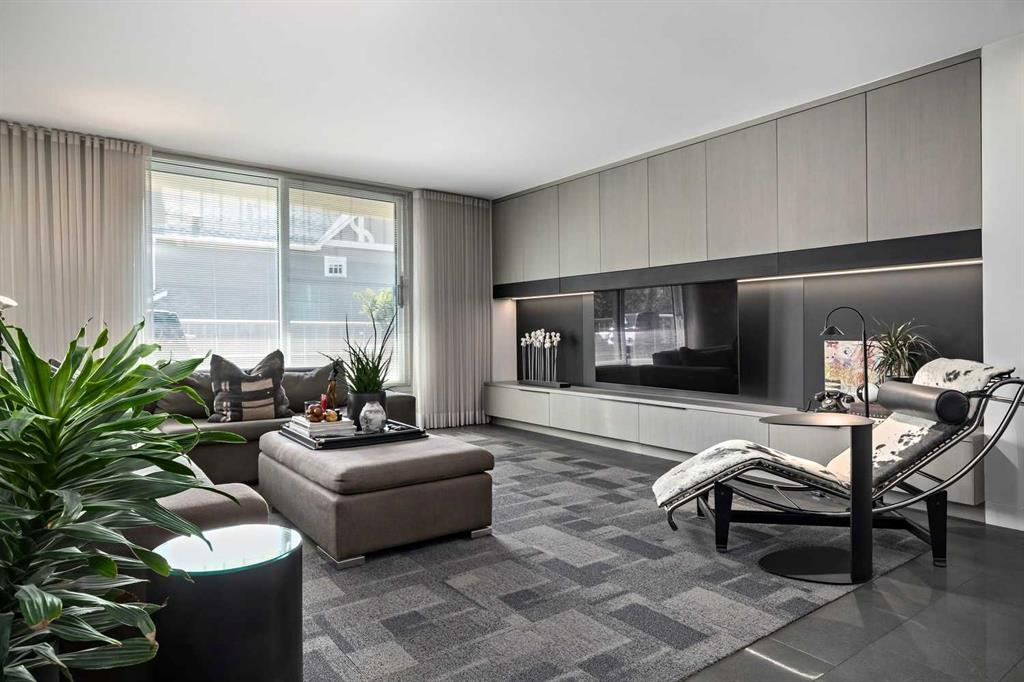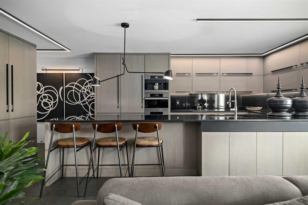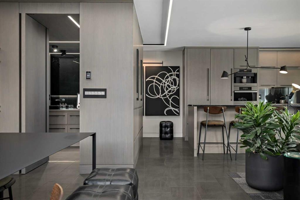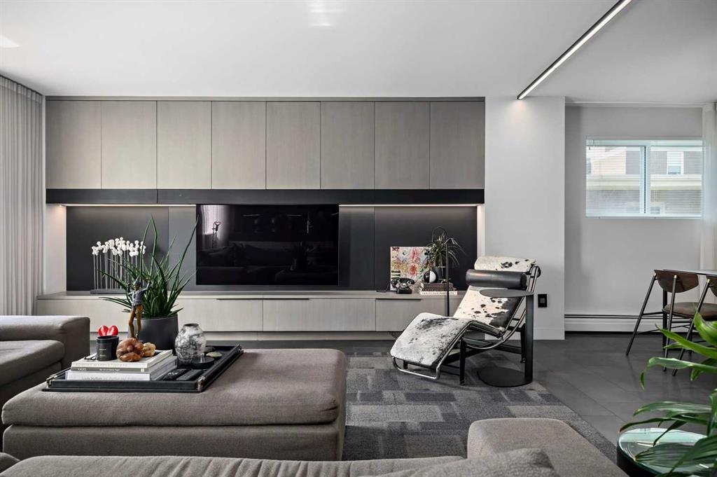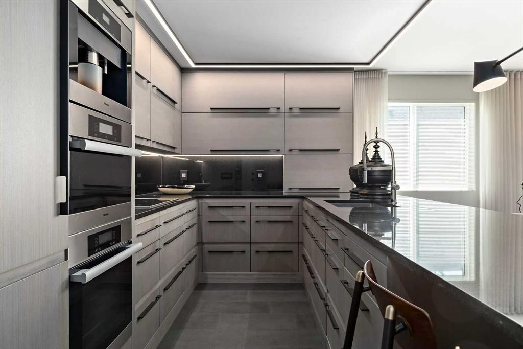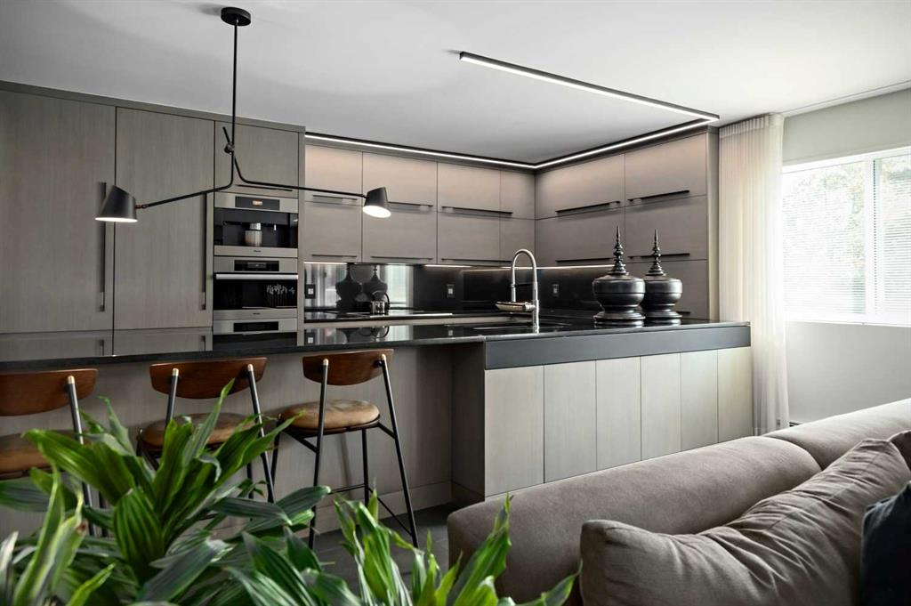 An unprecedented offering in Calgary’s prestigious Mount Royal. Welcome to Palace Royale — a mid-century modern icon of concrete construction, meticulously revitalized with a new roof, boiler, elevator, and a fully restored exterior envelope. Perfectly poised steps from vibrant shops, galleries, cafés, and the downtown core, this residence fuses architectural pedigree with cosmopolitan living at its finest. Formerly a two-bedroom, the residence has been masterfully reimagined into a grand one-bedroom with an opulent dining salon — a bold design statement that can easily be converted back to 2 bedroom, if desired. Every inch of this 1,009 sq. ft. interior radiates luxury, with more than $300,000 invested in finishes and technology of uncompromising quality. The chef’s kitchen is a triumph of form and function: reconstructed oak millwork, striking black granite surfaces, and a fully integrated Miele ensemble — including built-in coffee station, steam and wall ovens, dishwasher, 32” induction cooktop with concealed Faber hood, and freestanding refrigerator/freezer. This is a kitchen designed not merely for cooking, but for performance. The living space is both dramatic and intimate, defined by architectural millwork, black glass accents, and LED illumination. Hidden at first glance, entertainment unfolds with a motorized 65” drop-down television, James Loudspeakers, subwoofer, and six-zone surround sound — transforming the room into a private cinema. The primary suite is pure indulgence: wall-to-wall wardrobes, a custom platform bed with integrated storage, leather-padded headboard accented with linear LED lighting, and a discreetly incorporated 55” television with Bluesound audio. The ensuite rivals world-class spas with bespoke cabinetry, a sculptural black-glass shower, Kohler fixtures, and a soaring mirror wall. The main bath is equally spectacular, anchored by a double porcelain Lappato tile shower with multiple showerheads encased in glass — an architectural centerpiece rarely seen even in the city’s most exclusive residences. Refinements extend throughout: porcelain Lappato flooring, triple-pane Lux windows, Ripplefold drapery with Hunter Douglas blinds, reverse-osmosis water filtration, soft water system, LeGrand lighting controls, and bespoke foyer millwork concealing pantry, coat, and shoe storage. Step outside to the wraparound south- and west-facing balcony, where lush treetop views give way to the glittering downtown skyline. Complete with a built-in Broil King BBQ and elegant lounge area, it is an outdoor sanctuary unlike any other. A private adjacent storage room and secure underground parking stall elevate both convenience and exclusivity. Palace Royale is more than a home — it is theatre, artistry, and refinement. A singular residence for the connoisseur who demands the exceptional, set within one of Calgary’s most celebrated enclaves.