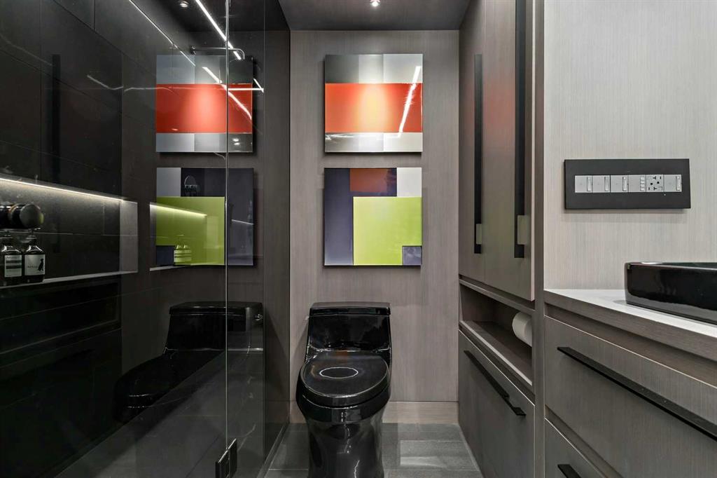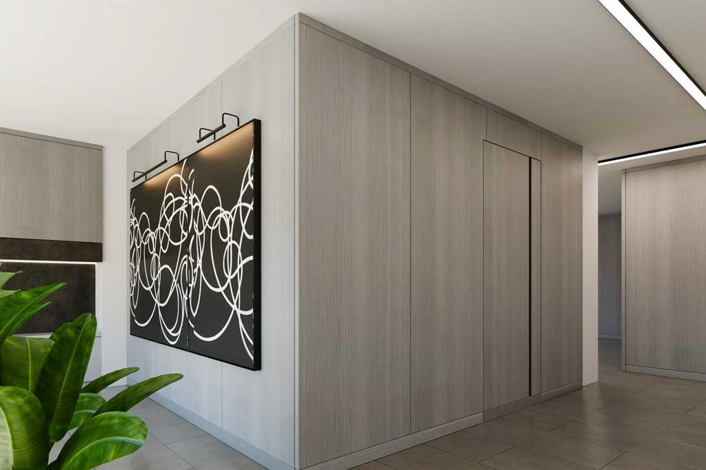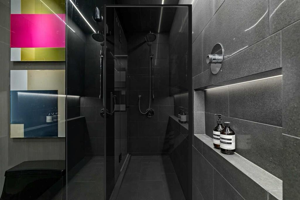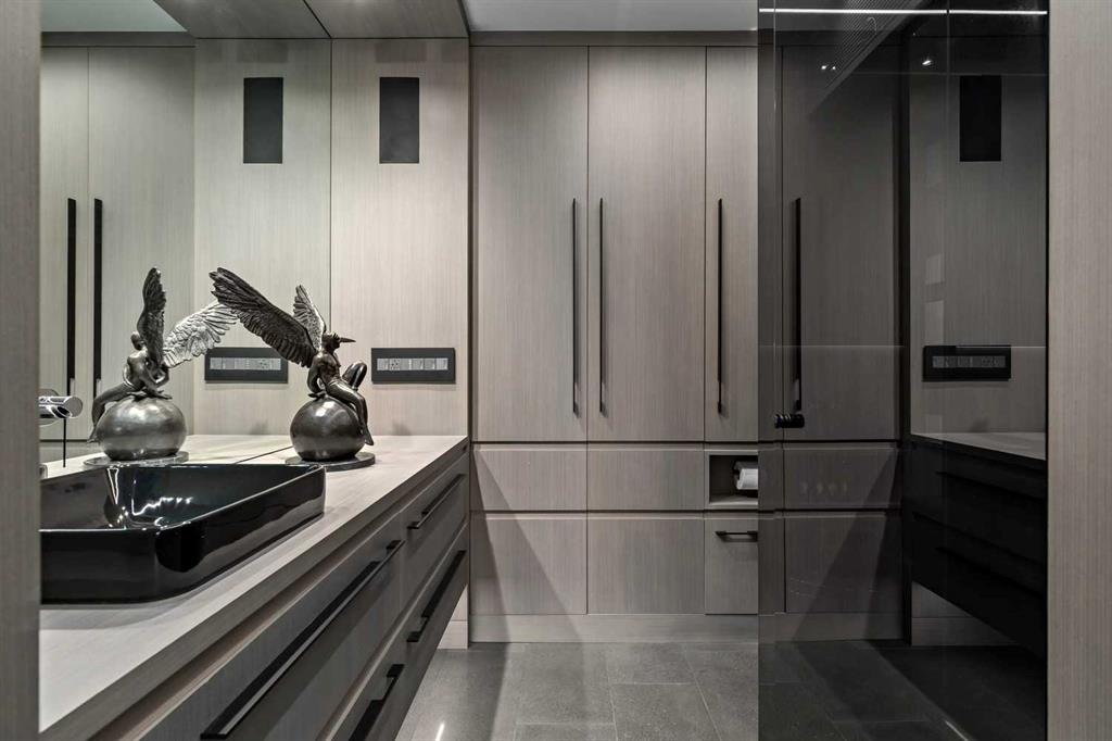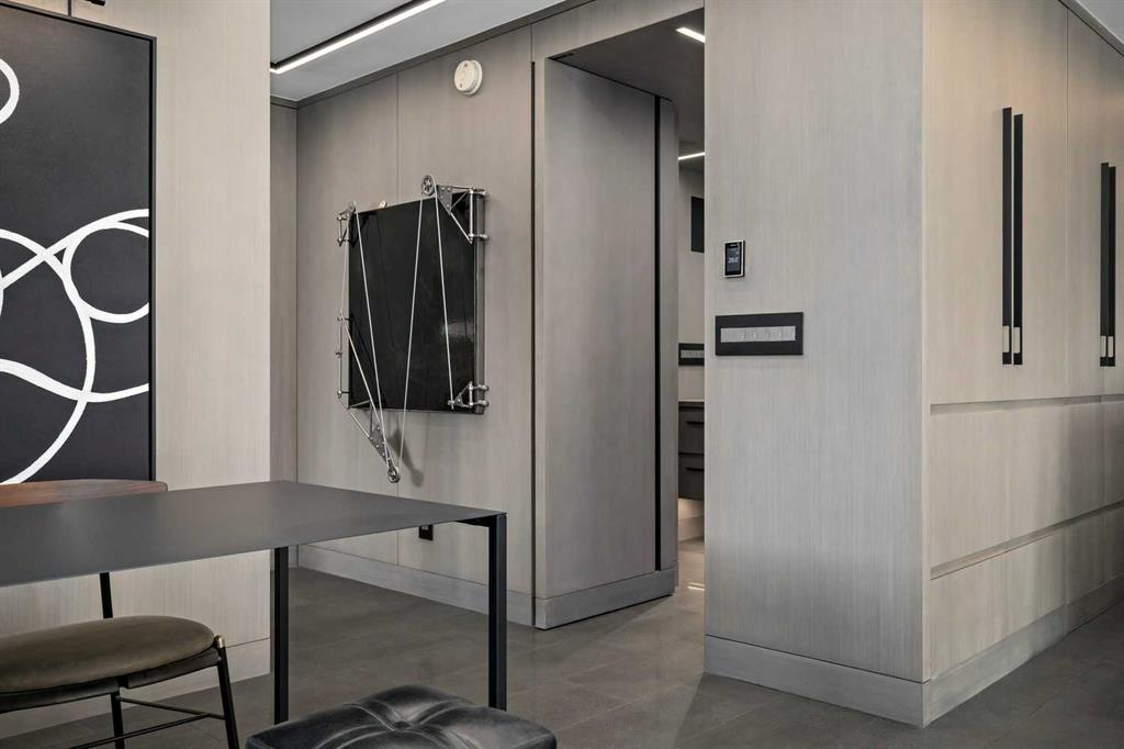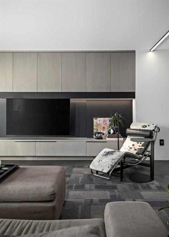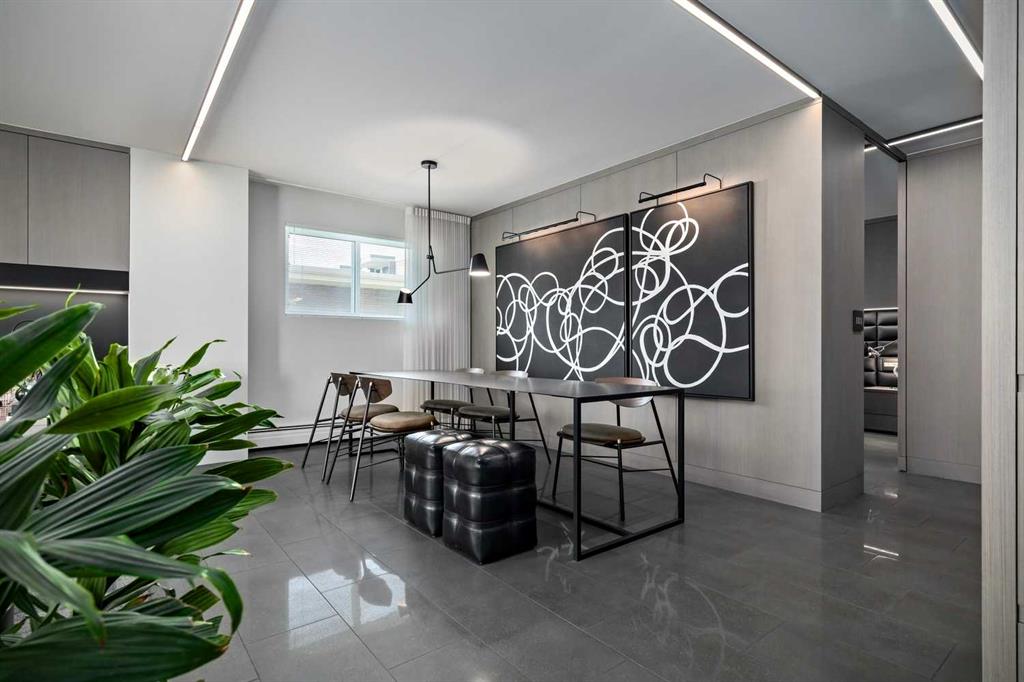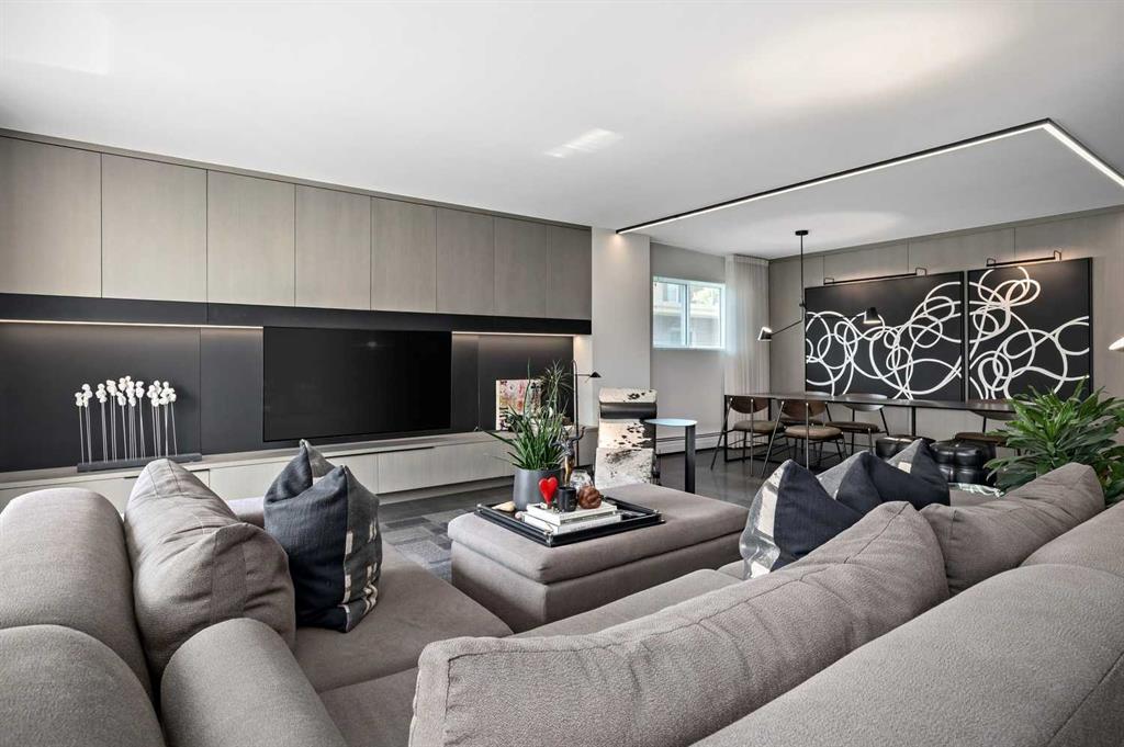 An unprecedented offering in Calgary’s prestigious Mount Royal. Welcome to Palace Royale — a mid-century modern icon of concrete construction, meticulously revitalized with a new roof, boiler, elevator, and a fully restored exterior envelope. Perfectly poised steps from vibrant shops, galleries, cafés, and the downtown core, this residence fuses architectural pedigree with cosmopolitan living at its finest. Formerly a two-bedroom, the residence has been masterfully reimagined into a grand one-bedroom with an opulent dining salon — a bold design statement that can easily be converted back to 2 bedroom, if desired. Every inch of this 1,009 sq. ft. interior radiates luxury, with more than $300,000 invested in finishes and technology of uncompromising quality. The chef’s kitchen is a triumph of form and function: reconstructed oak millwork, striking black granite surfaces, and a fully integrated Miele ensemble — including built-in coffee station, steam and wall ovens, dishwasher, 32” induction cooktop with concealed Faber hood, and freestanding refrigerator/freezer. This is a kitchen designed not merely for cooking, but for performance. The living space is both dramatic and intimate, defined by architectural millwork, black glass accents, and LED illumination. Hidden at first glance, entertainment unfolds with a motorized 65” drop-down television, James Loudspeakers, subwoofer, and six-zone surround sound — transforming the room into a private cinema. The primary suite is pure indulgence: wall-to-wall wardrobes, a custom platform bed with integrated storage, leather-padded headboard accented with linear LED lighting, and a discreetly incorporated 55” television with Bluesound audio. The ensuite rivals world-class spas with bespoke cabinetry, a sculptural black-glass shower, Kohler fixtures, and a soaring mirror wall. The main bath is equally spectacular, anchored by a double porcelain Lappato tile shower with multiple showerheads encased in glass — an architectural centerpiece rarely seen even in the city’s most exclusive residences. Refinements extend throughout: porcelain Lappato flooring, triple-pane Lux windows, Ripplefold drapery with Hunter Douglas blinds, reverse-osmosis water filtration, soft water system, LeGrand lighting controls, and bespoke foyer millwork concealing pantry, coat, and shoe storage. Step outside to the wraparound south- and west-facing balcony, where lush treetop views give way to the glittering downtown skyline. Complete with a built-in Broil King BBQ and elegant lounge area, it is an outdoor sanctuary unlike any other. A private adjacent storage room and secure underground parking stall elevate both convenience and exclusivity. Palace Royale is more than a home — it is theatre, artistry, and refinement. A singular residence for the connoisseur who demands the exceptional, set within one of Calgary’s most celebrated enclaves.
