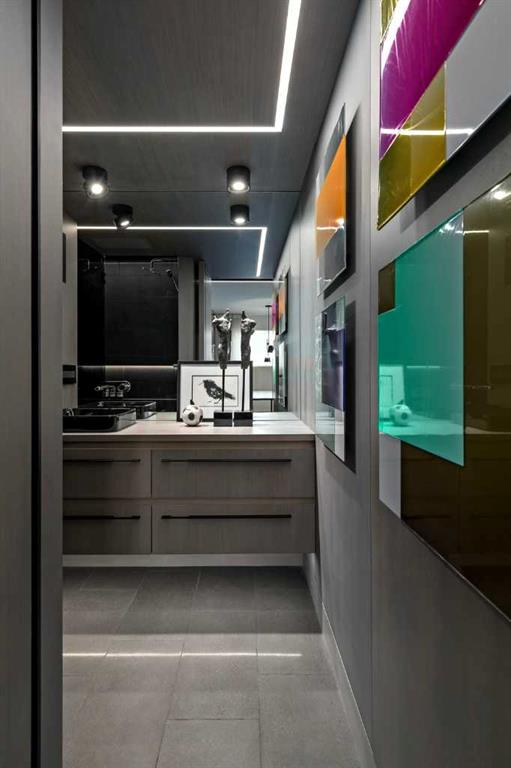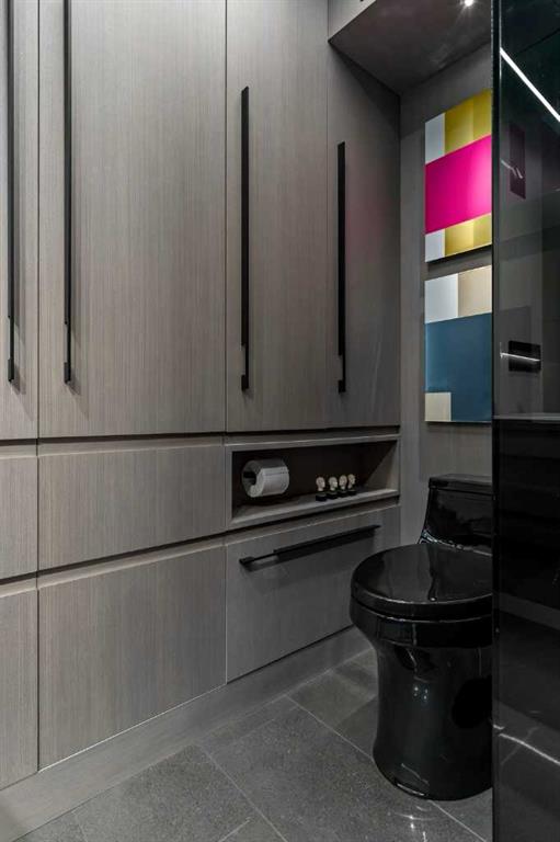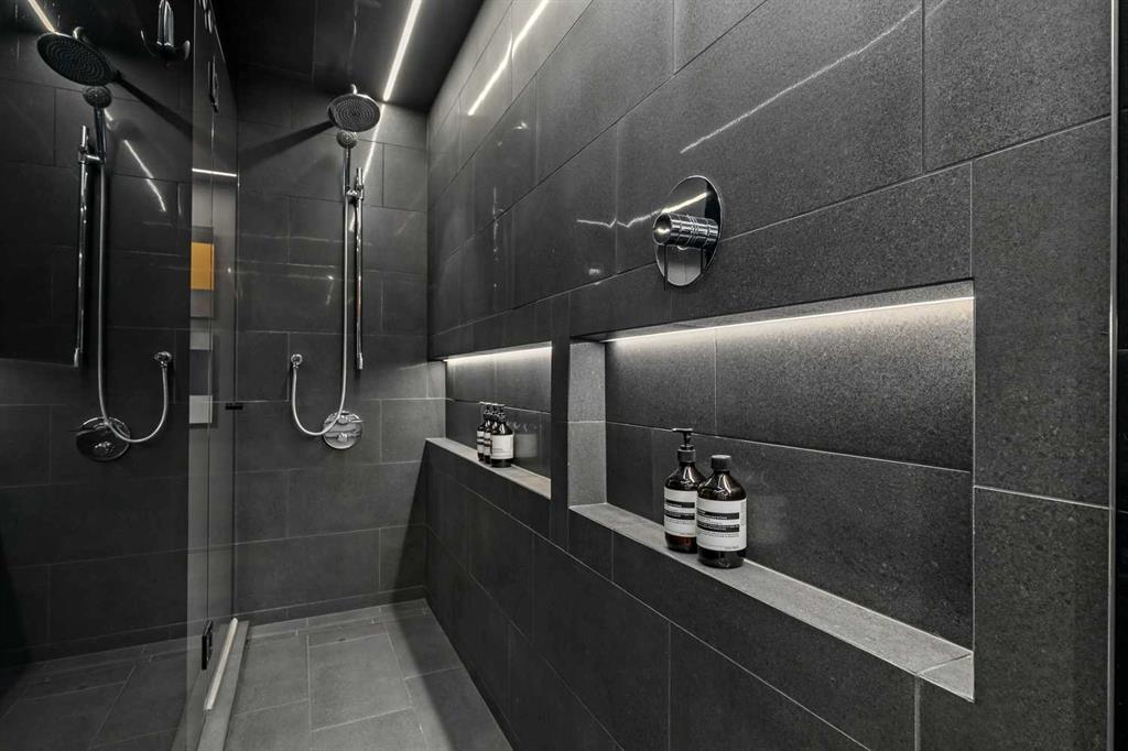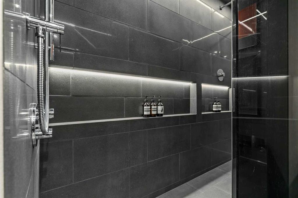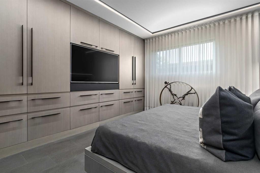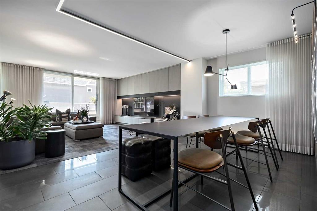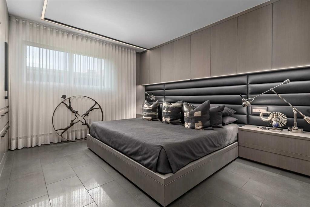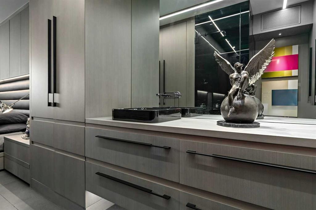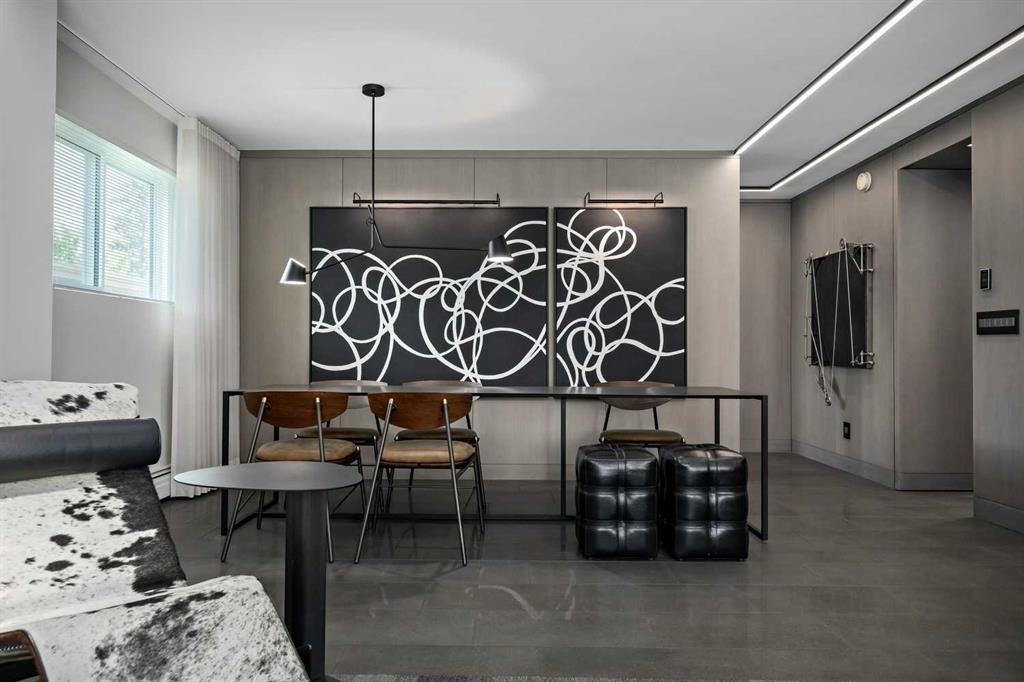 An unprecedented offering in Calgary’s prestigious Mount Royal. Welcome to Palace Royale — a mid-century modern icon of concrete construction, meticulously revitalized with a new roof, boiler, elevator, and a fully restored exterior envelope. Perfectly poised steps from vibrant shops, galleries, cafés, and the downtown core, this residence fuses architectural pedigree with cosmopolitan living at its finest. Formerly a two-bedroom, the residence has been masterfully reimagined into a grand one-bedroom with an opulent dining salon — a bold design statement that can easily be converted back to 2 bedroom, if desired. Every inch of this 1,009 sq. ft. interior radiates luxury, with more than $300,000 invested in finishes and technology of uncompromising quality. The chef’s kitchen is a triumph of form and function: reconstructed oak millwork, striking black granite surfaces, and a fully integrated Miele ensemble — including built-in coffee station, steam and wall ovens, dishwasher, 32” induction cooktop with concealed Faber hood, and freestanding refrigerator/freezer. This is a kitchen designed not merely for cooking, but for performance. The living space is both dramatic and intimate, defined by architectural millwork, black glass accents, and LED illumination. Hidden at first glance, entertainment unfolds with a motorized 65” drop-down television, James Loudspeakers, subwoofer, and six-zone surround sound — transforming the room into a private cinema. The primary suite is pure indulgence: wall-to-wall wardrobes, a custom platform bed with integrated storage, leather-padded headboard accented with linear LED lighting, and a discreetly incorporated 55” television with Bluesound audio. The ensuite rivals world-class spas with bespoke cabinetry, a sculptural black-glass shower, Kohler fixtures, and a soaring mirror wall. The main bath is equally spectacular, anchored by a double porcelain Lappato tile shower with multiple showerheads encased in glass — an architectural centerpiece rarely seen even in the city’s most exclusive residences. Refinements extend throughout: porcelain Lappato flooring, triple-pane Lux windows, Ripplefold drapery with Hunter Douglas blinds, reverse-osmosis water filtration, soft water system, LeGrand lighting controls, and bespoke foyer millwork concealing pantry, coat, and shoe storage. Step outside to the wraparound south- and west-facing balcony, where lush treetop views give way to the glittering downtown skyline. Complete with a built-in Broil King BBQ and elegant lounge area, it is an outdoor sanctuary unlike any other. A private adjacent storage room and secure underground parking stall elevate both convenience and exclusivity. Palace Royale is more than a home — it is theatre, artistry, and refinement. A singular residence for the connoisseur who demands the exceptional, set within one of Calgary’s most celebrated enclaves.