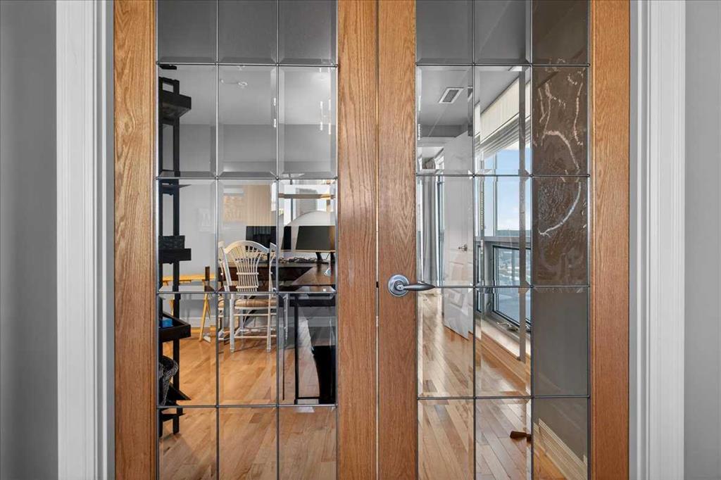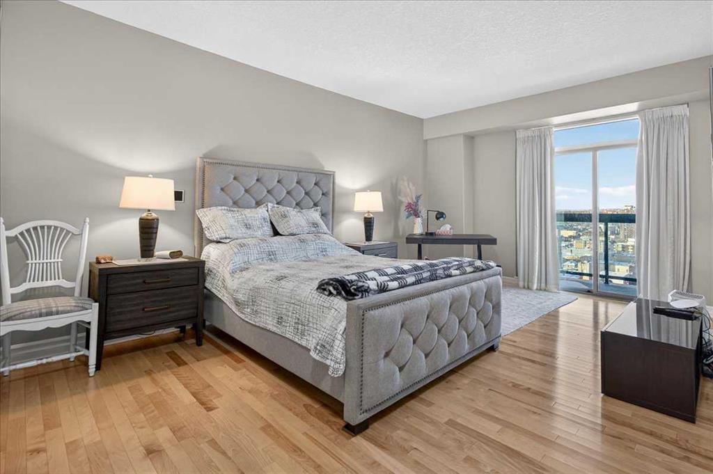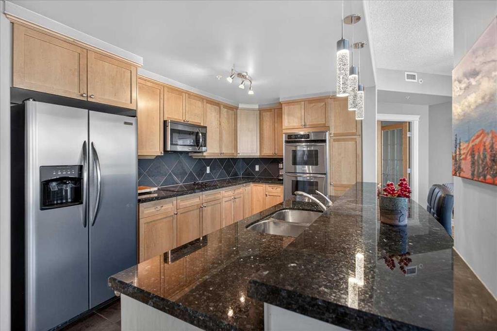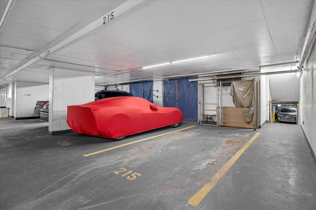 Exceptional value in this expansive 2 bedroom + den corner residence in the prestigious Emerald Stone building. Showcasing breathtaking 180-degree mountain and city views, this home is wrapped in floor-to-ceiling windows and offers two impressive balconies (22.5’ and 14’), creating an ideal indoor-outdoor living experience. Designed with both style and comfort in mind, the open-concept living space features rich hardwood and slate flooring, granite countertops, and a chef-inspired kitchen complete with a double wall oven—perfect for entertaining. The primary suite is a true sanctuary, offering a custom walk-in closet with built-ins and a spa-like ensuite highlighted by an air-jetted tub. A generous second bedroom, flexible den space, and in-suite laundry with sink and abundant storage complete this well-appointed home. Enjoy year-round comfort with central air conditioning. This unit includes two titled underground heated parking stalls and two storage units, adding exceptional convenience and value. Residents of Emerald Stone also enjoy access to a fully equipped fitness centre and an elegant social room with pool table.