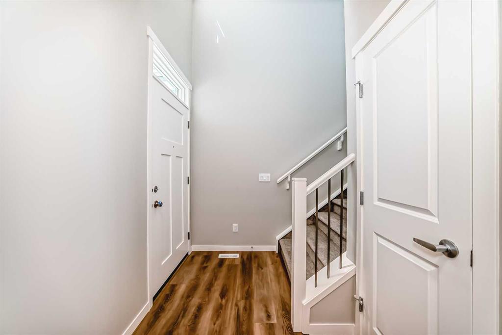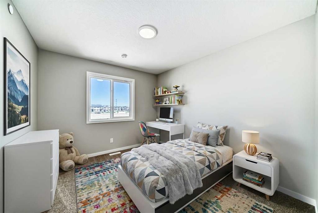 Welcome to the exquisite "Carisa" floor plan, where nearly 1,700 SqFt of thoughtfully designed space combines modern elegance with unmatched functionality. This home’s layout is tailored for both comfort and style, creating the perfect setting for family living and entertaining. As you step inside, you’ll be greeted by the warmth and durability of vinyl plank flooring that flows seamlessly throughout the main level, accentuating the modern finishes and striking architectural details. Natural light pours in through the back wall of windows, infusing the open-concept living areas with an inviting ambiance. Dual sliding patio doors extend your living space to the expansive backyard, ready for your personal touch to create the ultimate indoor-outdoor oasis. At the heart of the home, the kitchen is a chef’s dream. Featuring two-tone cabinetry, sleek quartz countertops, and a stylish tile backsplash that wraps elegantly around a chimney-style hood fan, this kitchen is as functional as it is beautiful. Stainless steel appliances and a thoughtfully positioned mudroom with direct kitchen access ensure that even grocery days are effortless. A cozy dining nook and a spacious living room, are perfectly positioned to enjoy the home’s abundant natural light. The smartly designed pocket office offers the perfect work-from-home setup or a dedicated homework space for the kids. Upstairs, a versatile bonus room serves as the ideal family retreat, separating the serene primary suite from the secondary bedrooms. The primary suite is a tranquil haven, complete with a luxurious 4-piece ensuite featuring an oversized shower and ample space to unwind. The two additional bedrooms are generously sized, making them ideal for children or guests. With an upstairs laundry room and a stylish 4-piece bathroom, convenience is woven into every detail of this home. **This home also comes complete with full front and backyard landscaping, including sod, mulch on the side yards, and trees/shrubs in the front as per community guidelines. Located in the vibrant southeast Calgary community of Hotchkiss, this home offers more than just a beautiful living space. Residents enjoy stunning mountain views, 51 acres of park space, interconnected walking paths, and a central wetland. Designed with families in mind, Hotchkiss is a community where you can truly belong and thrive.