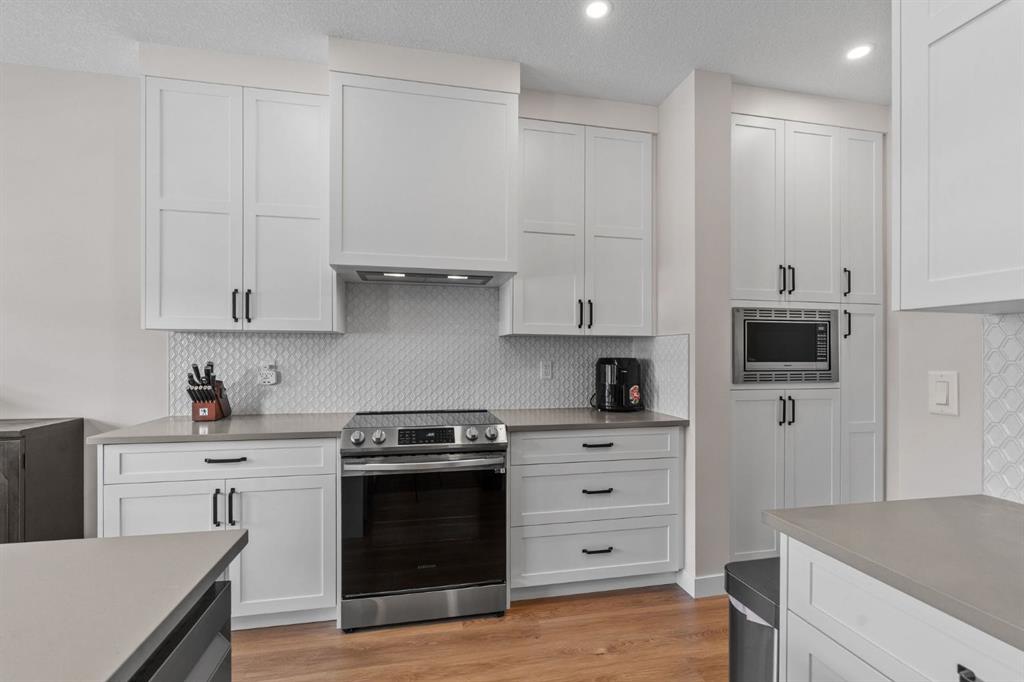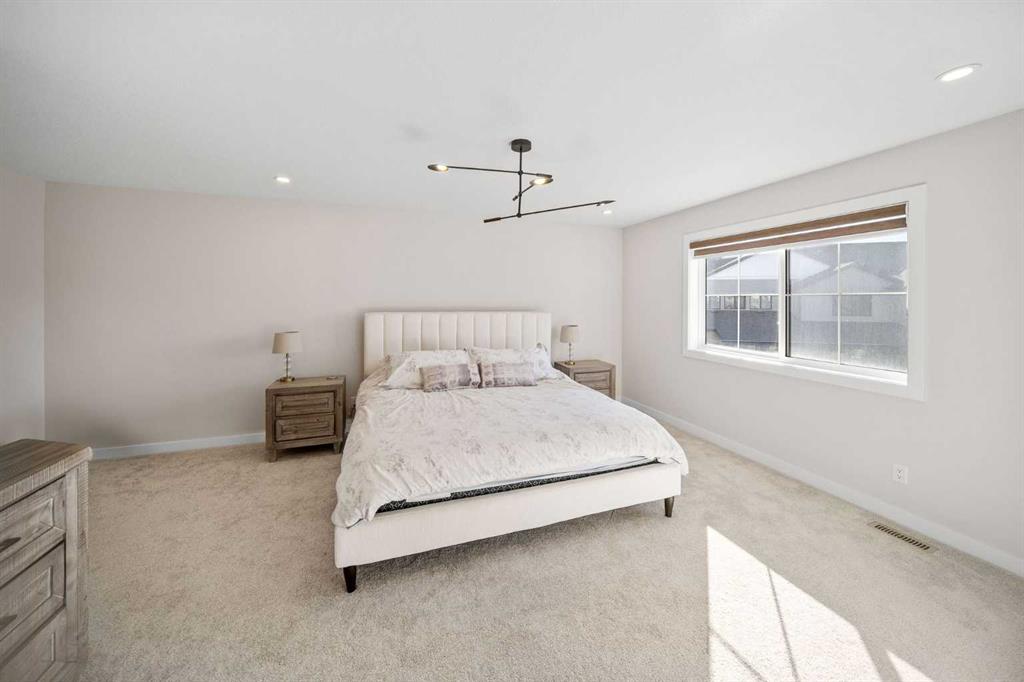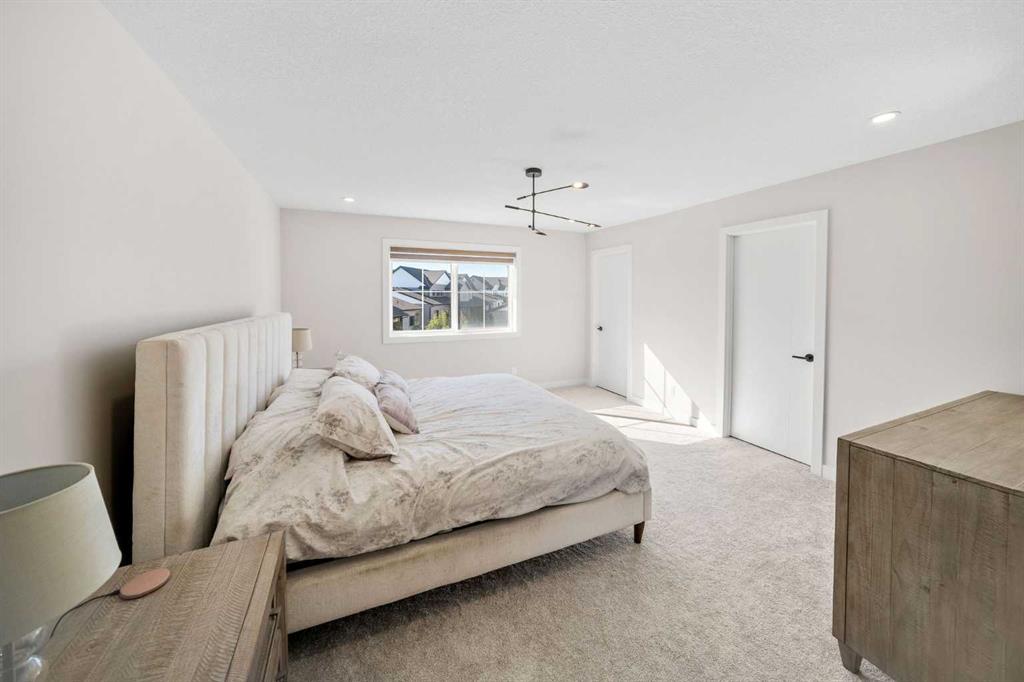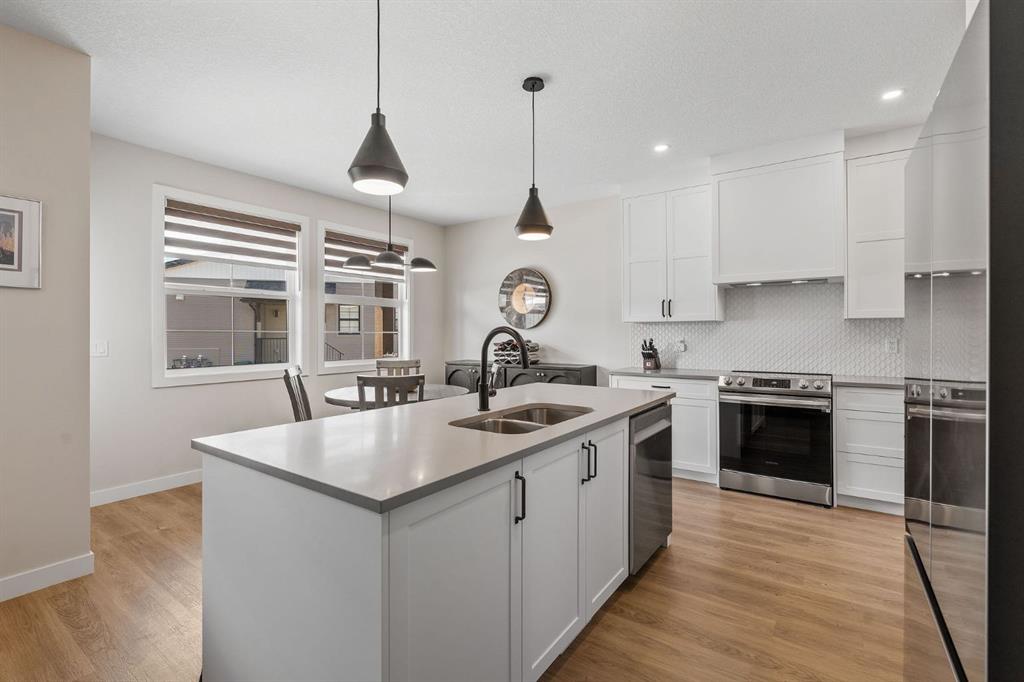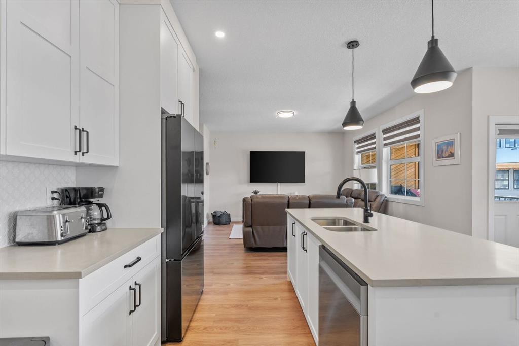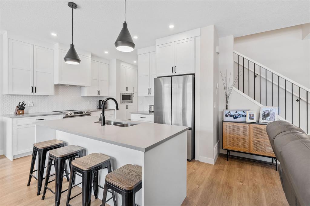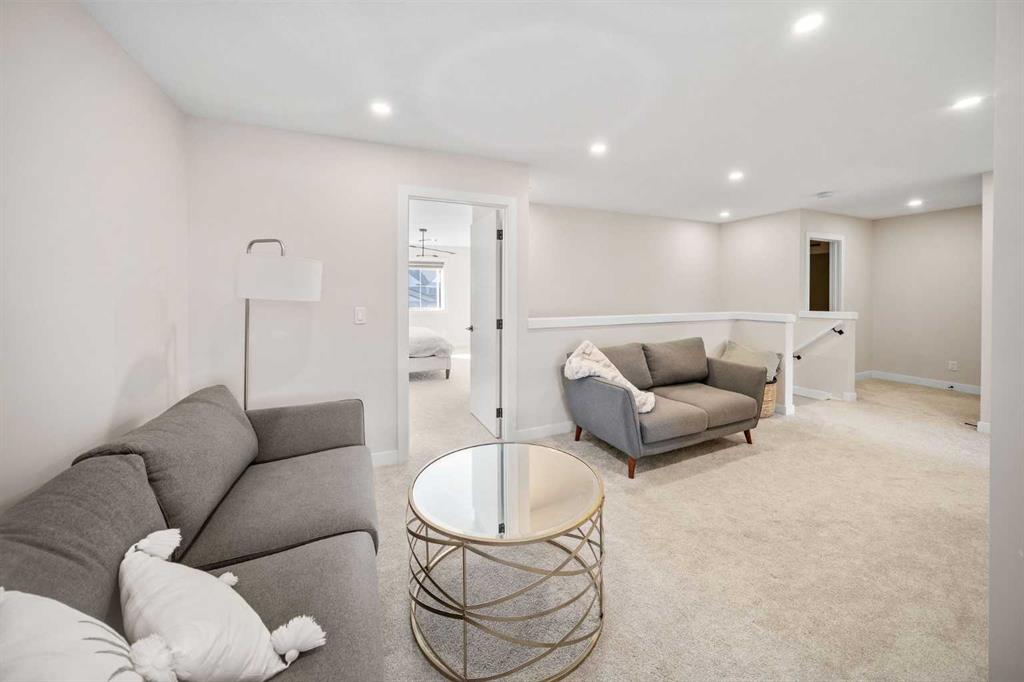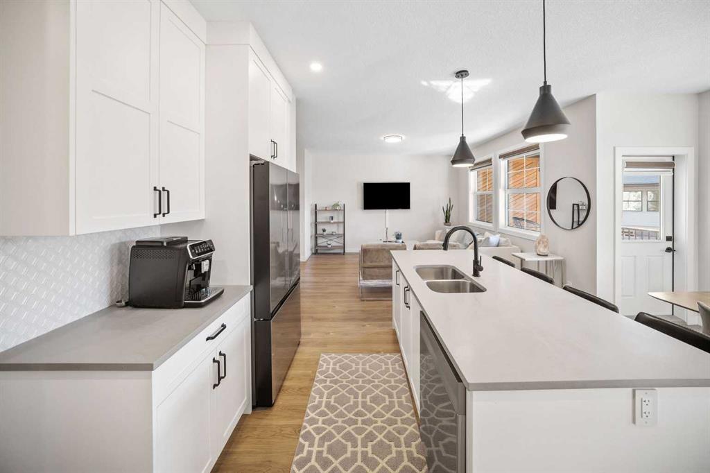This is the one. A fully finished two-storey home, steps from major shopping and set in one of Airdrie’s most desirable communities. Designed with real family living in mind, this residence offers over 2,300 sq ft of developed space, a bright south-facing backyard, double detached garage, and a fully finished basement—plenty of room to live, host, and grow. From the welcoming foyer, the open-concept main floor flows effortlessly between the living room, dining area, and kitchen. Large windows flood the space with natural light, while the south-facing deck creates the perfect setup for summer BBQs and outdoor hangouts. The kitchen is the heart of the home—functional, stylish, and built to gather. Highlights include a quartz island overlooking the living space, ceiling-height shaker cabinetry, stainless steel appliances, a built-in pantry with microwave, and upgraded lighting throughout. Upstairs, the primary suite is a true retreat with a walk-in closet and a spa-inspired 5-piece ensuite featuring dual vanities, a soaker tub, and a standalone shower. A spacious bonus room offers flexible space for movie nights, a home office, or kids’ zone. Two additional full-sized bedrooms, a 4-piece bathroom, and an upper-level laundry room complete this level. The fully finished basement adds serious value with a fourth bedroom, large recreation area, and a full 3-piece bathroom—ideal for guests, teens, or multi-generational living. Enjoy evenings on the covered, south-facing balcony with a gas line for grilling, overlooking shared green space for a calm, family-friendly vibe. Additional upgrades include 9-foot ceilings on the main floor and basement, Central air conditioning, and upgraded lighting throughout, gas line on the rear balcony. Condo fees include common area maintenance, exterior insurance, and reserve fund contributions—making life simpler and more predictable. This home delivers where it counts: space, comfort, style, and location. Solid value. Smart move. Welcome home.