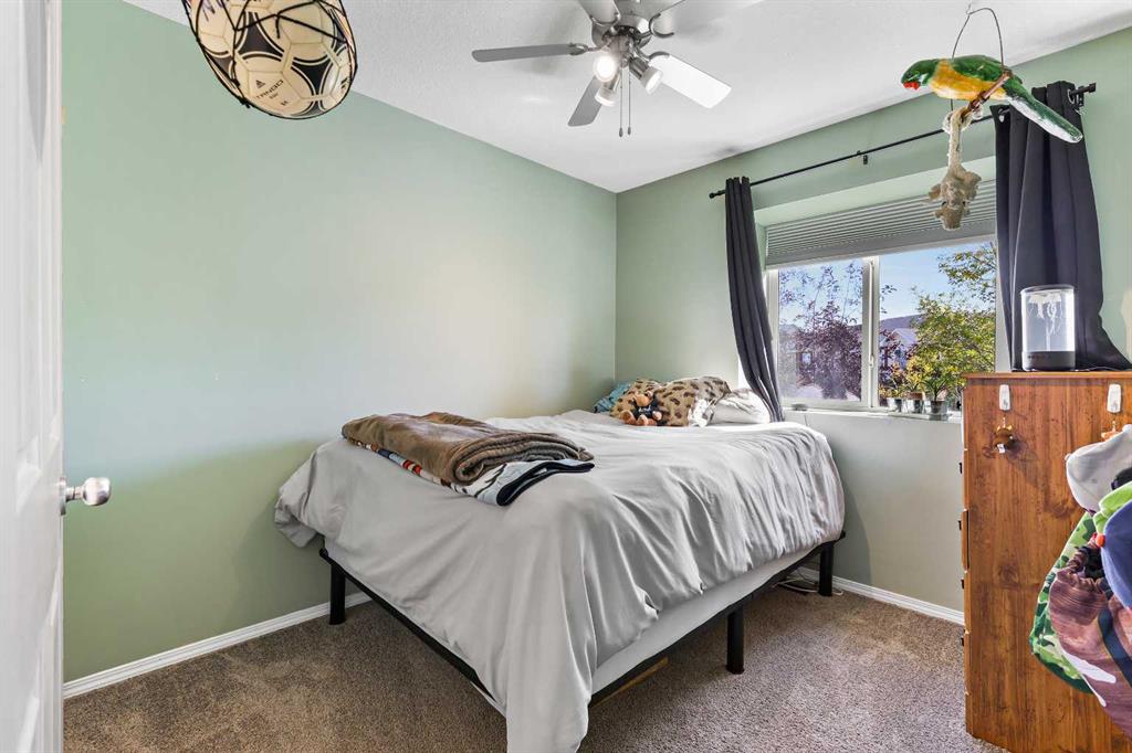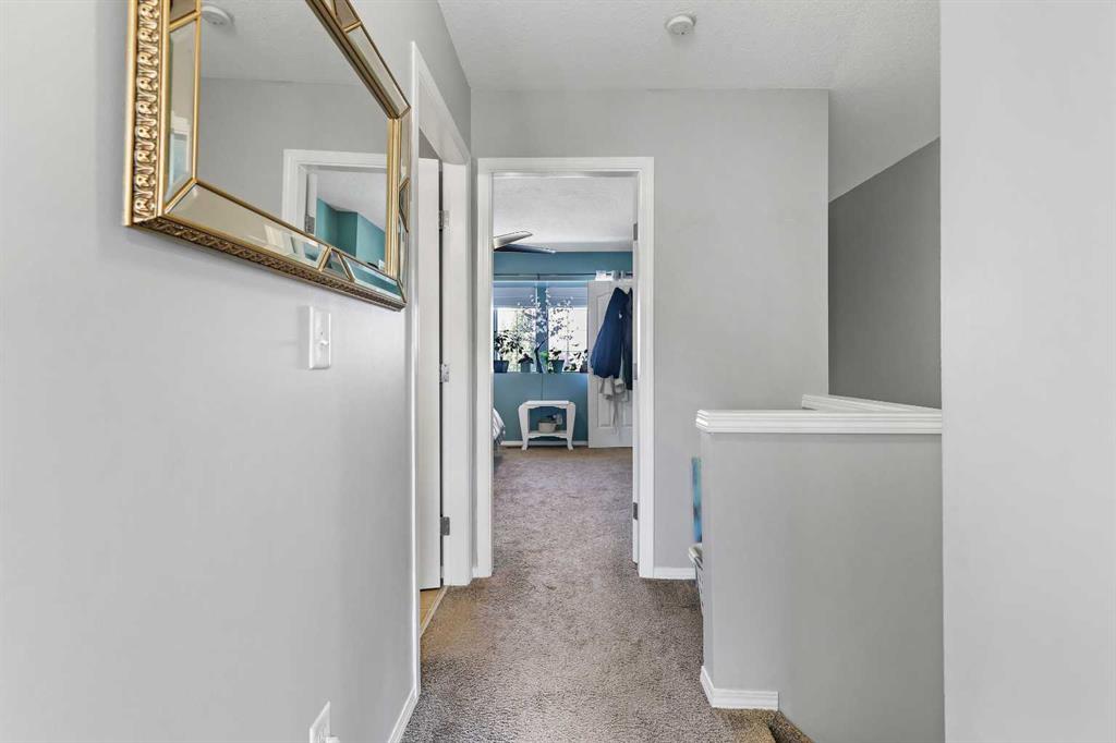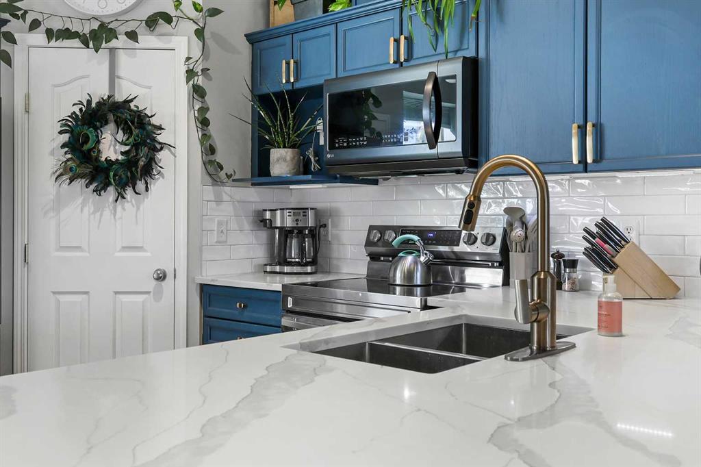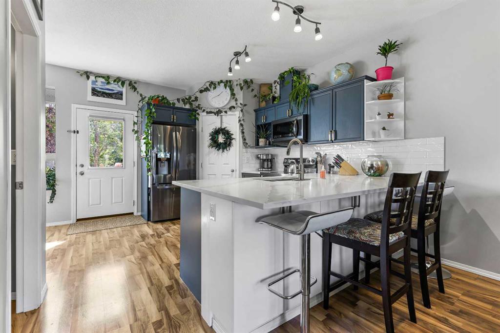 Step into stylish comfort in this beautifully maintained 3-bedroom, 2.5-bath 2-storey townhome located in the heart of family-friendly Luxstone. Boasting over 1,700 sqft of total thoughtfully designed living space with a fully finished basement, this home is the perfect fit for first-time buyers, growing families, downsizers, or savvy investors. The bright and inviting main floor features soaring 9’ ceilings, a large bay window that fills the living room with natural light, modern ceiling fans in both the living and dining areas, and rich laminate floors. The dining space opens to a sun-filled south-facing backyard with your very own private deck backing onto green space and pergola—perfect for summer barbecues or peaceful morning coffees. The refreshed kitchen is a true showstopper with striking navy blue cabinets accented by gold hardware, a sleek white tile backsplash, under-cabinet lighting, and designer granite countertops. A corner pantry, stainless steel appliances, USB-integrated outlets, and a flush eat-up island with added storage make this a modern kitchen ready for everyday function or entertaining. Upstairs, discover three generously sized bedrooms (each equipped with their own ceiling fan), the serene primary suite offers a large walk-in closet and a convenient cheater 4-pc ensuite. The finished basement provides a massive rec room, a full bathroom, separate storage room, and laundry tucked out of the way—ideal for play space, movie nights, or a home gym. Enjoy the two assigned parking stalls, with bonus street parking right in front of the townhome, and a fantastic location just steps from schools, parks, playgrounds, pathways, and everyday amenities. Peace of mind with a BRAND NEW WATER HEATER December 2025! This is your chance to own a move-in ready Airdrie townhome with charm, updates, and unbeatable value!