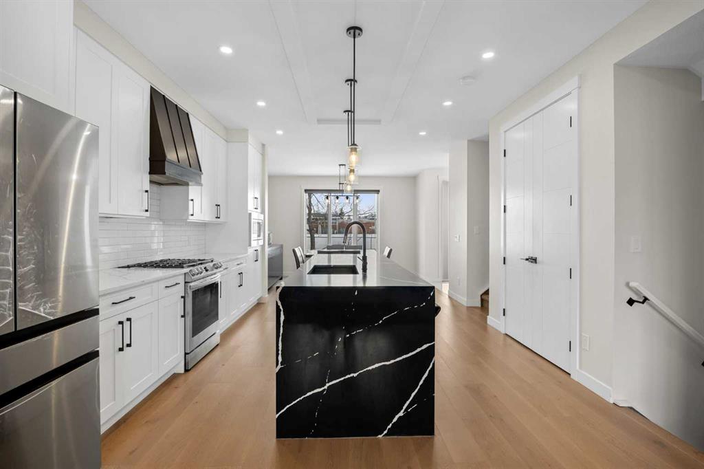 This beautiful 2-storey infill is tucked along a quiet, tree-lined street in the heart of Bowness and offers the perfect blend of style, comfort, and value. With a bright west-facing backyard and easy access to Bowness Park, schools, shops, and major routes, this home delivers everyday convenience in a family-friendly location. Step inside to a thoughtfully designed layout with 9’ ceilings on all levels, hardwood flooring, and a kitchen that truly stands out. Sleek black finishes, a striking waterfall-style quartz island, and quartz counters in every bathroom give the home a clean, modern feel. The main floor also features a spacious living room with a fireplace, a dedicated dining area, a convenient mudroom, and a 2-piece bath. Upstairs, you’ll find three comfortable bedrooms, including a generous primary suite with a large walk-in closet and a 5-piece ensuite. A full 4-piece bathroom, upper-floor laundry, and a bright bonus loft complete this level. The fully finished basement adds even more functional space with a large rec room, a stylish wet bar with an Arctic King mini fridge, a full bathroom, and a fourth bedroom—ideal for guests or extended family. Outside, the west-facing backyard is ready for year-round enjoyment with a deck, patio, BBQ area, and plenty of green space—including fresh raspberry bushes. A 6-person Cal Spas hot tub sits on a dedicated cement pad with underground electrical tied to the garage and two exterior kill switches. This home also comes loaded with thoughtful extras: • MET Blinds throughout, including three motorized blinds with remotes • Central vacuum system (Nilfisk Supreme 150 powerhead kit – hospital-grade, allergen-free) • Whirlpool Sport white washer & dryer • Oversized two-car garage with great storage A beautifully built infill with premium finishes, smart upgrades, and a fantastic location—offered at exceptional value.