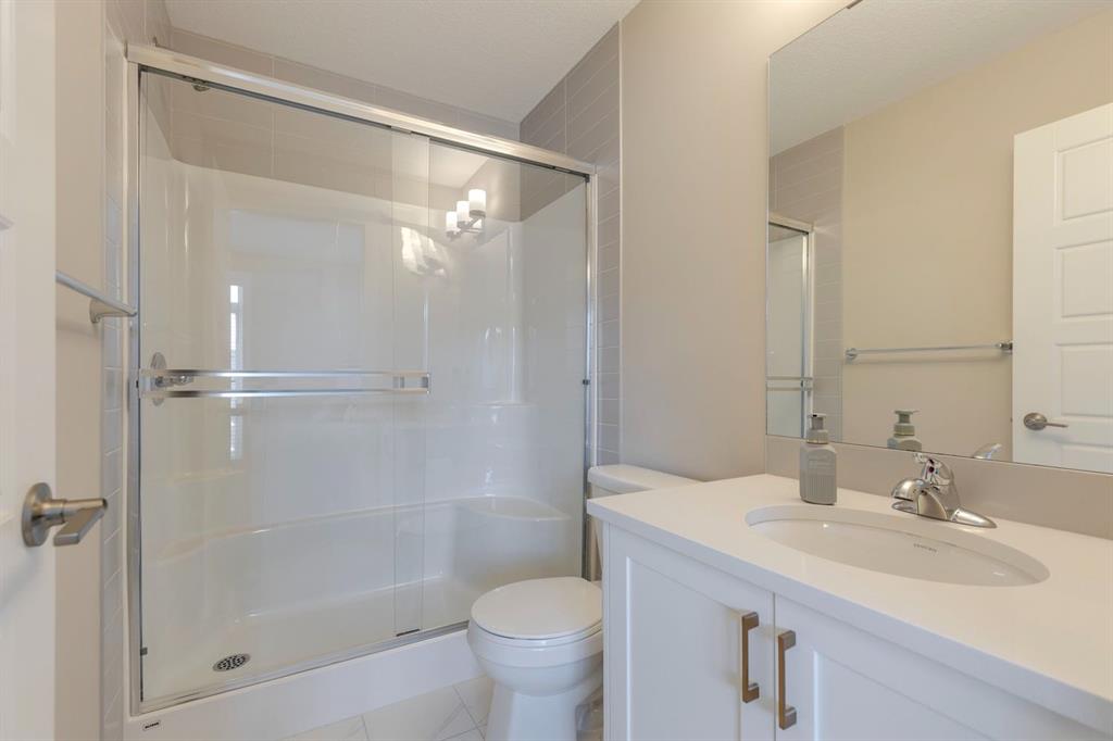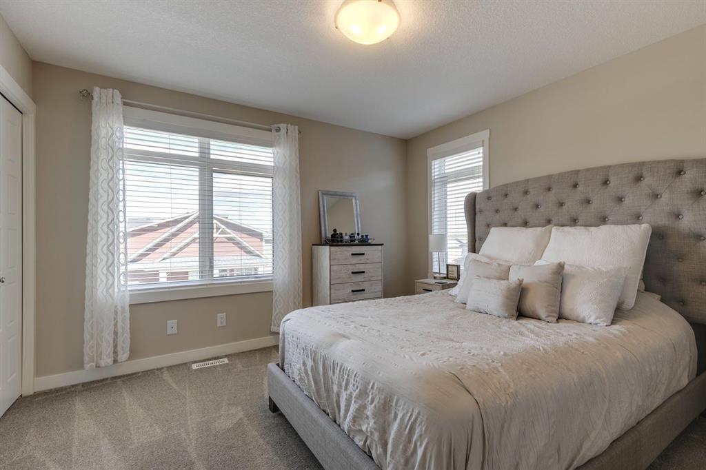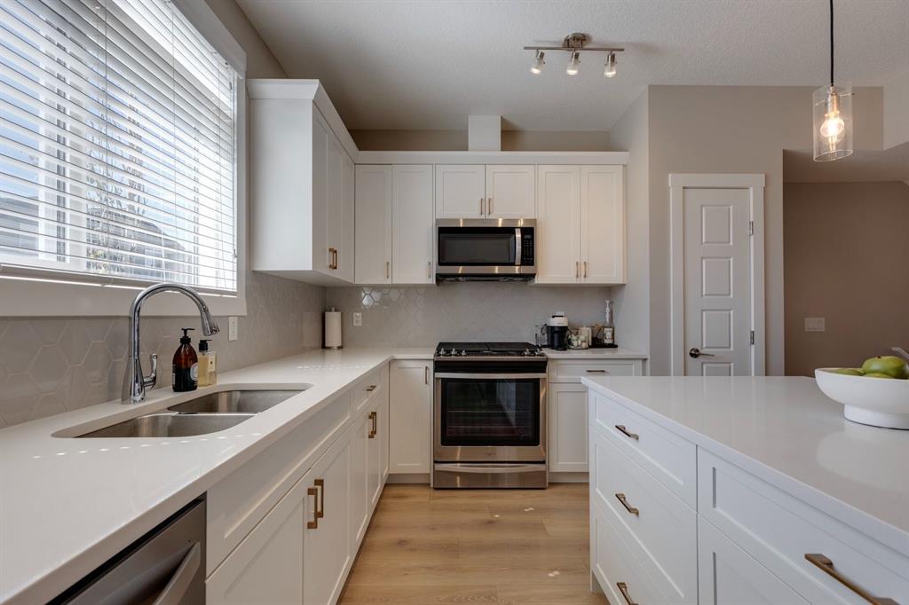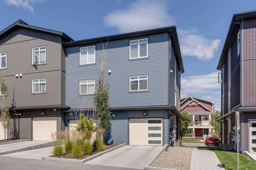 With light pouring in from every angle, this impeccably designed 2020 constructed corner-unit townhouse feels fresh, bright and instantly inviting. In collaboration with a professional designer, every finish from the classic white kitchen to the quartz countertops was thoughtfully selected for timeless style and everyday comfort. The open concept main floor offers a spacious living space with room for a desk nook for working from home, a bright dining area for weeknight meals, and plenty of space to relax together. A stylish kitchen with stainless steel appliances including a French door fridge, and a striking tile backsplash beckons you to try out new recipes. Step outside to your private balcony for your morning coffee, evening grilling, or simply enjoying the fresh air, sheltered by a privacy wall. Upstairs, both bedrooms offer double closets and private ensuites, providing comfort and convenience for guests or a roommate. Laundry is neatly tucked into the upper hallway. The attached tandem double garage provides parking plus generous storage space for seasonal gear. With 9’ ceilings on the main floor, a neutral colour palette, and meticulous upkeep, this move-in ready home feels airy and welcoming. Located just minutes from the shopping at Cross Iron Mills, as well as grocery stores, restaurants and pubs. Enjoy quick access around the city from Stoney and Deerfoot Trail. There are pathways, parks, and playgrounds nearby to explore. This home blends convenience with lifestyle and is ideal for a first-time buyer, young couple, small family or busy professional. Book your private tour and see why this is the perfect fit.