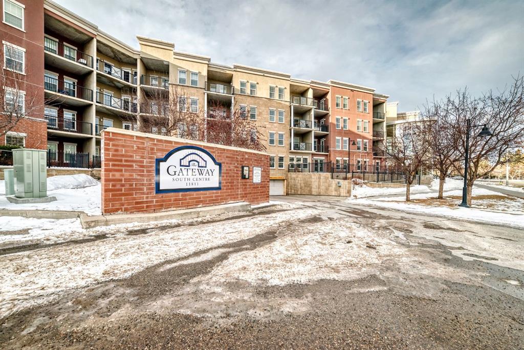 Welcome to this bright and well maintained 2 bedroom, 2 bathroom + den condo, located on the third floor of the award-winning Gateway SouthCentre, proudly named 2025 Condominium of the Year by the Canadian Condominium Institute (CCI), Southern Alberta. This sun-filled, south-facing unit overlooks the peaceful courtyard and green space and is set within a solid concrete, soundproof building. The open-concept layout showcases true pride of ownership, featuring a gourmet kitchen with stainless steel appliances, ample cabinetry, and a functional design ideal for everyday living and entertaining. The den has been thoughtfully converted into a walk-in closet, offering exceptional storage, while a separate laundry closet adds everyday convenience. Step outside to your private balcony with a gas line, perfect for a BBQ or cozy fire table, extending your living space for year-round enjoyment. This single-level home includes one titled, heated underground parking stall with a storage cage conveniently located directly in front of the stall. Residents enjoy outstanding amenities including a fitness centre, party rooms, and guest suites. Ideally located with shopping, restaurants, Fish Creek Park, bus service right outside the complex, and LRT Station nearby, this home offers an exceptional blend of comfort, quality, and convenience.