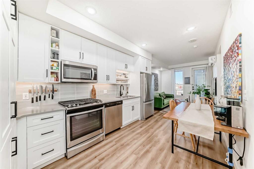 Welcome to this gorgeous 1 bed/1 bath + den unit in the heart of the University District! The unit features an open concept living space w/9' ceilings, luxury vinyl plank throughout the living space and loads of light through the large windows. The kitchen/dining features gorgeous white cabinetry, quartz counters, gas range, stainless appliances and enough space for a farm style table. The living area is great for entertaining, with mini split AC for the summer and walks out to a good sized balcony with extra storage & gas line for your BBQ., perfect for al fresco dinners The good sized primary bedroom has room for a king sized bed and amazing closet fitted with California Closet built ins. The den/office is great for those who work or study from home & also feature closet built ins. The bright 4 piece bath & in unit laundry complete the property. As well, there is one titled parking spot and an assigned storage unit, underground visitor parking, bike storage & car wash. The August in University District features a warm contemporary lobby and large common room w/kitchen, perfect for celebrating with family & friends. The building is ideally located next to the Alt Hotel by Le Germaine & Charcut restaurant, one block from the Children's Hospital, just blocks from U of C, and a quick walk to Save On, Cineplex cinemas, fitness centres, and many more restaurants & services. As well, it's close to the Bow River, Bowness Park, the Calgary Farmers Market and Winsport., and an easy jaunt out to the mountains. Book your showing today!