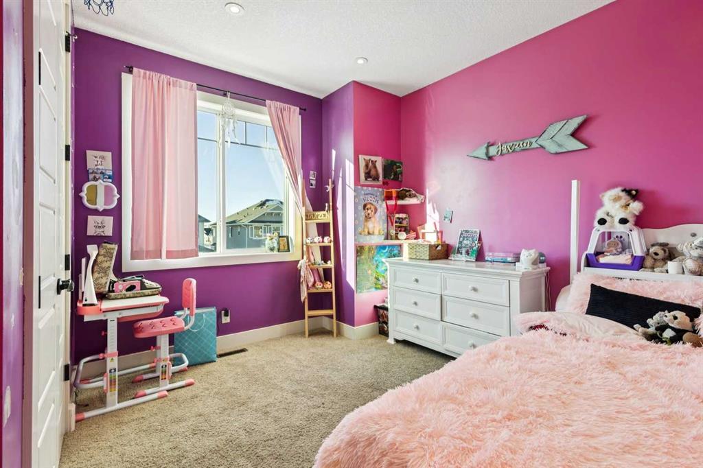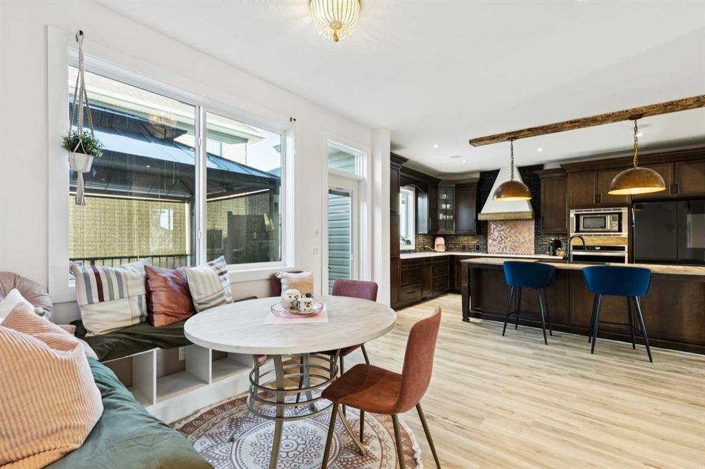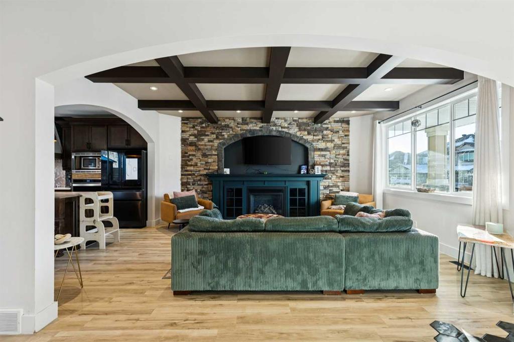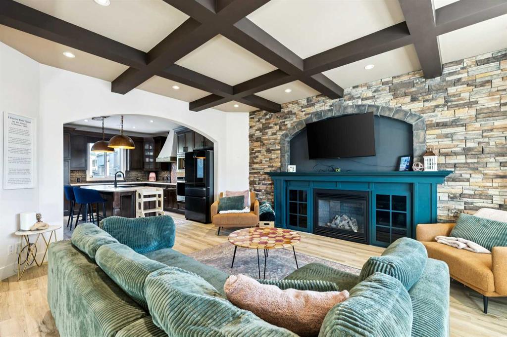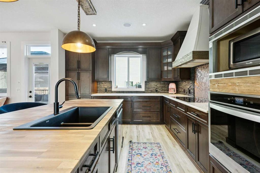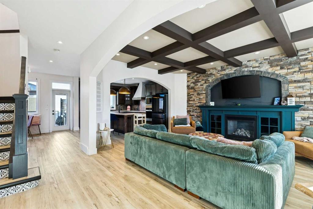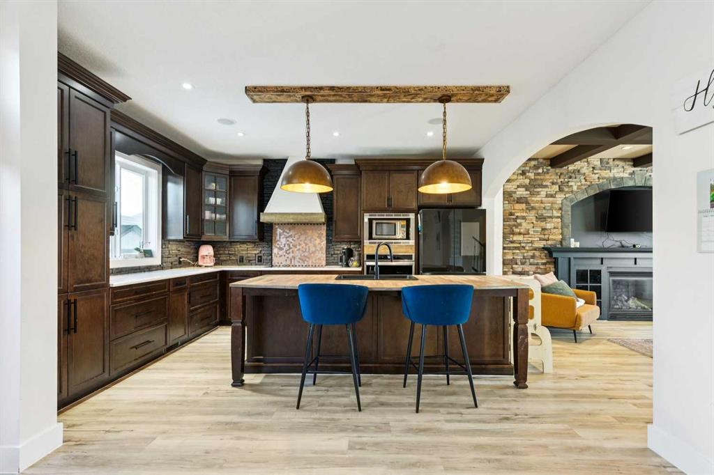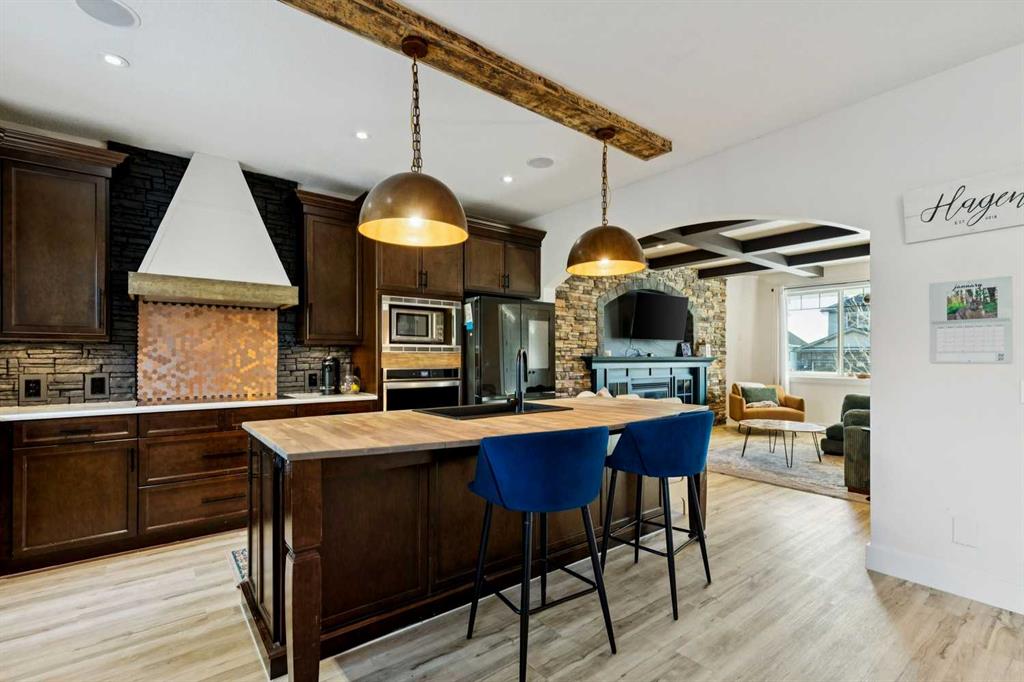 ***$24K PRICE IMPROVEMENT*** Welcome to this exceptional two-storey detached home in the highly sought-after Canals of Airdrie, offering over 2,100 sq ft of living space plus a fully self-contained carriage house(one bedroom/one bathroom/717 sq ft) above a triple car garage—perfect for multi-generational living, guests, or added flexibility. The main home features 4 bedrooms and 3 bathrooms, including a spacious main-level bedroom ideal for a home office or guest room. The entire main level is carpet-free, finished with luxury vinyl plank flooring throughout most of the home for a clean, modern feel. At the heart of the home is a gorgeous chef’s kitchen, complete with a large butcher block island, built-in oven, decorative hood fan, and stainless steel appliances—a dream setup for cooking and entertaining. The living room impresses with its beam ceiling and striking floor-to-ceiling rock fireplace wall, creating a warm and inviting space. Upstairs, retreat to the large primary bedroom (14’ x 16’) featuring a luxurious 5-piece ensuite with double sinks, a walk-in shower with bench, jacuzzi tub, and a spacious walk-in closet. The secondary bedrooms are all generously sized, making this home ideal for families. The carriage house offers its own full kitchen, living room, bedroom, and bathroom, providing incredible versatility—think grandparents, adult children, or long-term guests. Recent updates include new LVP flooring, new fridge, dishwasher, washer & dryer, new toilet in the ensuite, and a new hot water tank in the main house. Located directly across the street from the Canals, you’ll love the scenic pathways and water views, with Ralph McCall School (K–4) and C.W. Perry Middle School (5–8) nearby. Enjoy the convenience of being just a short drive to Tim Hortons, Sobeys, and other everyday amenities.