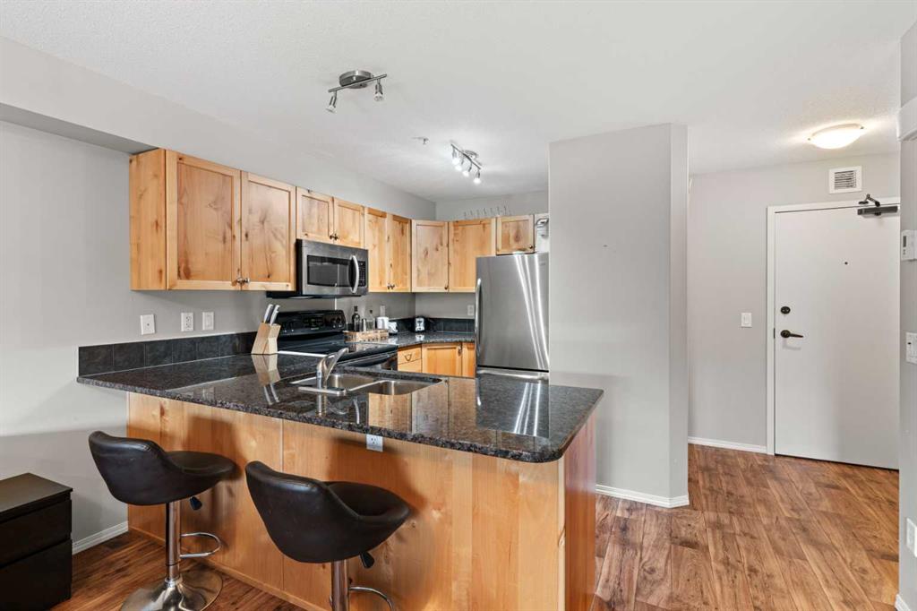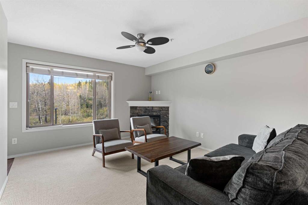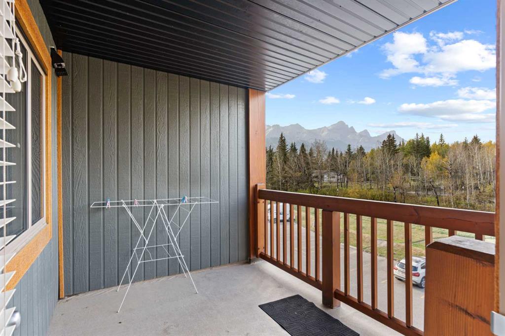 Wake up to uninterrupted mountain panoramas in this bright, refined 1-bedroom + den residence in Canmore. Elevated on the 3rd floor, the home is perfectly positioned to capture all-day natural light and sweeping Rocky Mountain views that frame every room. The gourmet kitchen, finished with granite countertops, seamlessly integrates with the dining and living areas, extending onto a private balcony where the mountains feel impossibly close. The primary bedroom enjoys the same breathtaking outlook, while the spacious den offers an ideal home office, reading room, or additional guest space. Convenience is unmatched with an outdoor parking stall steps from the entrance and an oversized 11' x 7' heated storage locker—one of the largest in the building. The community enhances your lifestyle with a fully equipped fitness centre, children’s playground, dog park, and workshop, along with direct access to scenic trails that define the Canmore experience. Secure underground parking adds an extra layer of comfort, and residents enjoy exceptional amenities including a modern fitness facility, ski and snowboard tuning room, carpentry room, and a welcoming common lounge perfect for gatherings and celebrations. This is more than a home—it’s a luxury vantage point to the Rockies and a gateway to the Canmore lifestyle.