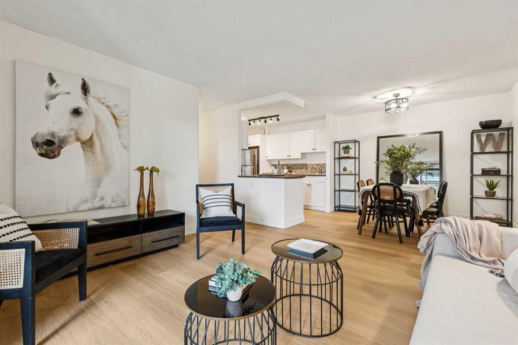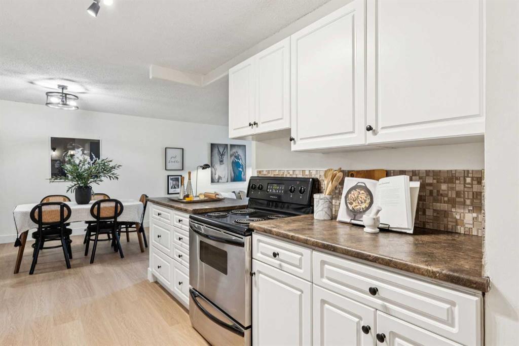 ***Seller will cover the first 3-months of condo fees***AirBnB Friendly! This beautifully updated 2-bedroom, 1-bathroom home offers a fresh and modern interior paired with thoughtful design details. Step inside to a spacious entryway featuring a board and batten feature wall that sets the tone for the rest of the home. Enjoy the warmth of south exposure and the convenience of heated underground parking. The kitchen is both functional and stylish, boasting white cabinetry with striking black hardware, stainless steel appliances, a mosaic tile backsplash, and contemporary black metal and glass light fixtures. Newly installed oak vinyl plank flooring runs seamlessly throughout the space, adding a touch of elegance. The fully renovated bathroom features a deep soaker tub with subway tile surround, ceramic tile flooring, and a sleek vanity with roll-out drawers for added storage. The entire home has been freshly painted, creating a bright, welcoming atmosphere. Enjoy two unique outdoor spaces: a cozy sunroom with a built-in reading nook and a separate balcony perfect for BBQs. Additional amenities include main floor common laundry and a secure, a large in-suite storage room and heated underground parking stall. Pet policy: weight restriction of 50kg. Move-in ready and full of charm—this is a must-see!