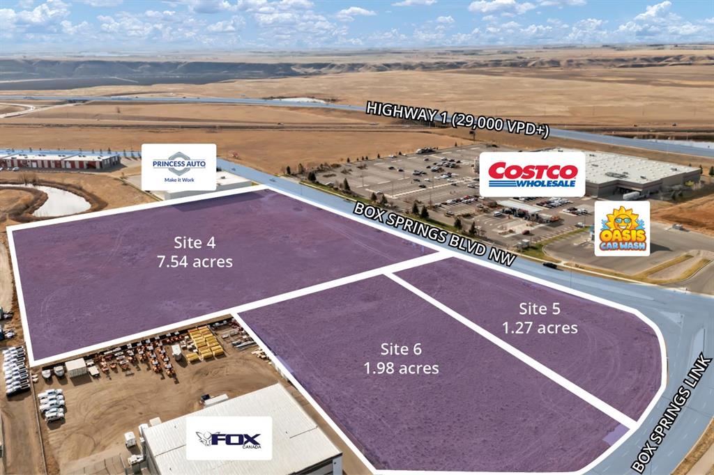 Prime commercial development opportunity in Medicine Hat’s Box Springs Business Park. This offering includes 1.27 acres, featuring flat topography, excellent sight lines, and easy access along Box Springs Blvd with direct exposure to the Trans-Canada Highway. Off-site levies are paid, with some services already in place. Located directly across from Costco and surrounded by national retailers, restaurants, hotels, and automotive/service users, the site benefits from strong daily traffic and exceptional commercial draw. Vendor financing is available (terms negotiable). An ideal location for commercial, retail, hospitality, or service-oriented development.
